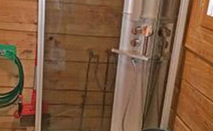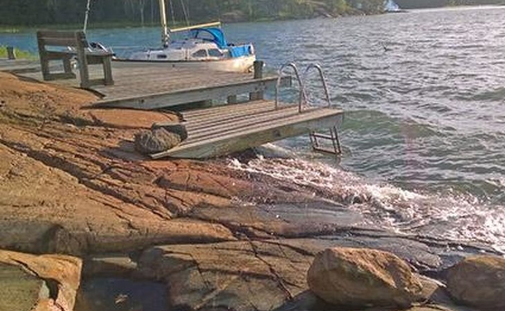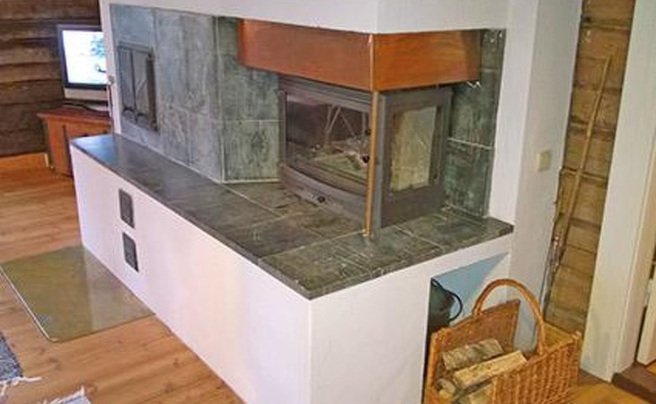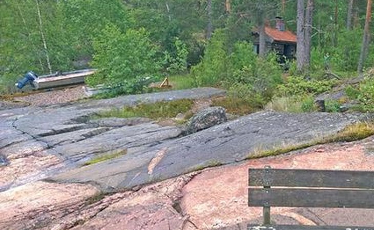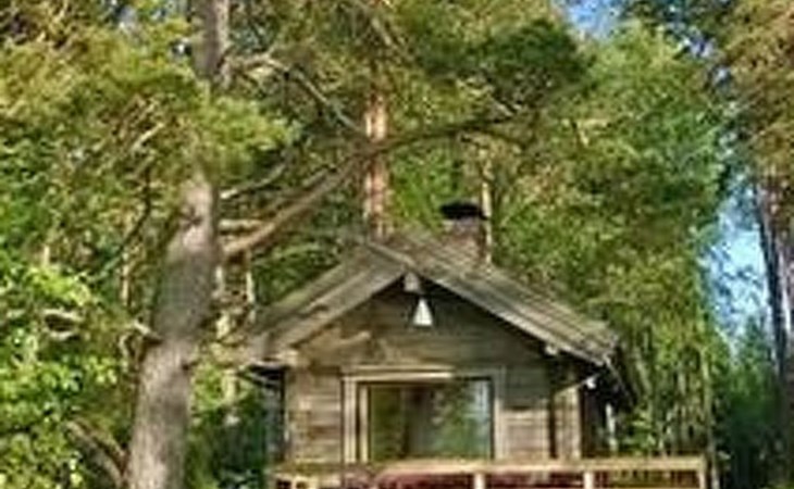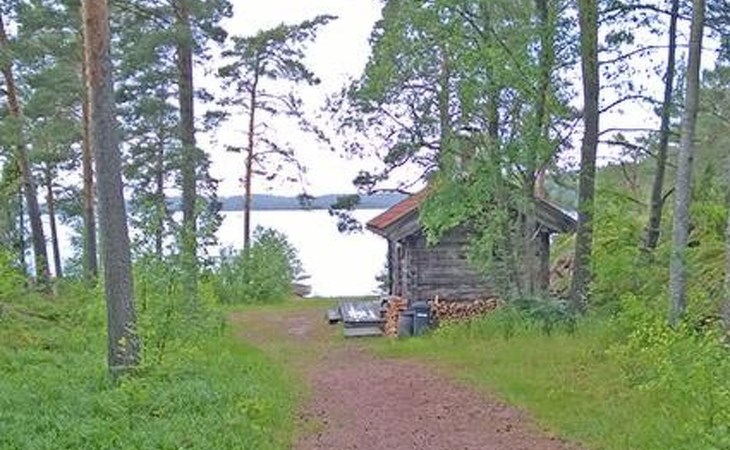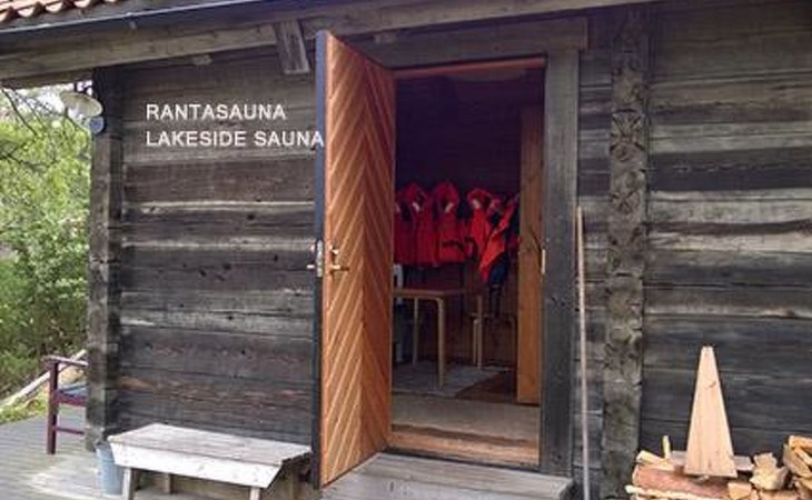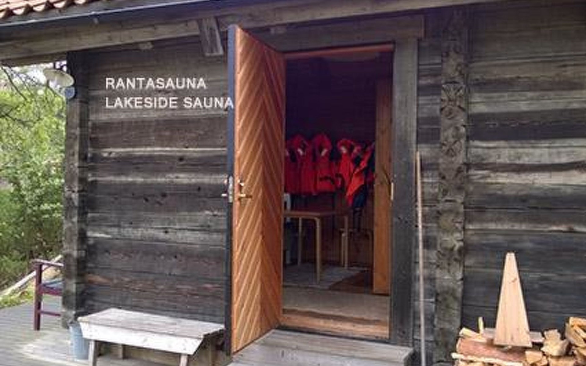 Separate seashore sauna with washroom and room with fireplace. Washing machine is in the sauna building.