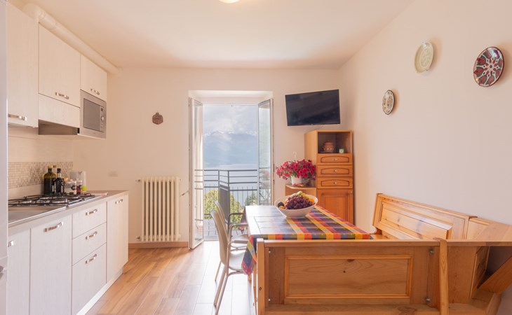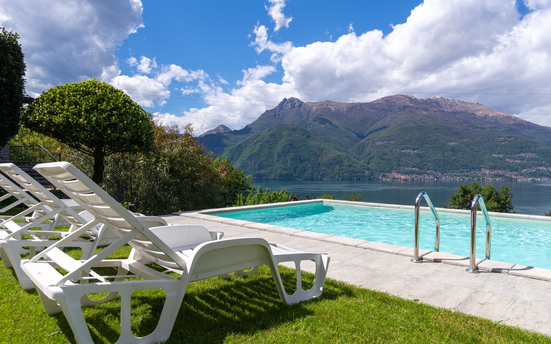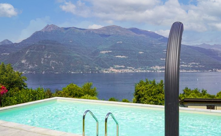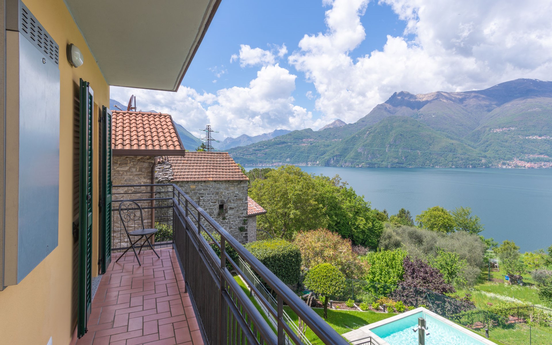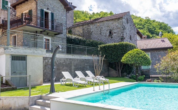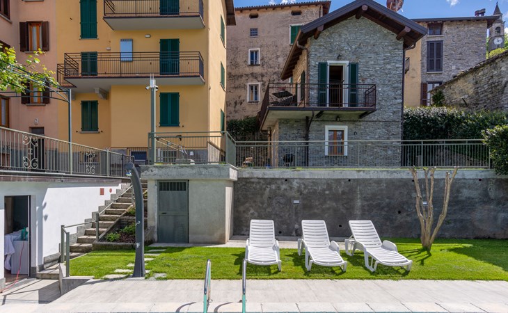 Perledo 3 km from Varenna: Residence. 2 houses in the residence. 3 apartments in the residence. In the hamlet Gittana 3.5 km from the centre of Varenna, 2.5 km from the centre of Perledo, 25 km from the centre of Lecco, 1.3 km from the lake. For shared use: garden 100 m2 with lawn, swimming pool angular (4 x 7 m, depth 100 cm, seasonal availability: 30.Apr. - 31.Oct.) with salt-electrolysis pool-cleaning system. Terrace, garden furniture, barbecue. Pool maintenance by the owner/gardener. In the house: storage room for bicycles, washing machine, tumble dryer (for shared use). 2.5 km long narrow motor access (mountain road). 20 m footpath (15 steps) to the house. Public parking 20 m. Shop 2.5 km, supermarket 3.5 km, bus stop "Perledo" 2.8 km, railway station "Varenna" 3.5 km, pebble beach "Lido di Gittana" 1.3 km (small), grass beach "Bellano" 3.5 km. Golf course (18 hole) 12 km, walking paths from the house 100 m. Hiking paths: Sentiero del Viandante.