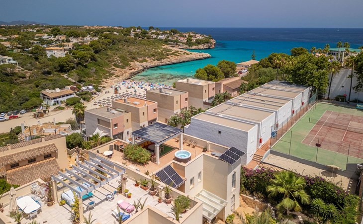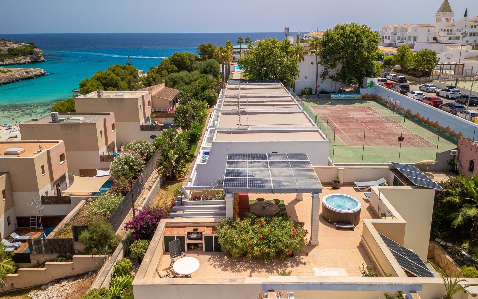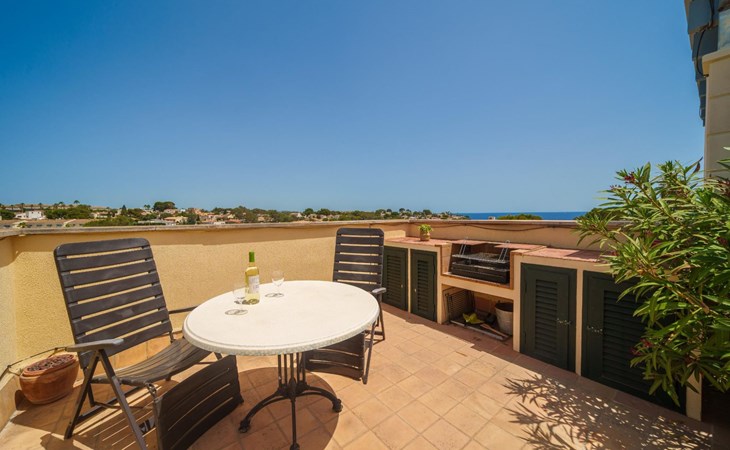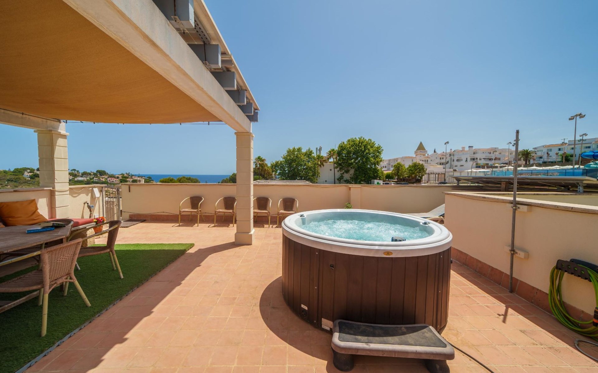 Residence "Penthouse Las Palmeras". 3 houses in the residence. 12 apartments in the residence. In the resort Porto Cristo Novo, 4 km from the centre of Porto Cristo, 16 km from the centre of Manacor, in a central, busy position, 200 m from the sea, 200 m from the beach. For shared use: property (fenced), terraced garden with plants and trees, swimming pool (14 x 6 m, seasonal availability: 01.Jan. - 31.Dec.). Outdoor shower. Private: hot tub, terrace (110 m2), garden furniture, barbecue. In the house: roof terrace. Stepped path to the house. Roofed, parking. Shop, grocery, supermarket 300 m, restaurant 60 m, bus stop 3.5 km, sandy beach "Cala Mendia" 200 m.