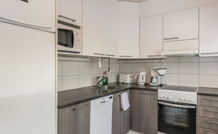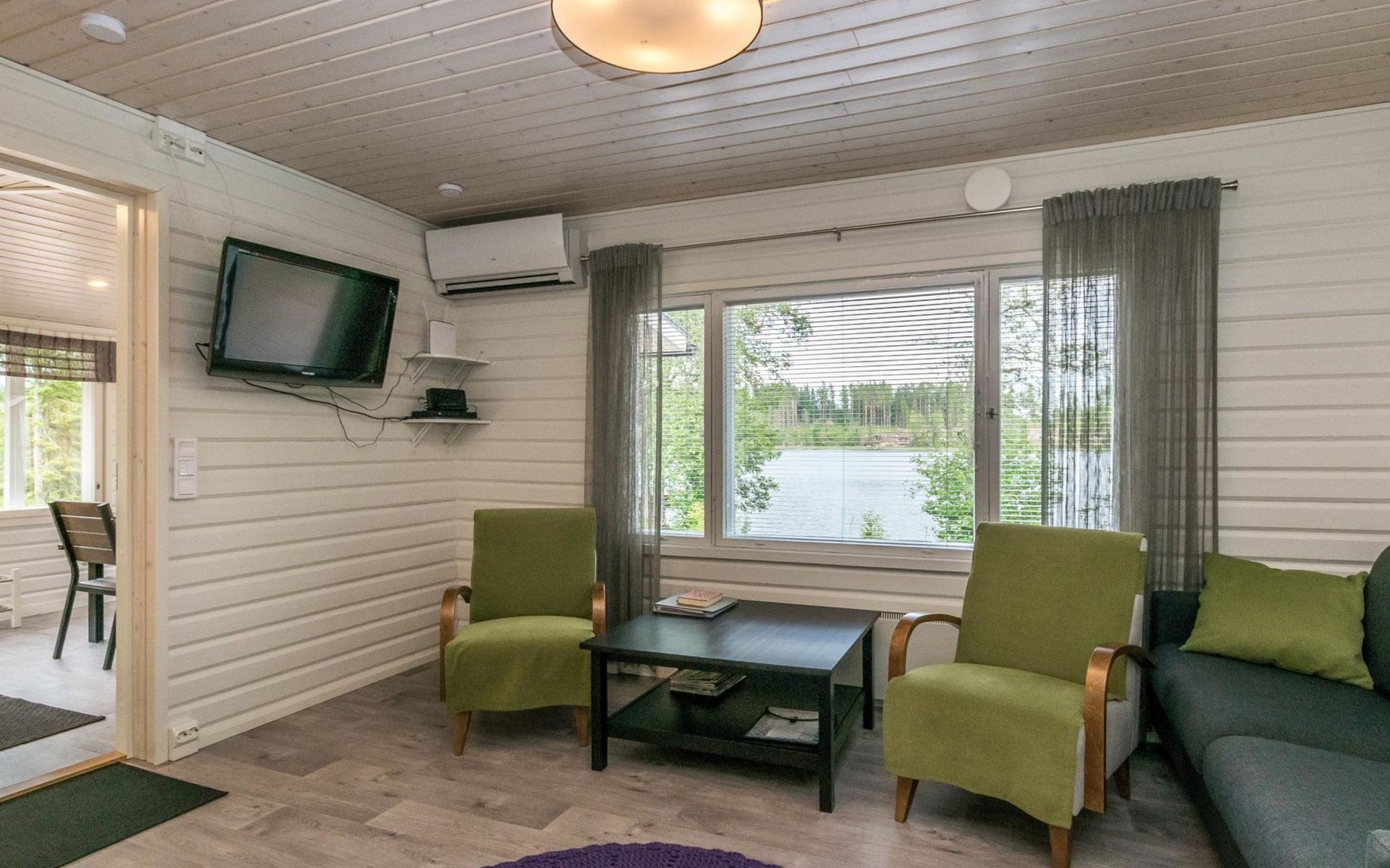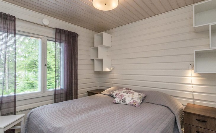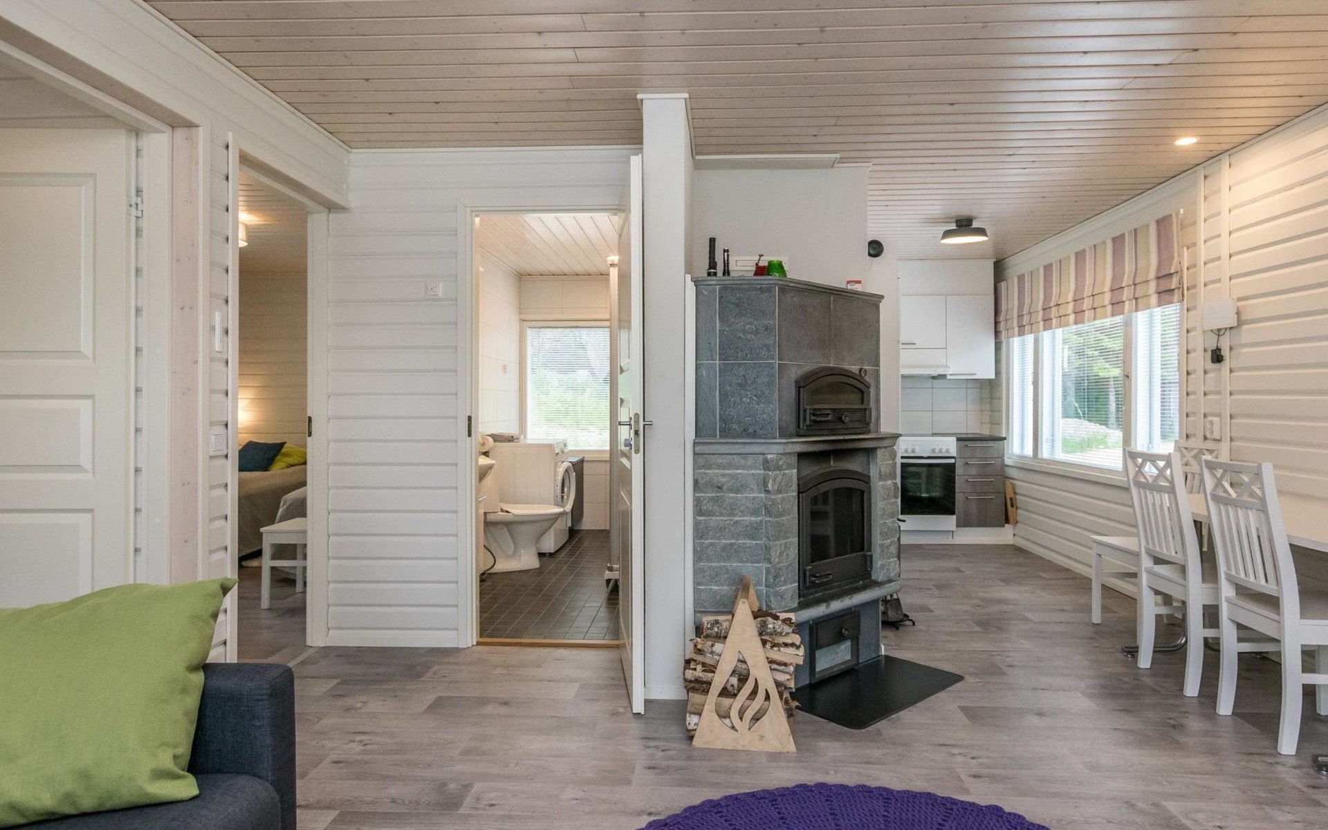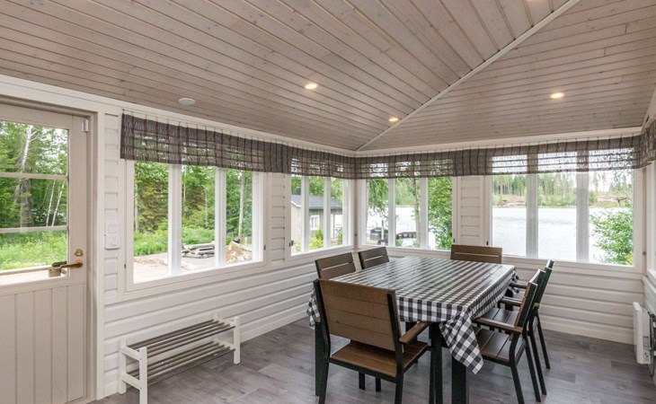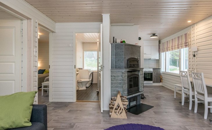 A log cottage 1964, renovated 2016, kitchen-living room sofa bed for one, bedroom with two beds, bedroom with two beds, utility room / bathroom, dining room / veranda (15 m²).