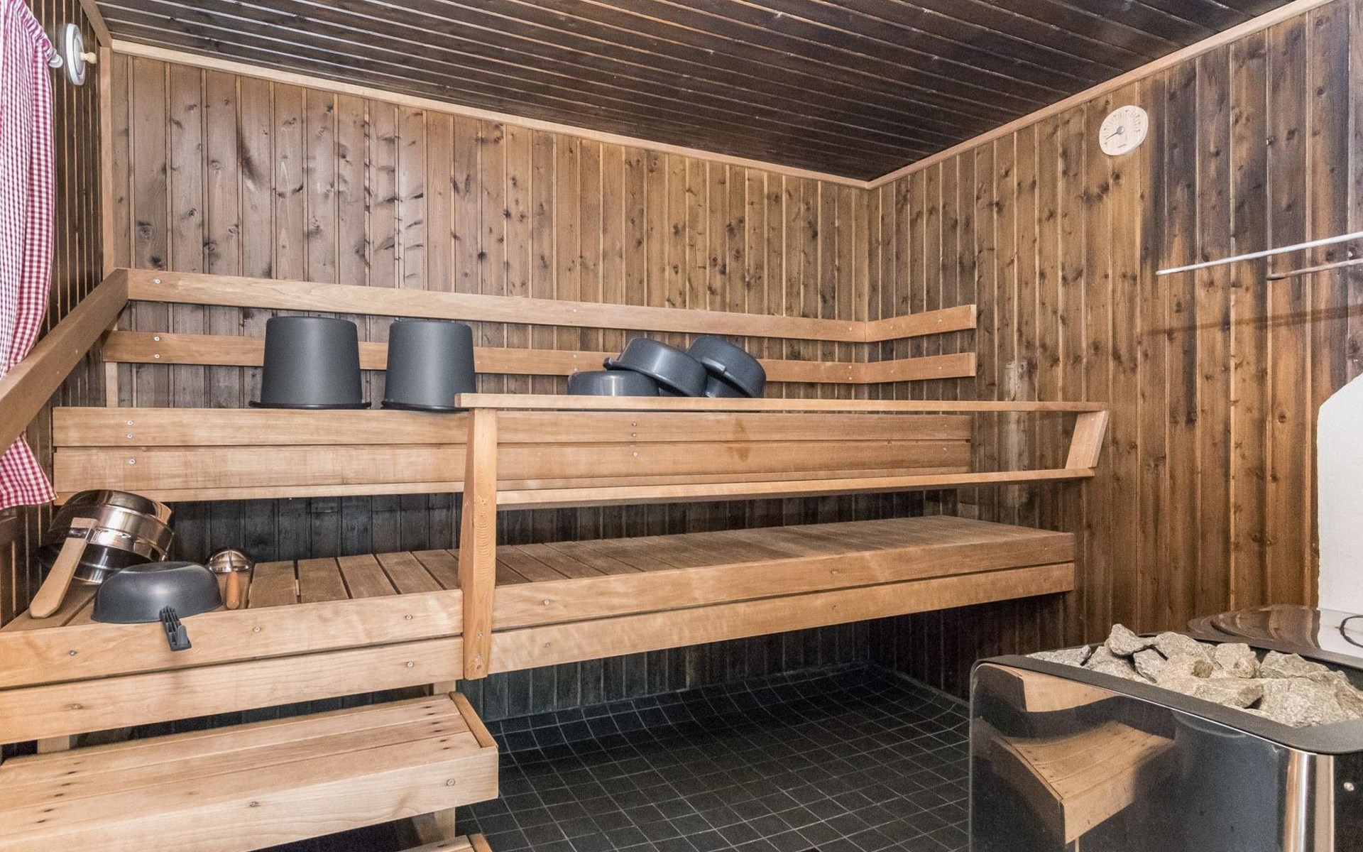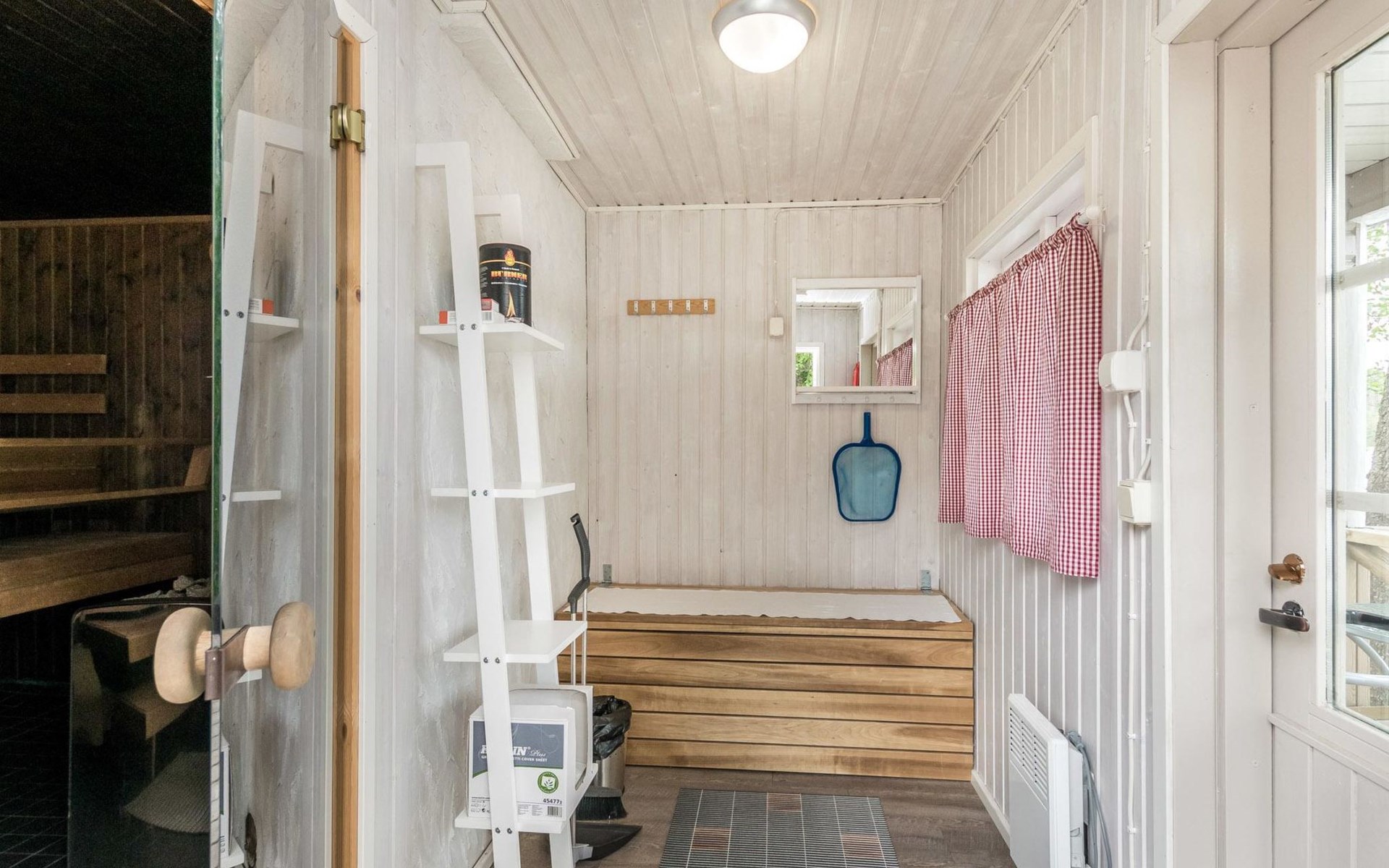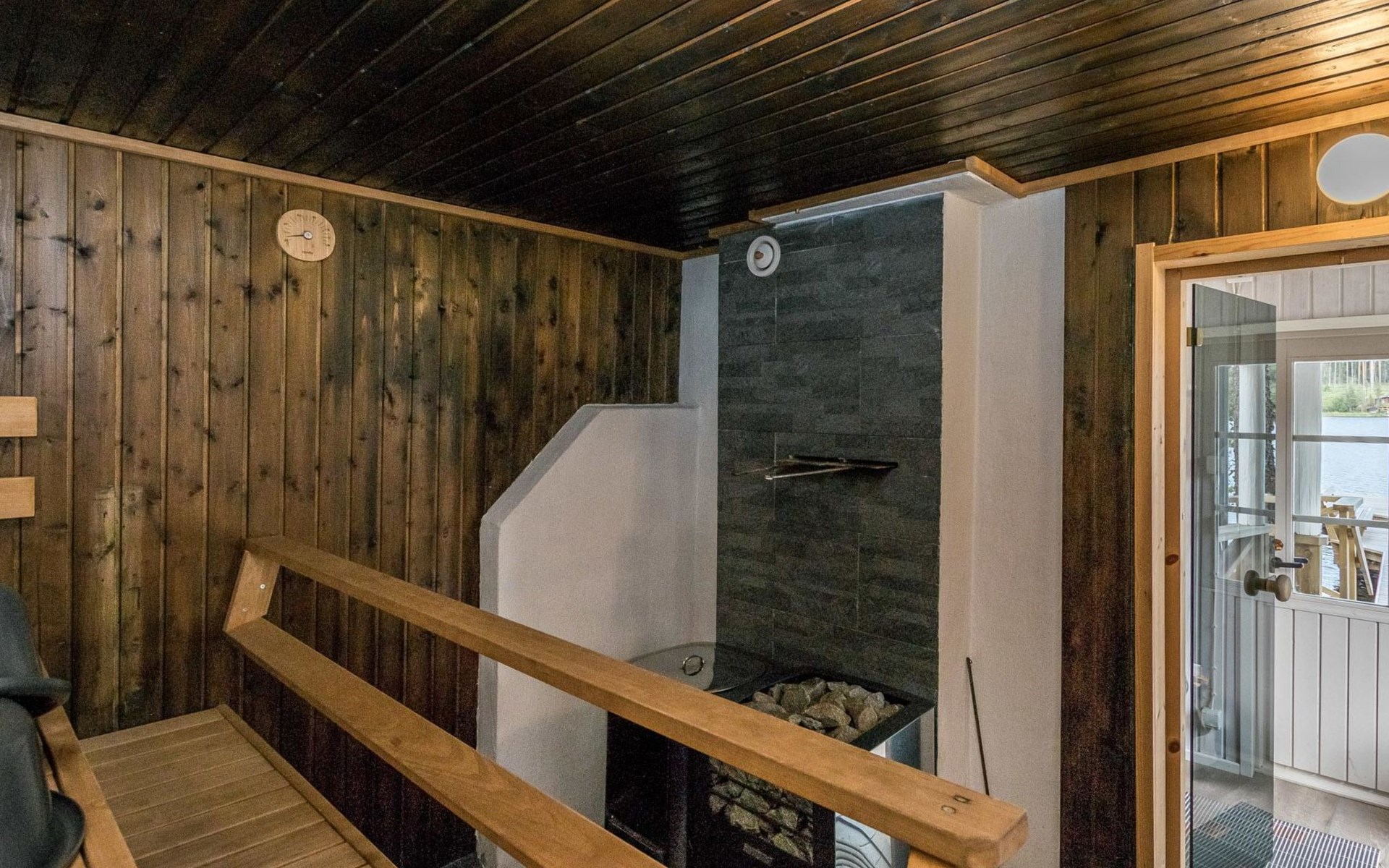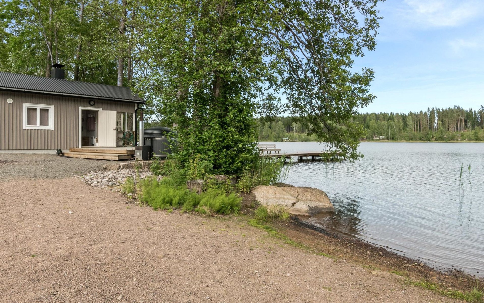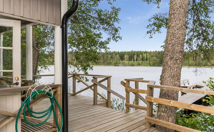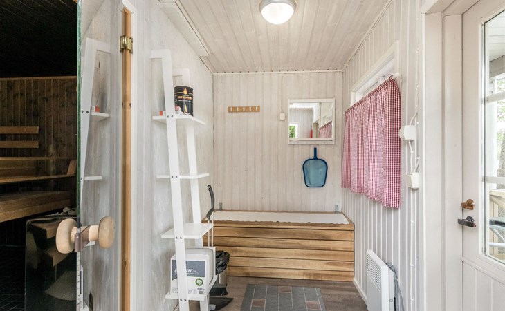 For summer use only: Lakeshore sauna built in 1964, 15 m², wood-burning stove and hot water cauldron, dressing room, electric light and radiator, carrying water from the lake 5 m away, terrace 20 m². Wood-burning hot tub at extra fee; can be used starting from 1.5. (first of May) till 30.10. (end of October) every year. The hot tub cannot be used at other months. Warming and emptying of the hot tub by the client. Owner will fill hot tub before reservation and clean it after reservation. Afterwards reservation of the hot tube 140e.