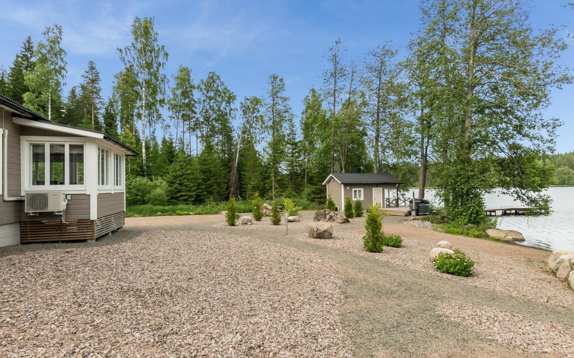 There is a extensive garden area with big stones, gravel, sand, crushed stone, plants, no lawn.