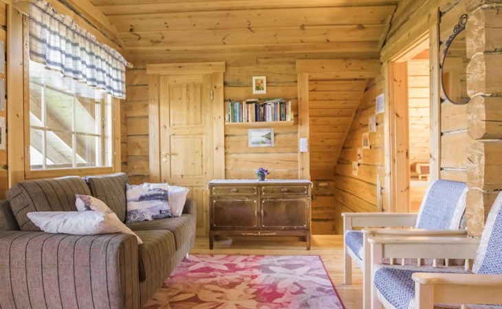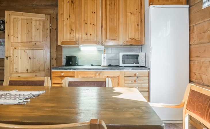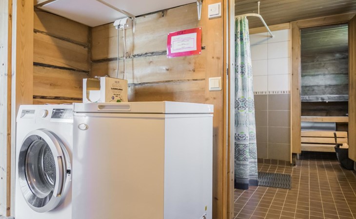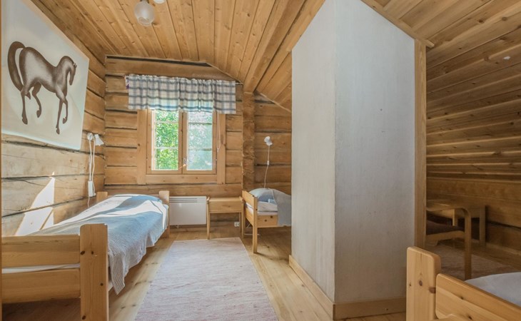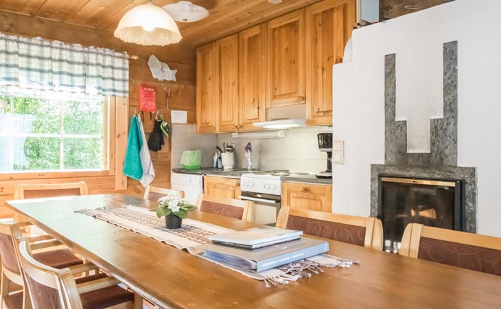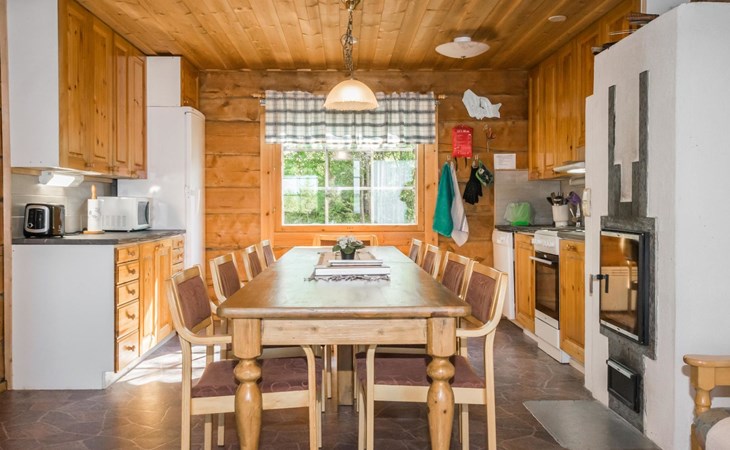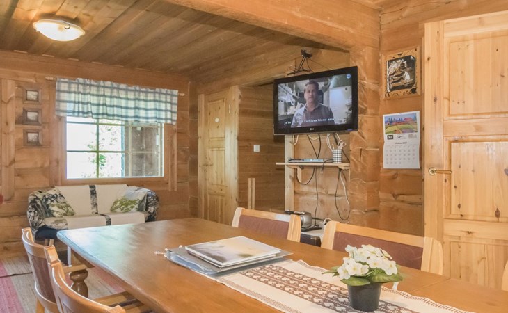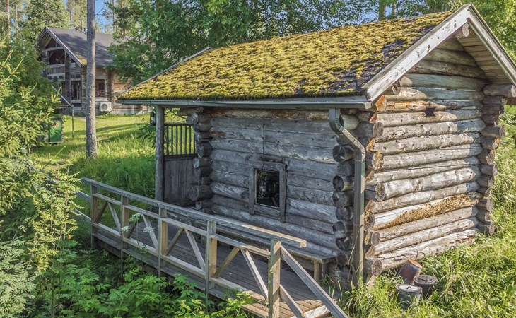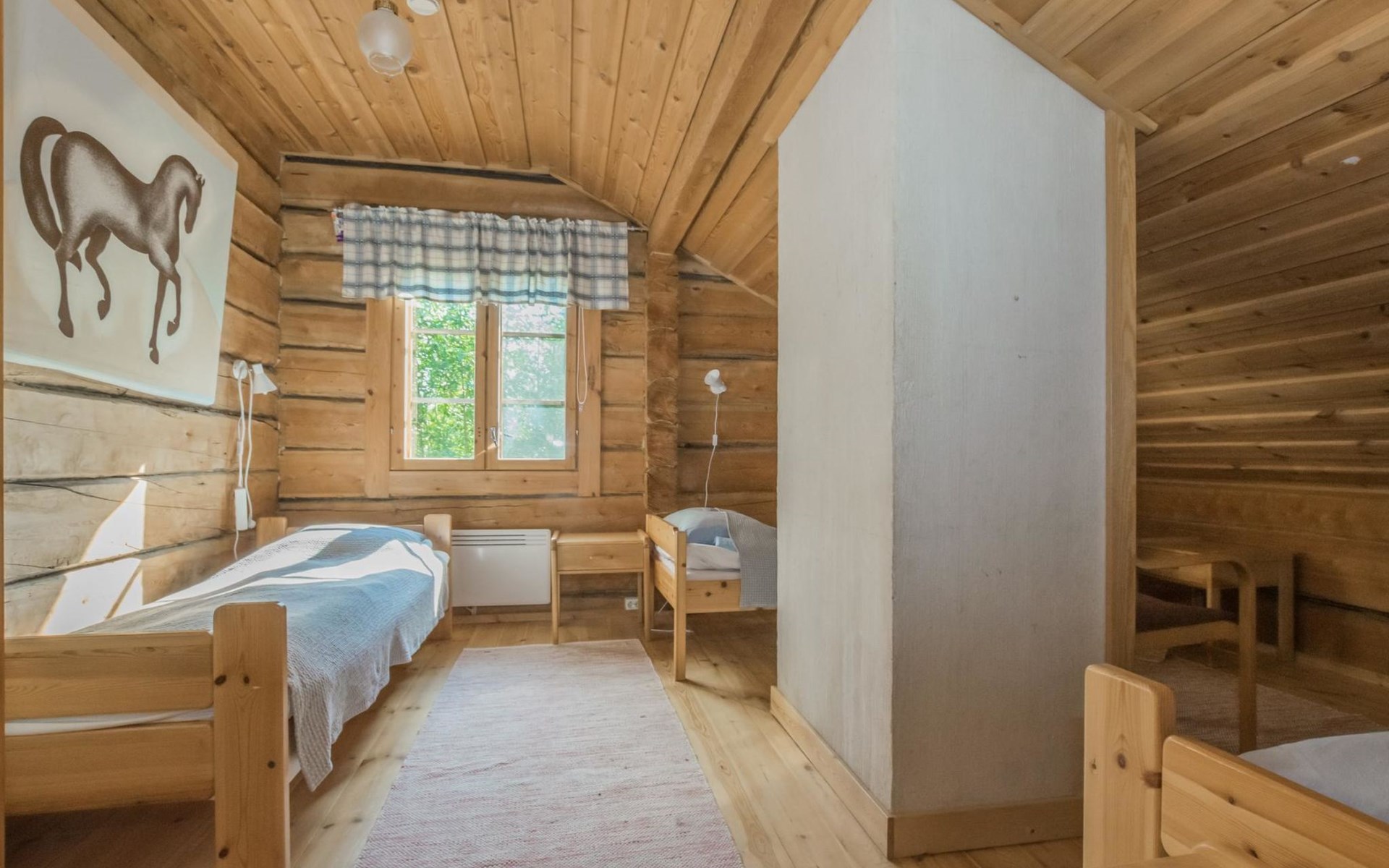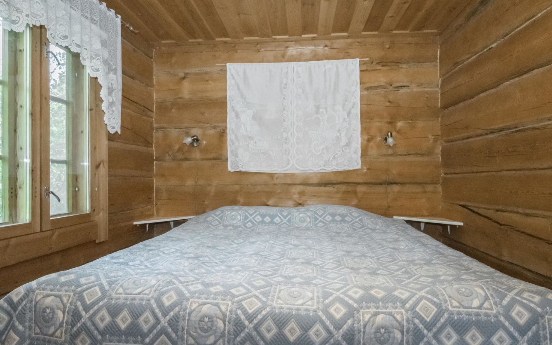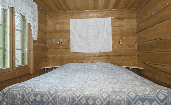 The two-storey log chalet 1994, on the ground floor a large kitchen-living room, bedroom with double bed and a cot, bathroom, dressing room, sauna, separate toilet and a terrace.