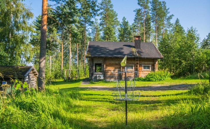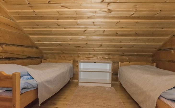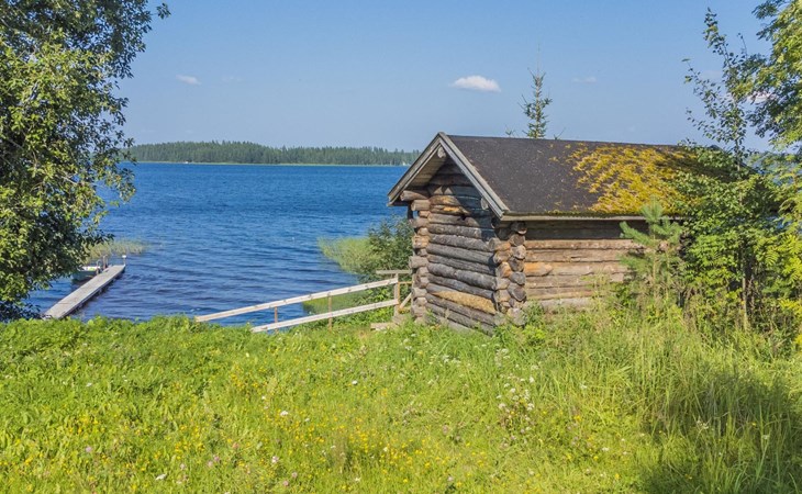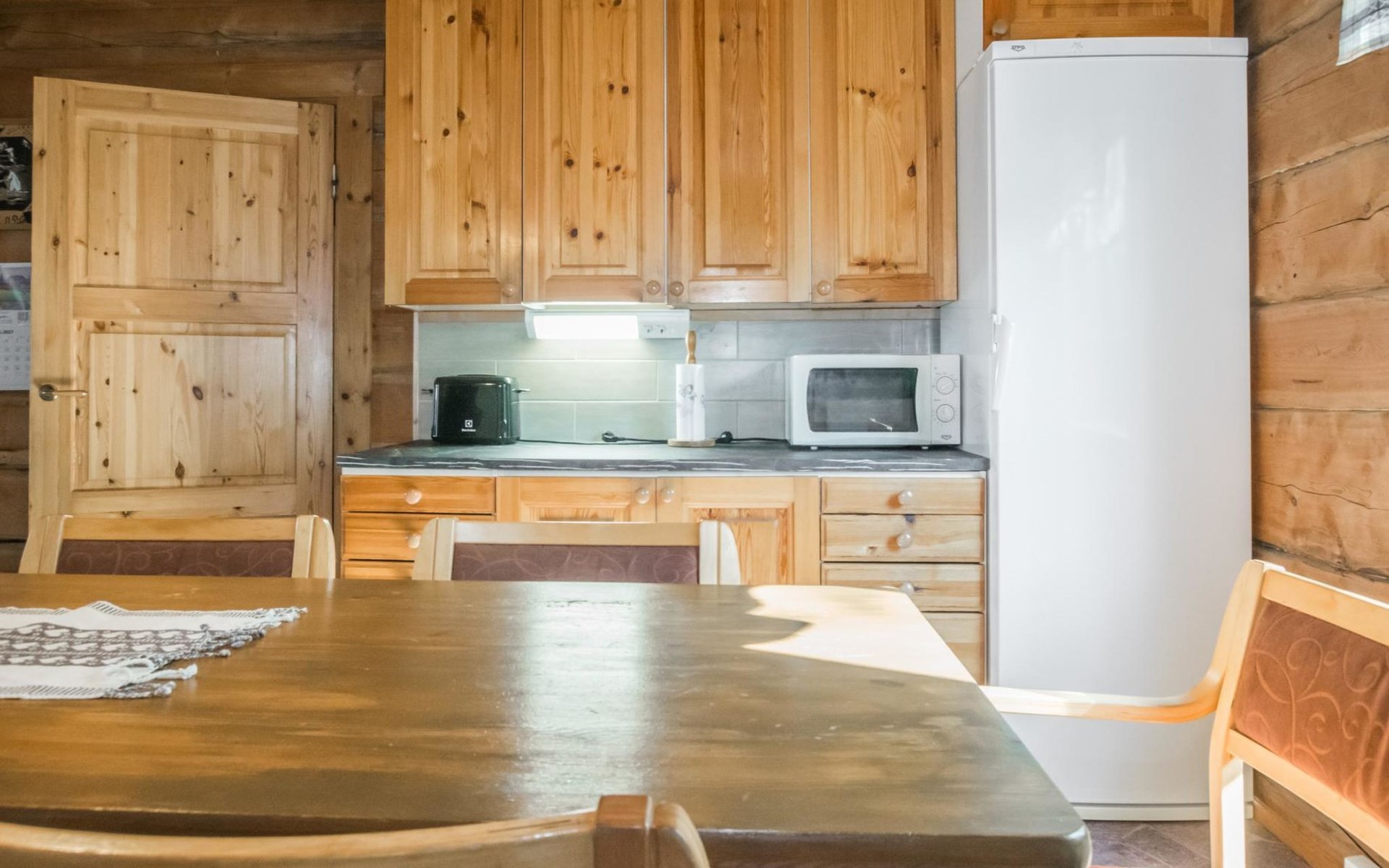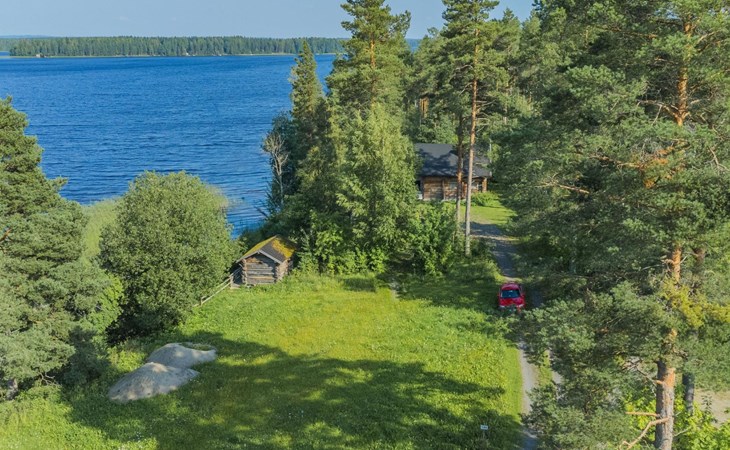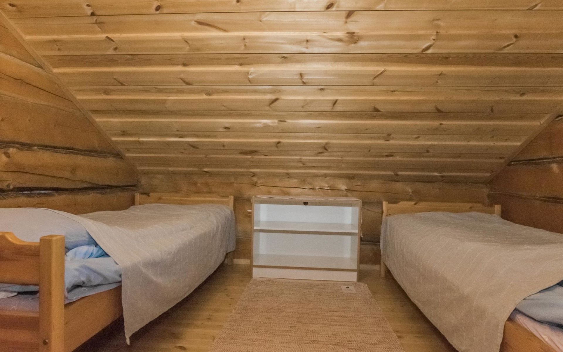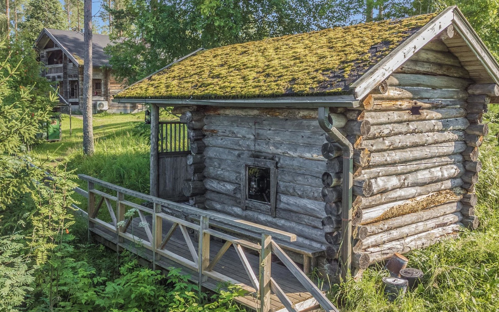 The two-storey log chalet 1994, on the ground floor a large kitchen-living room, bedroom with double bed and a cot, bathroom, dressing room, sauna, separate toilet and a terrace.