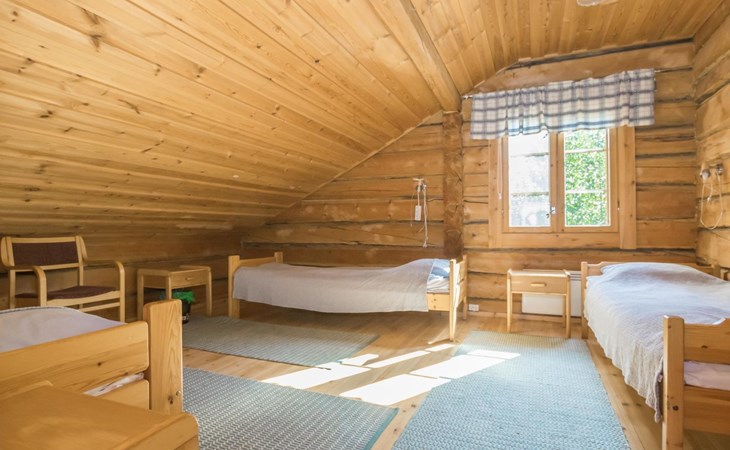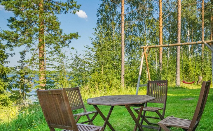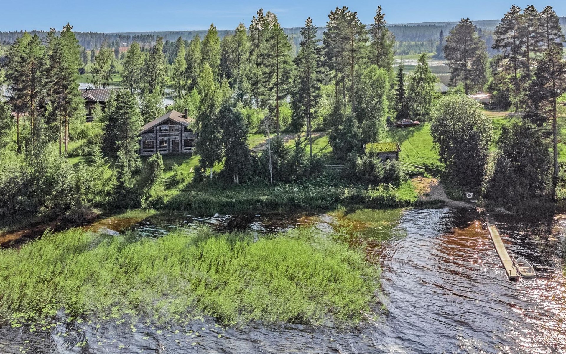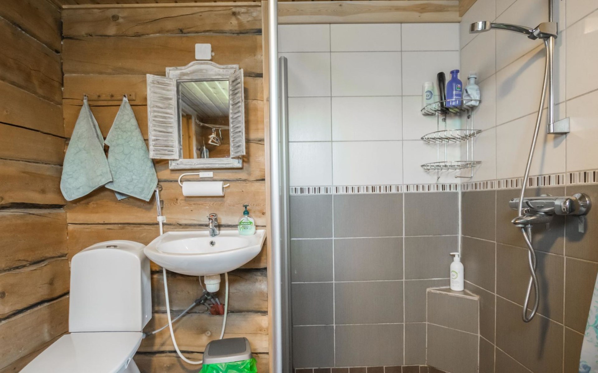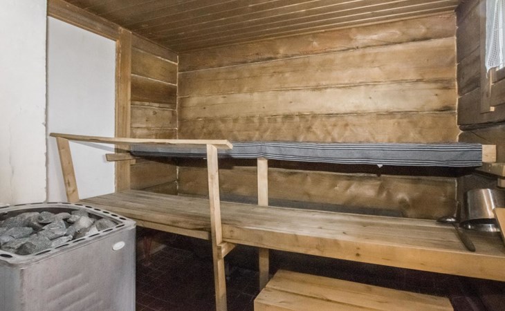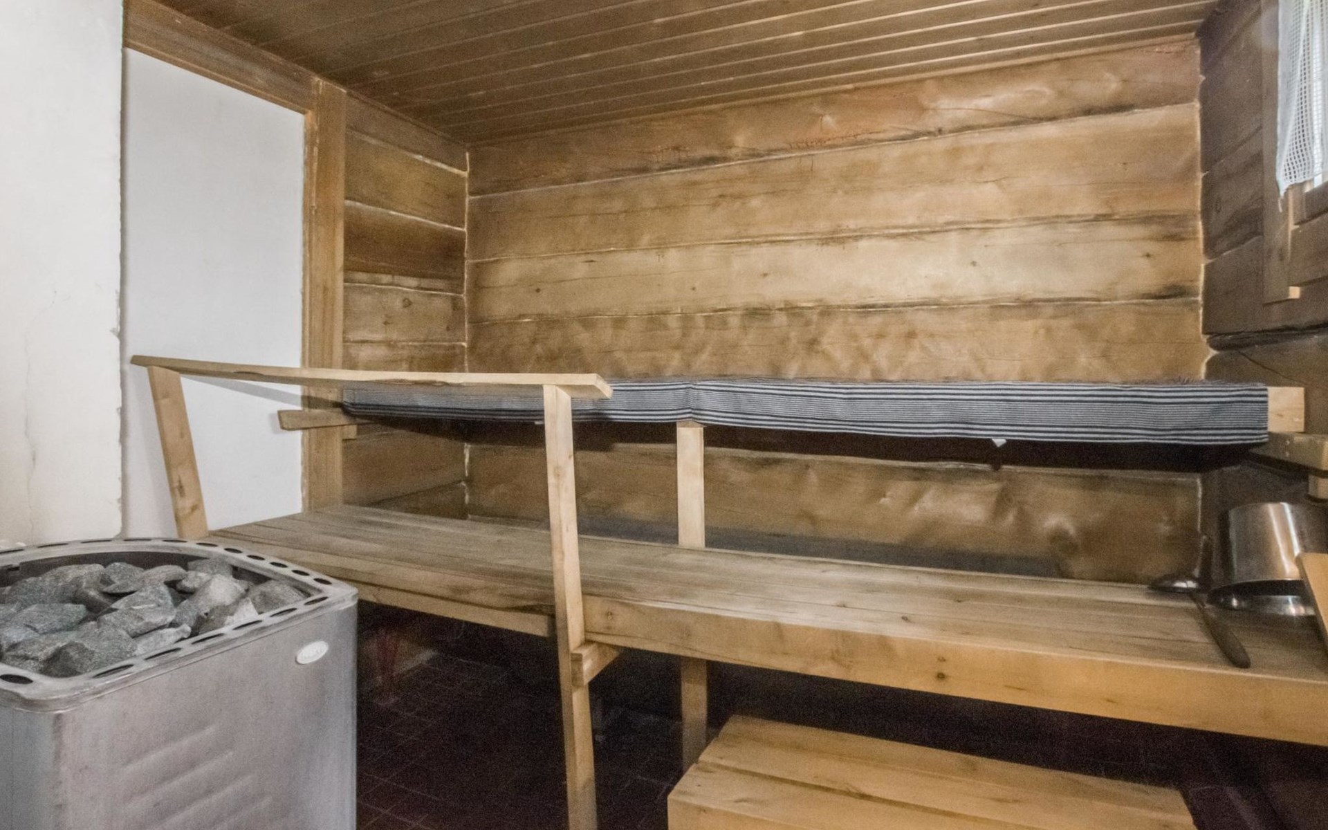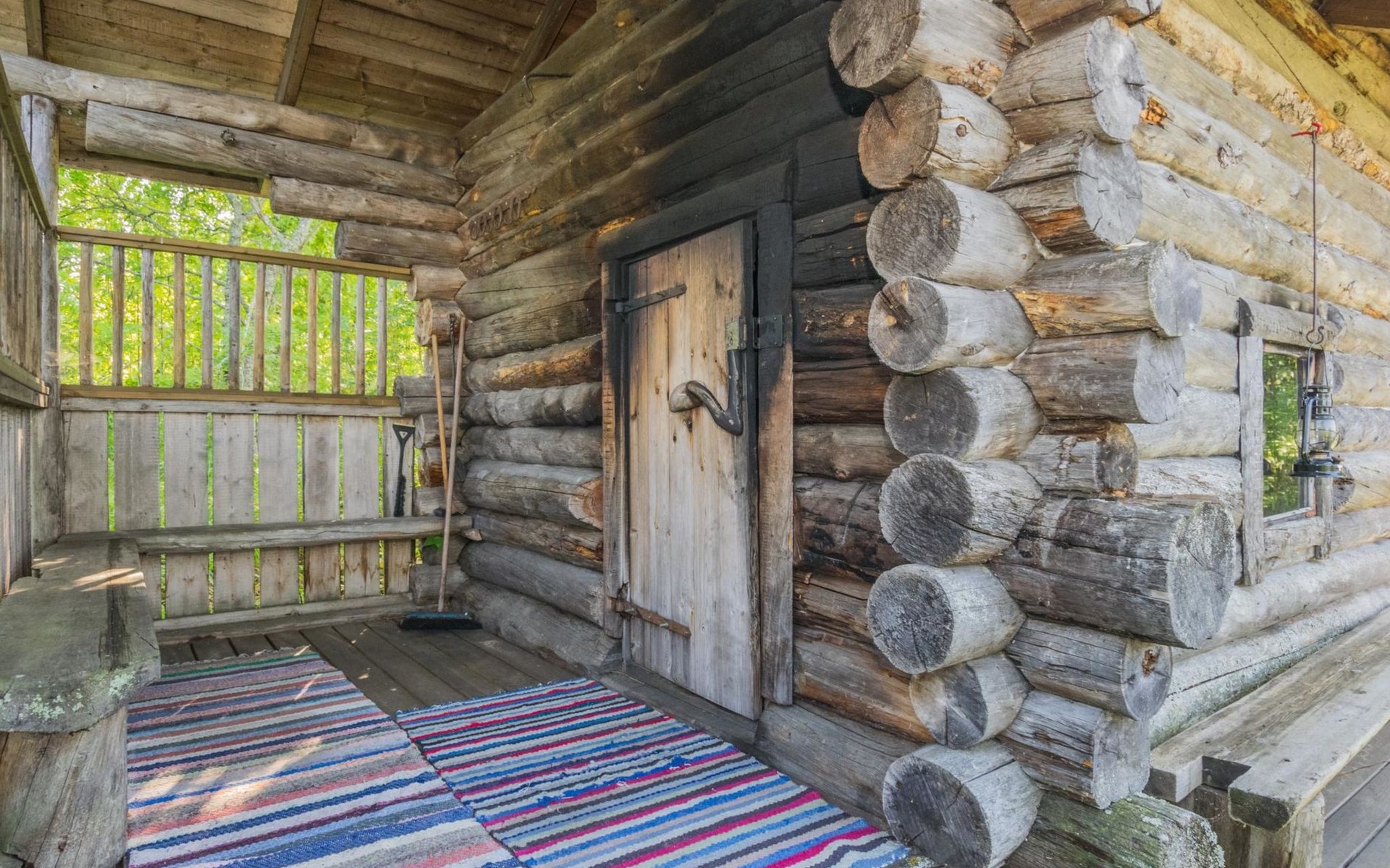 The two-storey log chalet 1994, on the ground floor a large kitchen-living room, bedroom with double bed and a cot, bathroom, dressing room, sauna, separate toilet and a terrace.