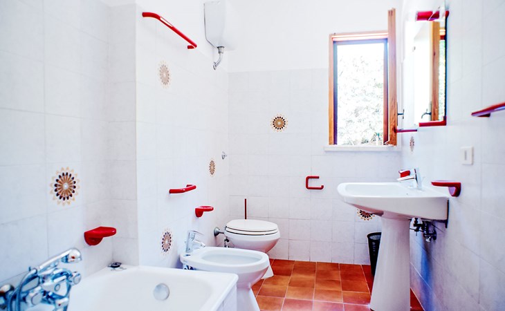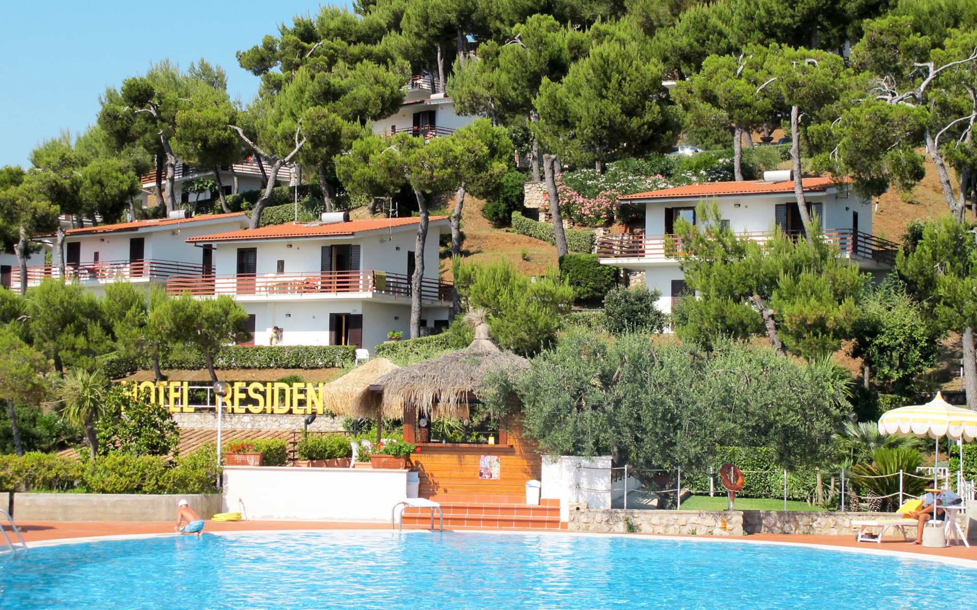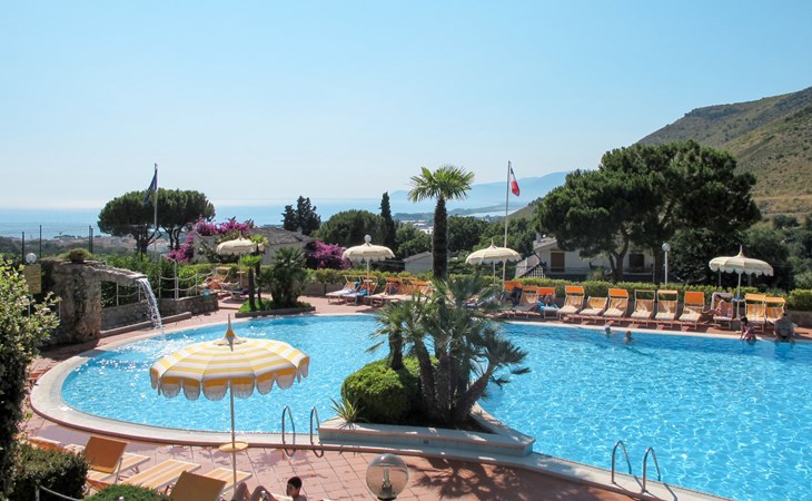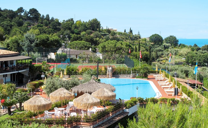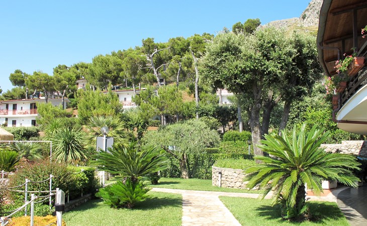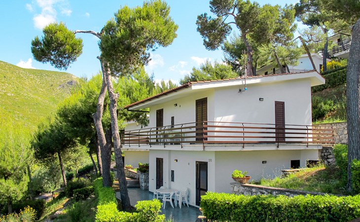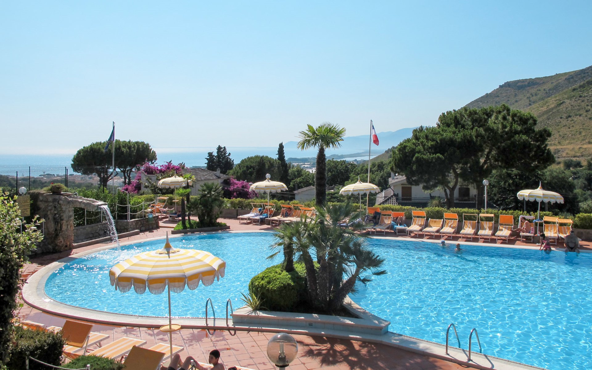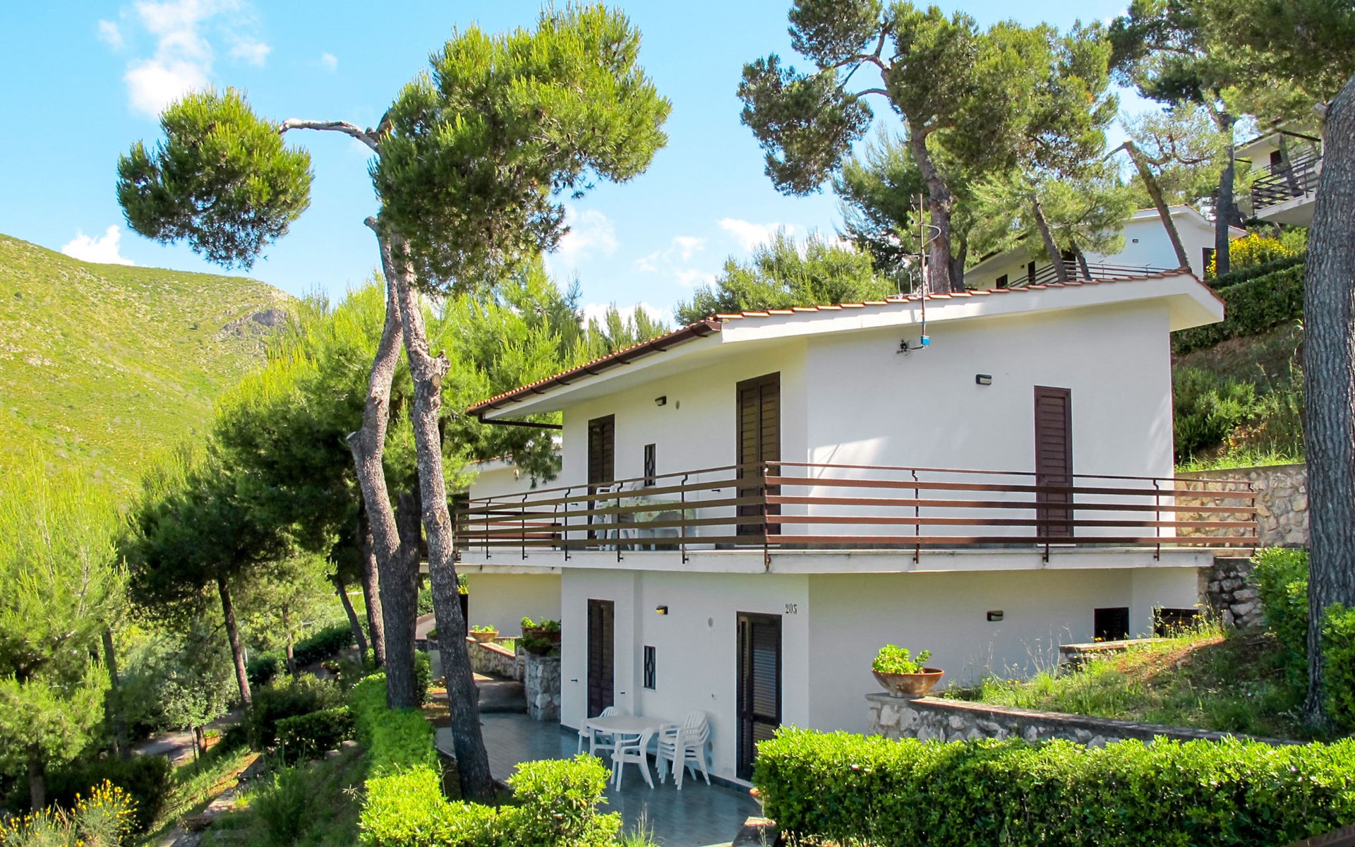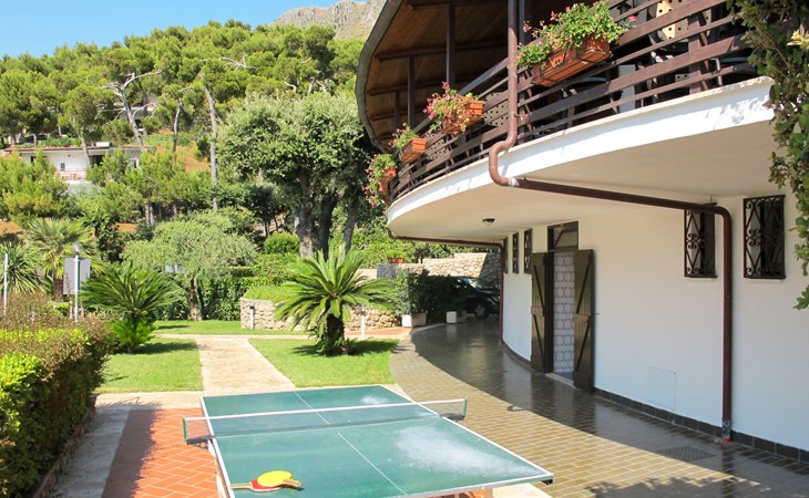 Sperlonga: Cosy, comfortable resort "Costa di Kair ed Din". 67 apartments in the property. 700 m from the centre of Sperlonga, in a sunny, elevated position on a slope, 1.6 km from the sea, 1.6 km from the beach. For shared use: large garden with plants and flowers, swimming pool (20 x 8 m, depth 80 - 300 cm, seasonal availability: 30.May. - 25.Sep. pool opening hours: 10:00-14:00 and 15:00-19:00). WC in the pool area, outdoor shower, tennis, floodlit (extra), children's playground (slide, swing). In the complex: reception, bar, WiFi, washing machine (for shared use, extra). Stepped path to the house. Parking. Shop 700 m, grocery, supermarket, bus stop 1 km, railway station "Formia (Roma-Napoli)" 19 km, ferry "Isole Pontine" 19 km, sandy beach 2 km. Nearby attractions: Gaeta 12 km, Terracina 17 km, Itri 14 km, San Felice Circeo 32 km. Please note: Loading and unloading of baggage is possible at the holiday house. The photograph shows a typical example. Obligation to wear bathing caps.