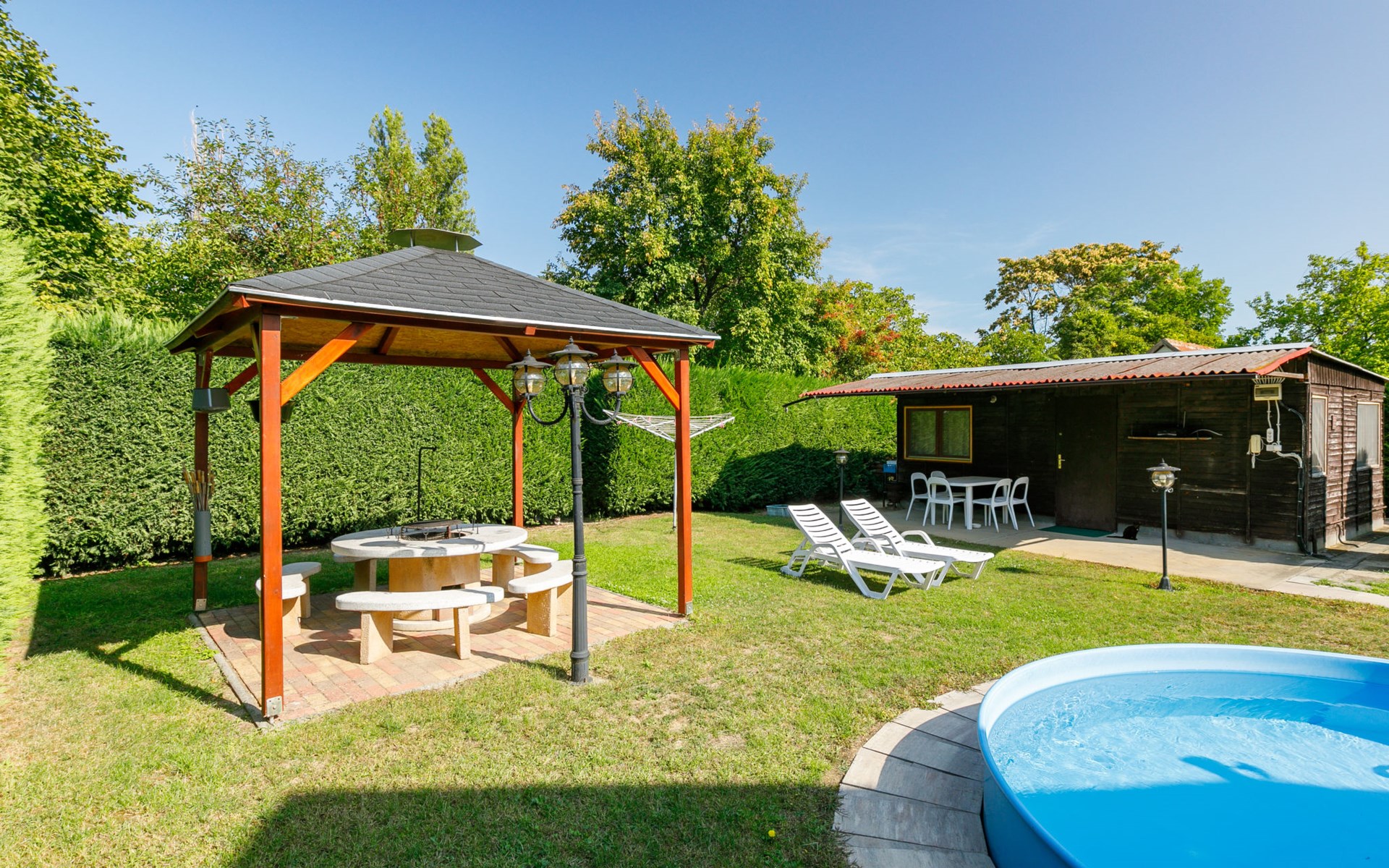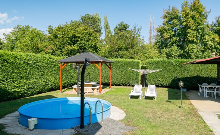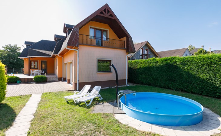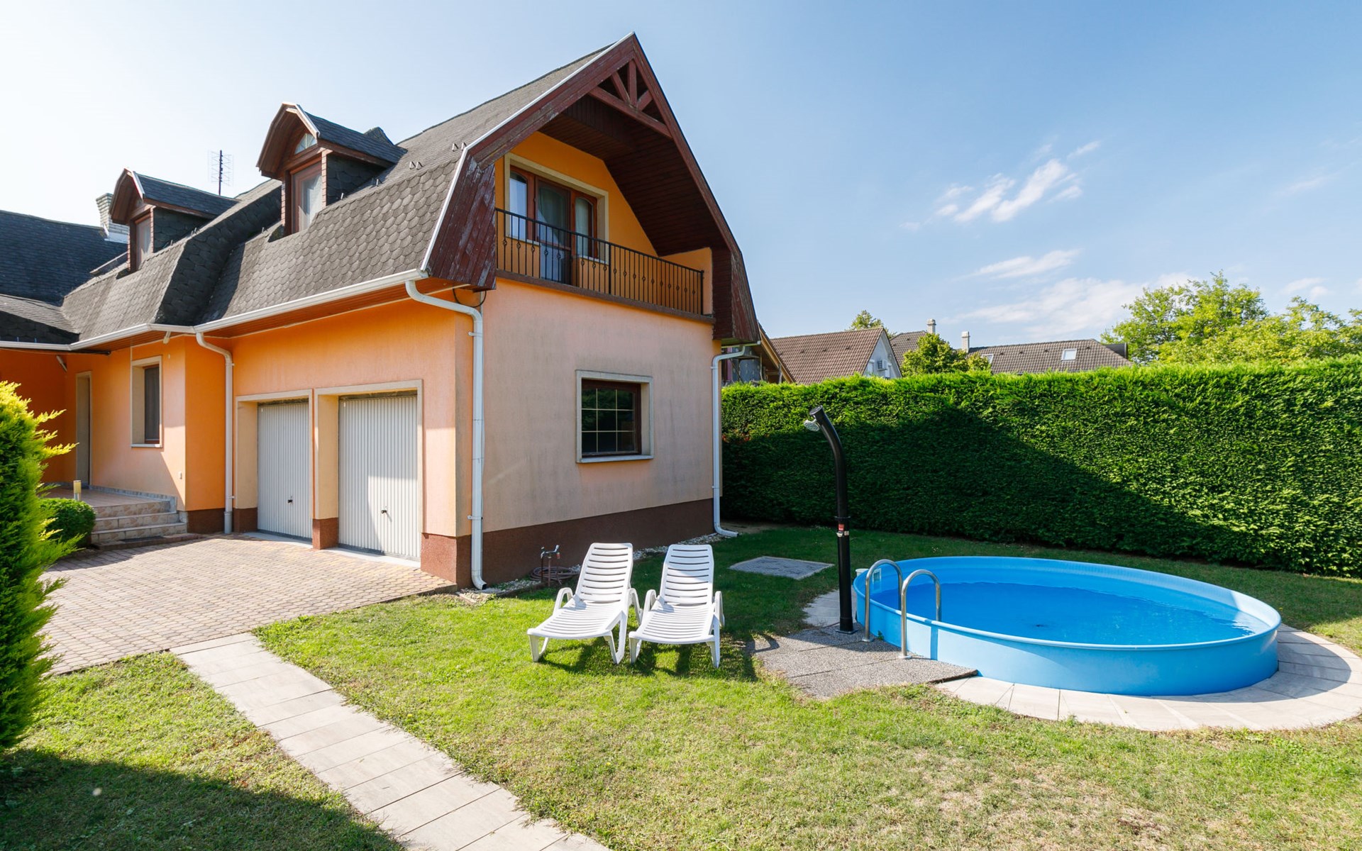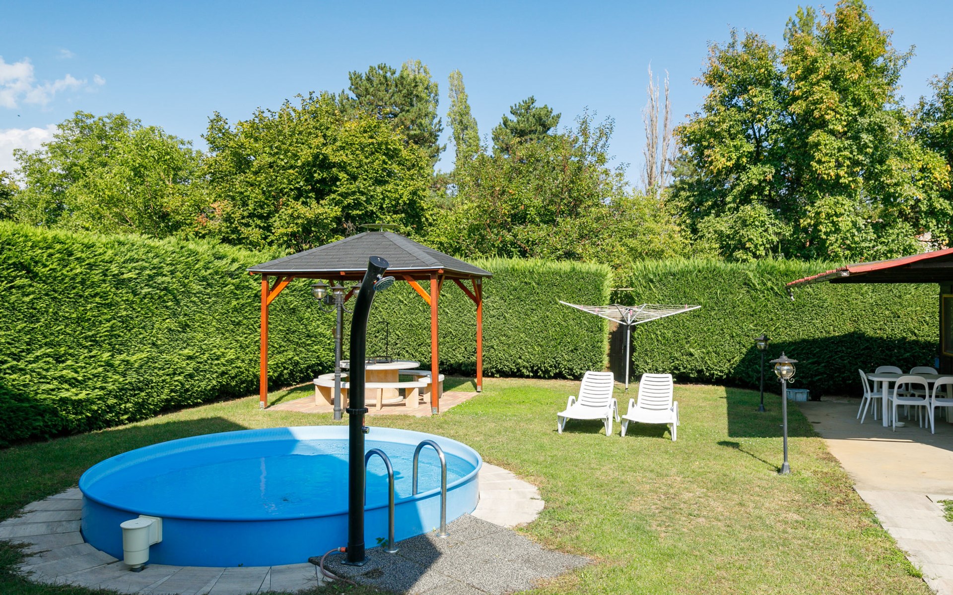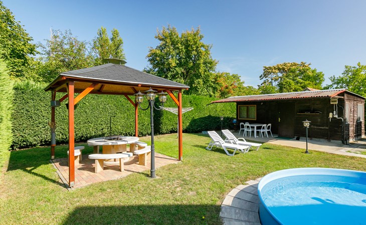 Balatonszárszó 20 km from Siófok: Single-family house "Narcisse". 750 m from the centre of Balatonszarszo, 25 km from the centre of Siofok, 62 km from the centre of Keszthely, in a sunny position in the residential district, 300 m from the lake, 650 m from the beach. Private: property 800 m2 (fenced) with lawn and trees, swimming pool round (3,60 m diameter, depth 90 cm, seasonal availability: 15.May. - 15.Sep.). Fireplace. In the house: WiFi, table tennis, billiard table, table football. Parking (for 2 cars) on the premises, single garage. Shop 750 m, supermarket 12 km, restaurant 2 km, bicycle rental 1.2 km, grass beach 300 m, thermal baths "Igal" 43 km. Tennis 1.6 km, riding stable 16 km, cycle lane 650 m, children's playground 1 km. Nearby attractions: Siófok Giant Wheels 19 km, Aquapark Siófok 21 km, Adventure Park Zamárdi 11 km, Bella Zoo Siófok 23 km, Hévíz Thermal Bath 62 km, Ferry Szántód 7 km.