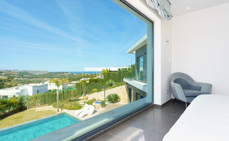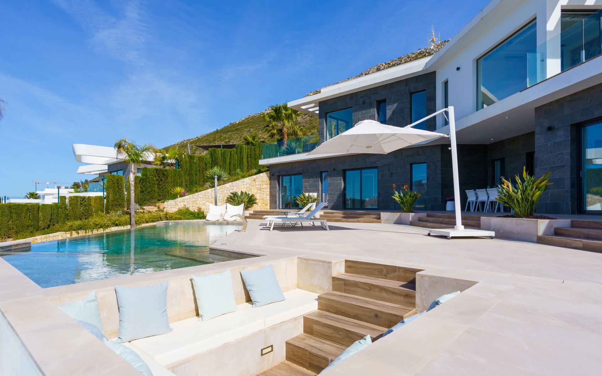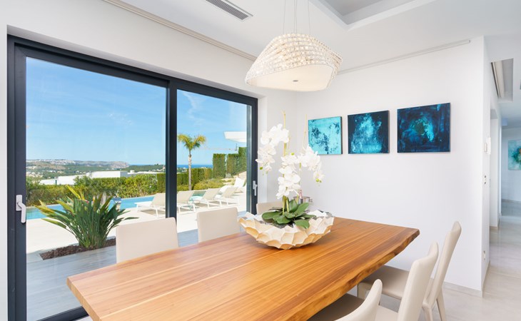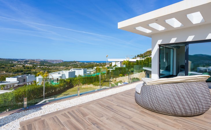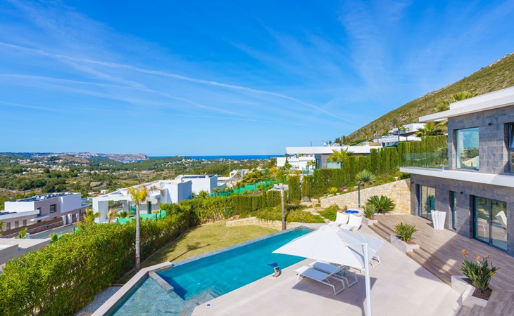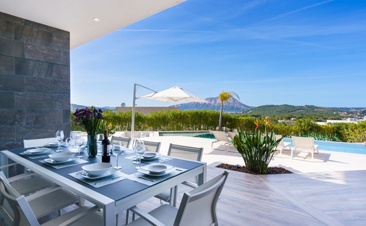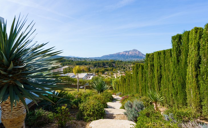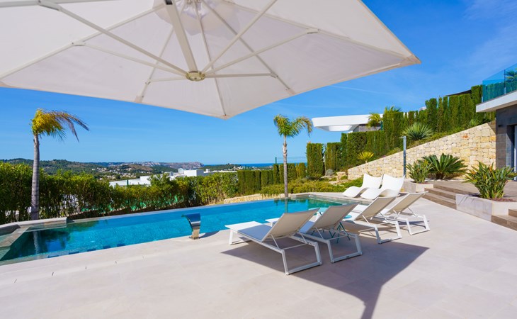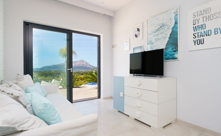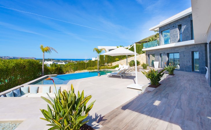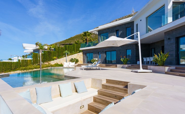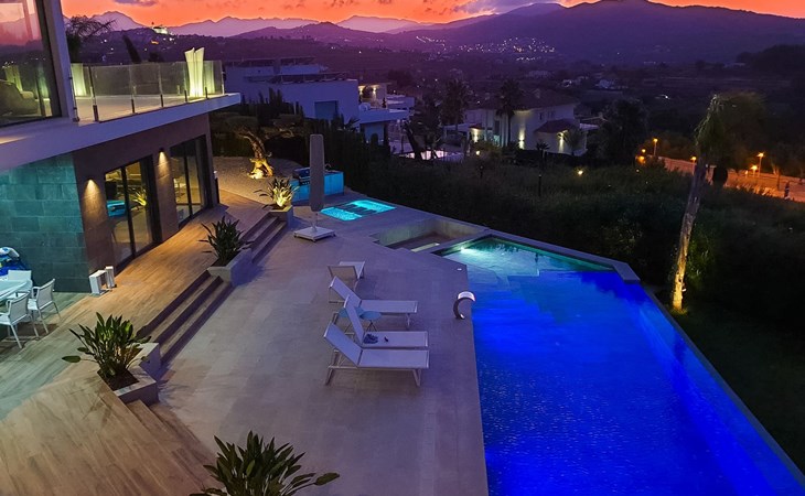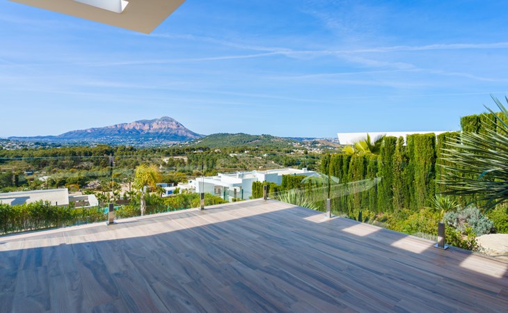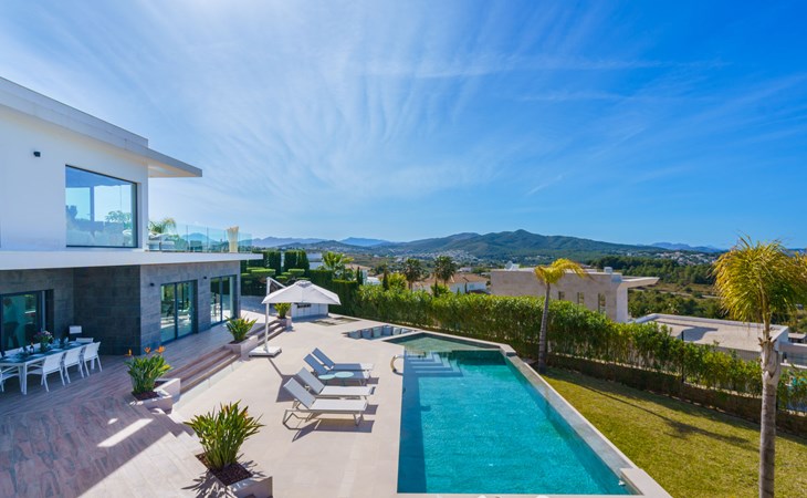 Very large, very modern, very luxurious villa "Adonia", 3 storeys. In the district of Cansalades Park Monte Olimpo 5 km from the centre of Jávea - El Arenal, 8 km from the centre of Moraira, in a quiet, sunny position, 5 km from the sea, 5 km from the beach. Private: large, beautiful, well-kept terraced garden with lawn and wildlife garden, swimming pool angular (10 x 4 m, depth 40 - 180 cm, seasonal availability: 01.Jan. - 31.Dec.) with internal staircase. Outdoor shower, pergola, terrace, garden furniture, barbecue. In the house: central heating system, air conditioning, burglar alarm system. Bumpy motor access to the house. Parking (for 2 cars) on the premises. Supermarket 2.5 km, restaurant 1 km, bar 2.5 km, bakery 2.5 km, café 2.5 km, bus stop "Parada Arenal" 5.2 km, sandy beach "El Arenal" 5 km, shingle beach "La Granadella" 10 km. Sports harbour 6 km, marina 6 km, golf course (9 hole) 3 km, surf school 5 km, sailing school 5 km. Please note: car recommended. The owner does not accept any youth groups.
