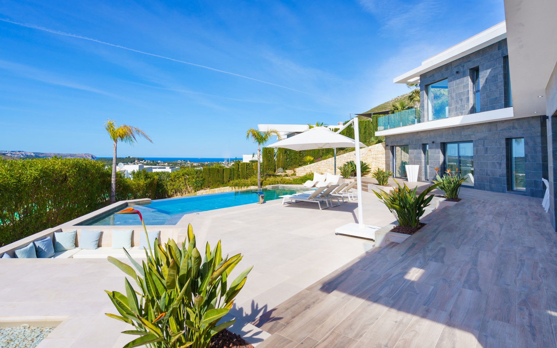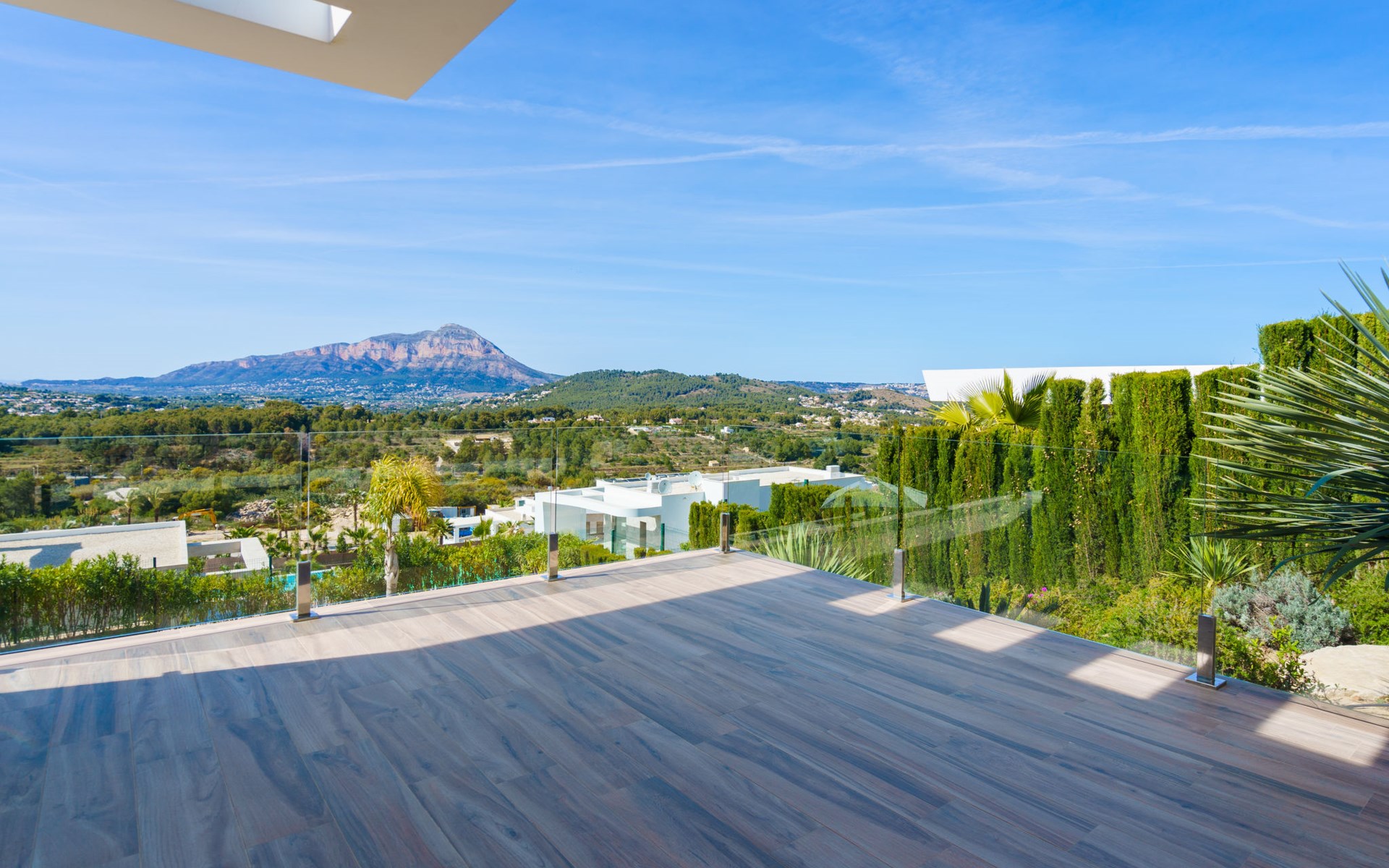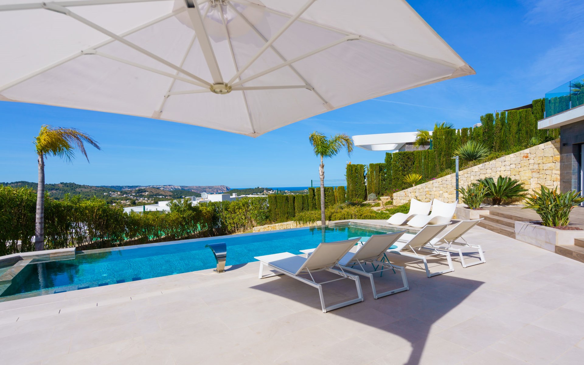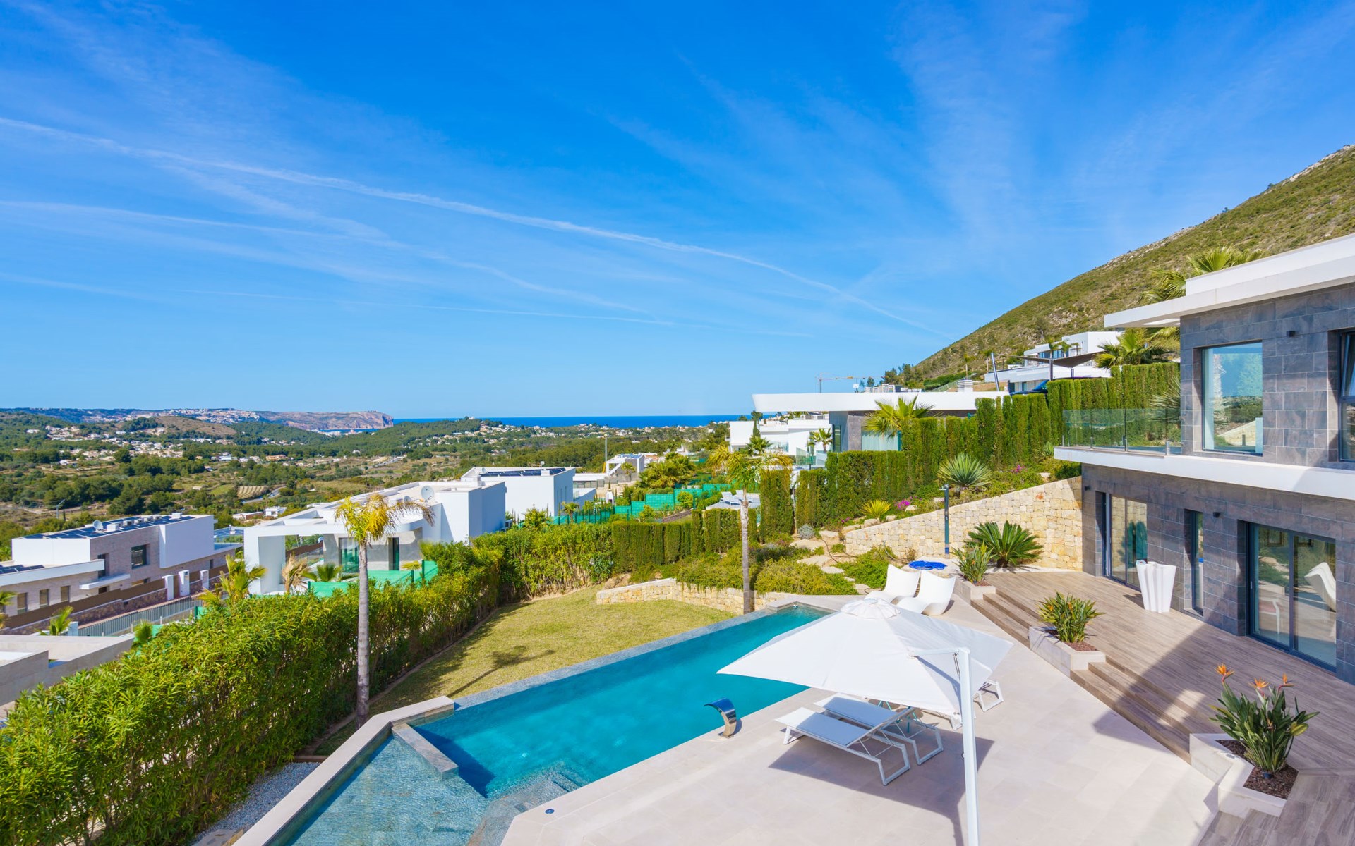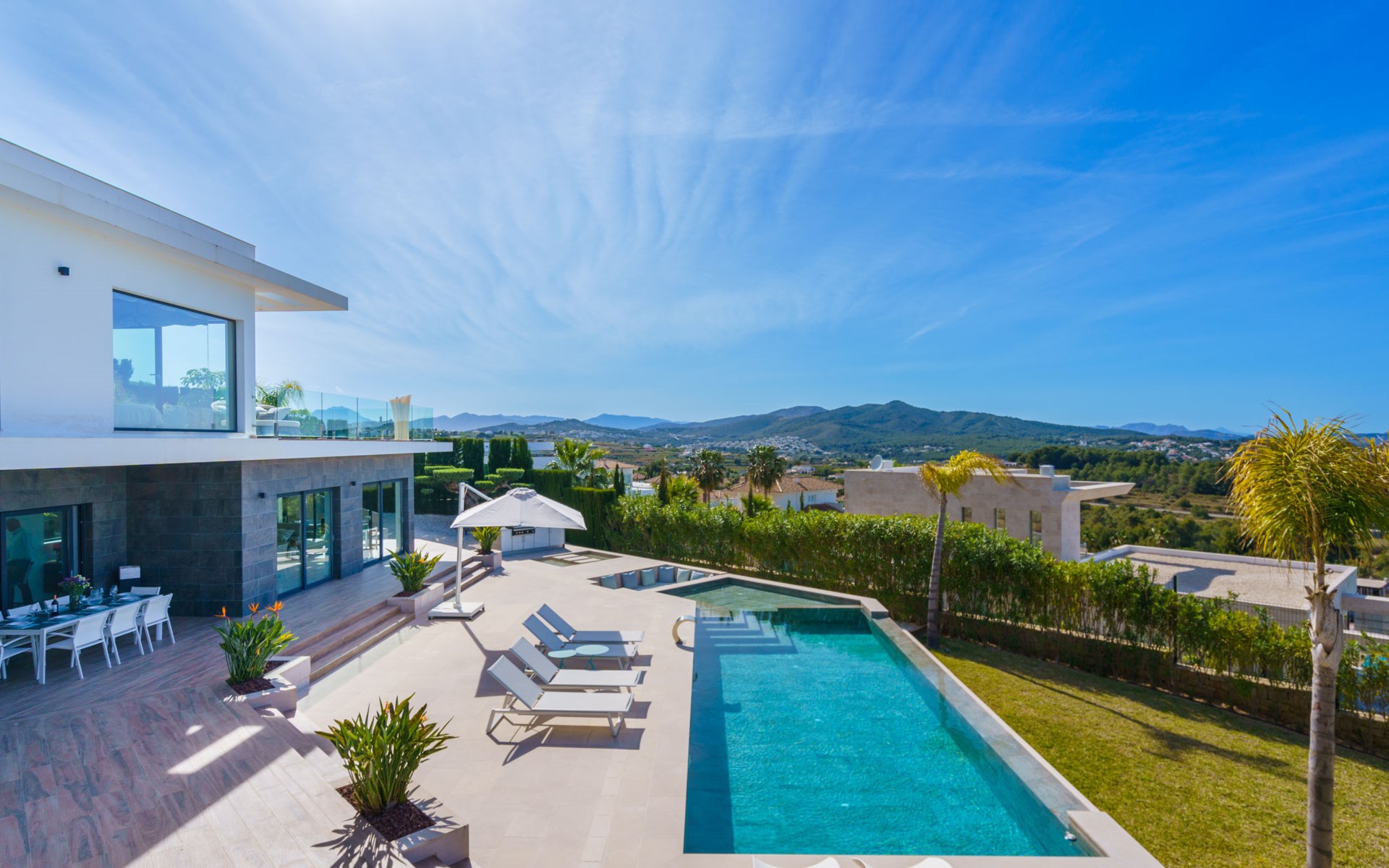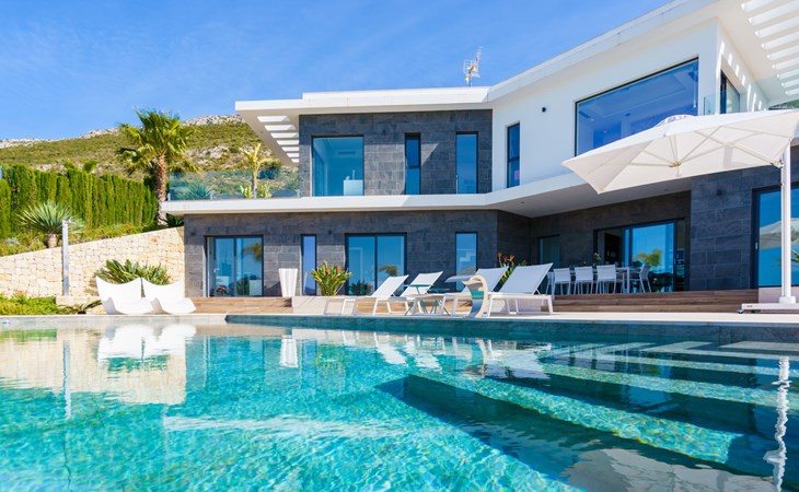 Very large, very modern, very luxurious villa "Adonia", 3 storeys. In the district of Cansalades Park Monte Olimpo 5 km from the centre of Jávea - El Arenal, 8 km from the centre of Moraira, in a quiet, sunny position, 5 km from the sea, 5 km from the beach. Private: large, beautiful, well-kept terraced garden with lawn and wildlife garden, swimming pool angular (10 x 4 m, depth 40 - 180 cm, seasonal availability: 01.Jan. - 31.Dec.) with internal staircase. Outdoor shower, pergola, terrace, garden furniture, barbecue. In the house: central heating system, air conditioning, burglar alarm system. Bumpy motor access to the house. Parking (for 2 cars) on the premises. Supermarket 2.5 km, restaurant 1 km, bar 2.5 km, bakery 2.5 km, café 2.5 km, bus stop "Parada Arenal" 5.2 km, sandy beach "El Arenal" 5 km, shingle beach "La Granadella" 10 km. Sports harbour 6 km, marina 6 km, golf course (9 hole) 3 km, surf school 5 km, sailing school 5 km. Please note: car recommended. The owner does not accept any youth groups.
