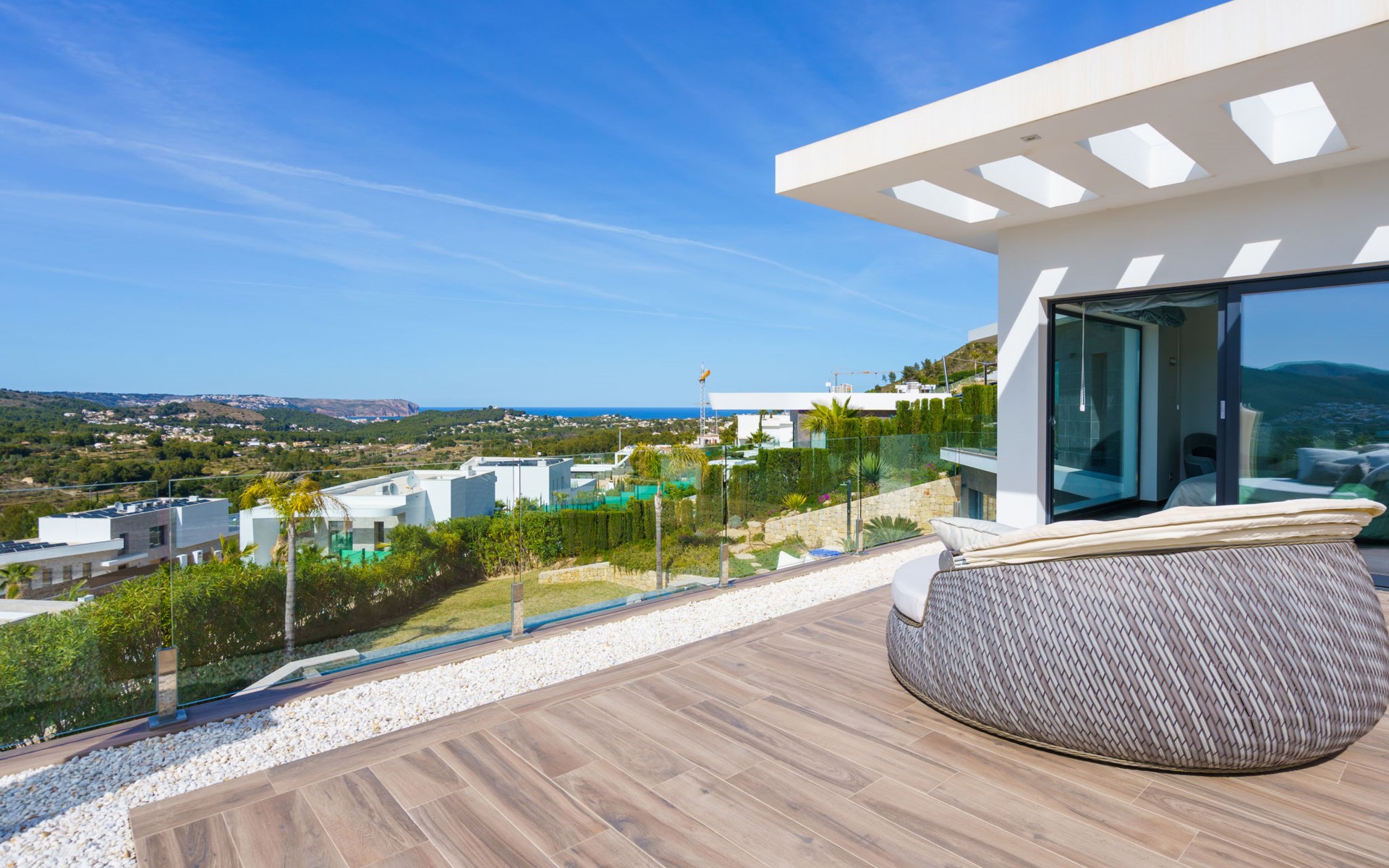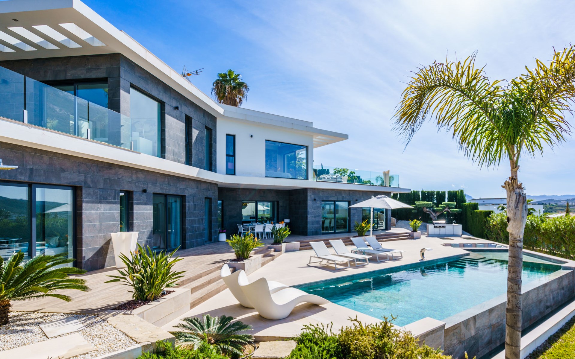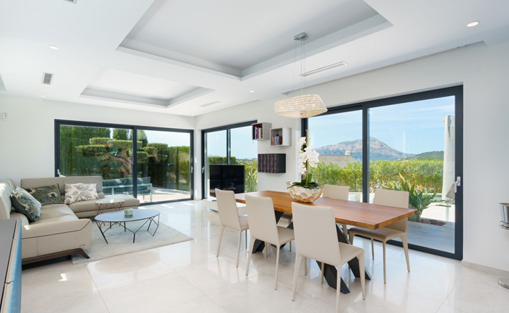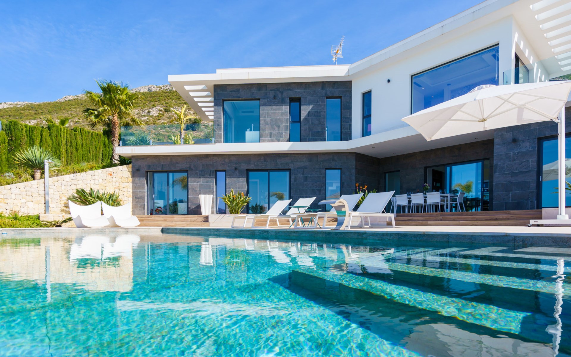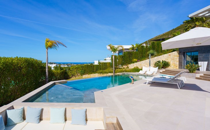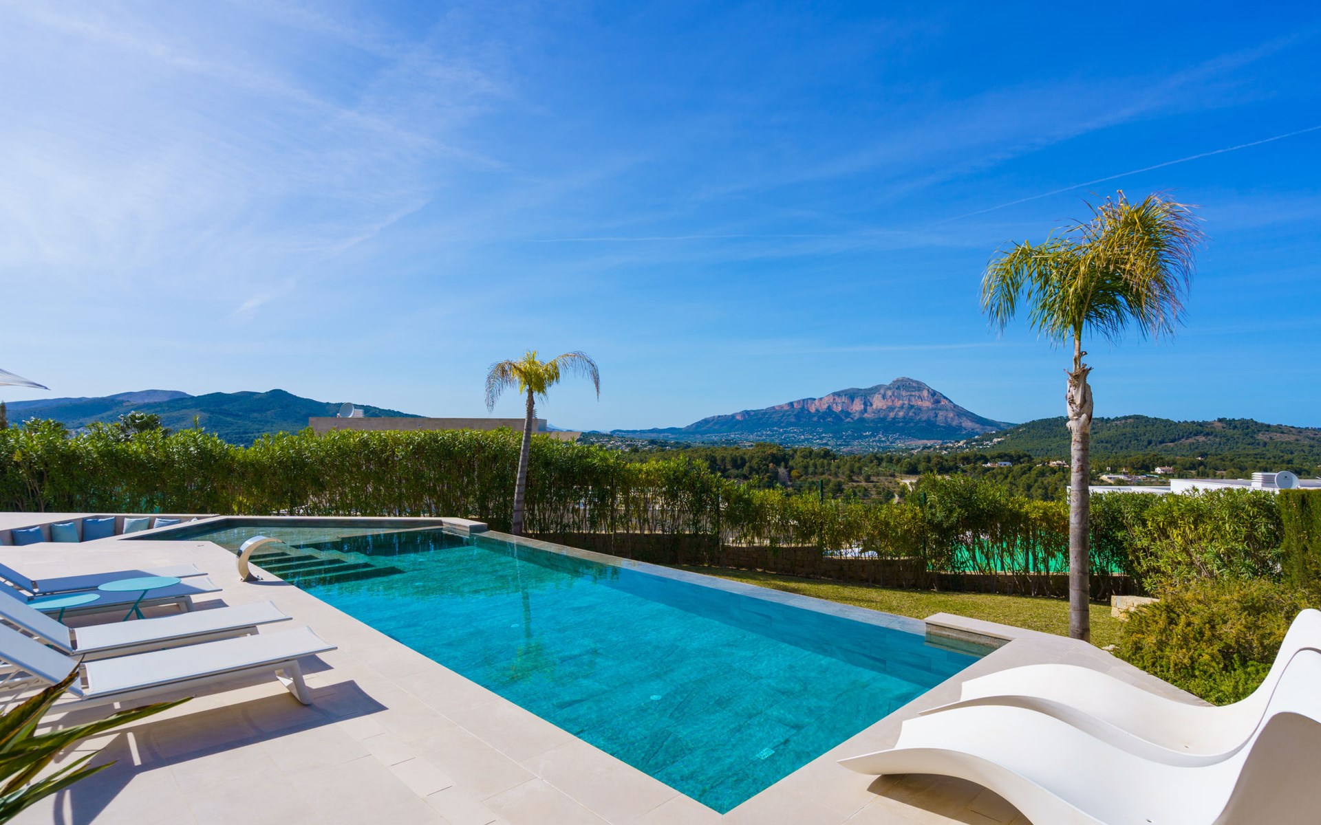 Very large, very modern, very luxurious villa "Adonia", 3 storeys. In the district of Cansalades Park Monte Olimpo 5 km from the centre of Jávea - El Arenal, 8 km from the centre of Moraira, in a quiet, sunny position, 5 km from the sea, 5 km from the beach. Private: large, beautiful, well-kept terraced garden with lawn and wildlife garden, swimming pool angular (10 x 4 m, depth 40 - 180 cm, seasonal availability: 01.Jan. - 31.Dec.) with internal staircase. Outdoor shower, pergola, terrace, garden furniture, barbecue. In the house: central heating system, air conditioning, burglar alarm system. Bumpy motor access to the house. Parking (for 2 cars) on the premises. Supermarket 2.5 km, restaurant 1 km, bar 2.5 km, bakery 2.5 km, café 2.5 km, bus stop "Parada Arenal" 5.2 km, sandy beach "El Arenal" 5 km, shingle beach "La Granadella" 10 km. Sports harbour 6 km, marina 6 km, golf course (9 hole) 3 km, surf school 5 km, sailing school 5 km. Please note: car recommended. The owner does not accept any youth groups.