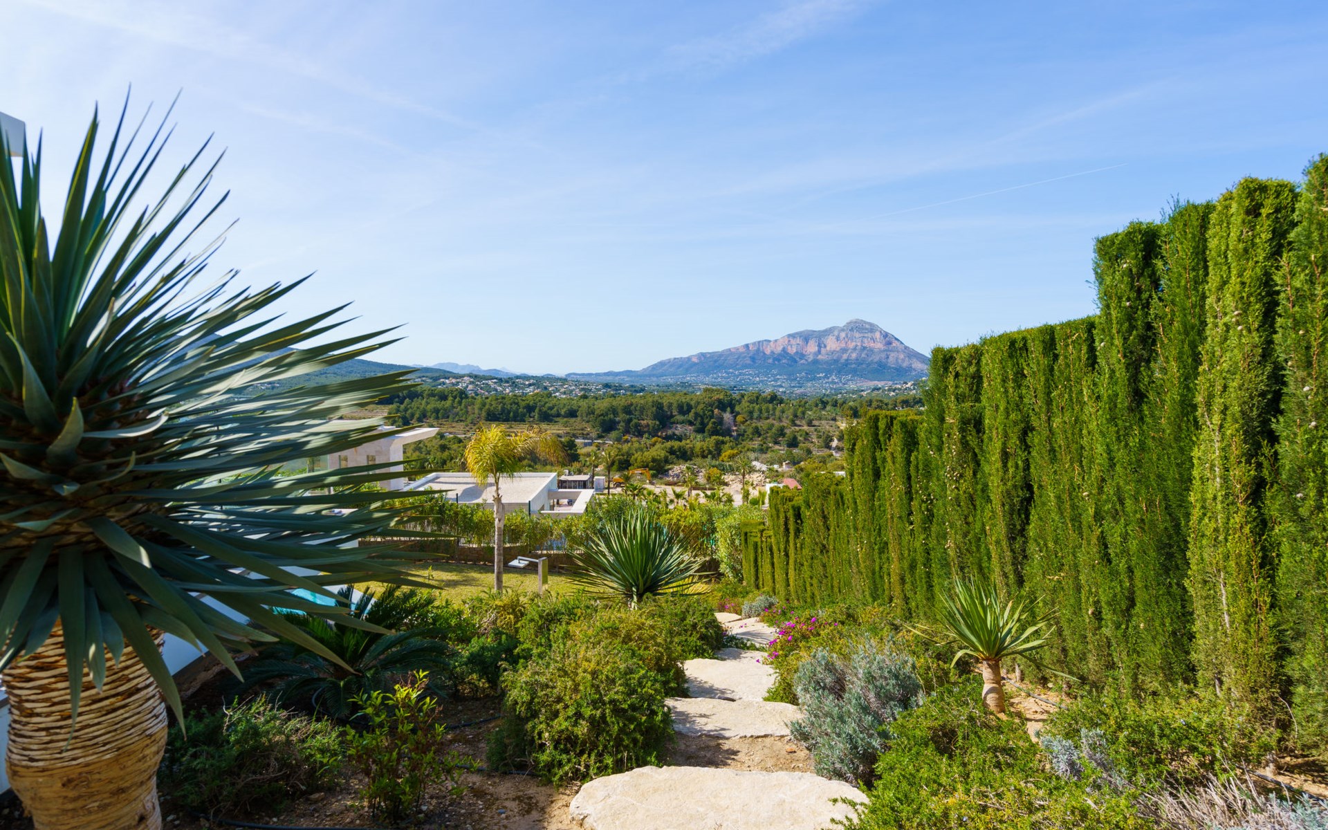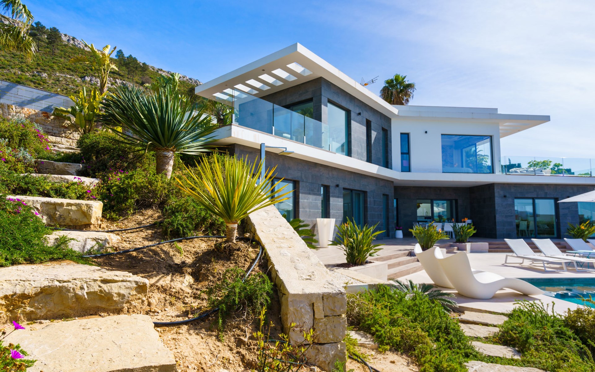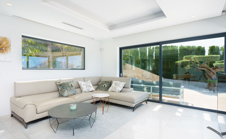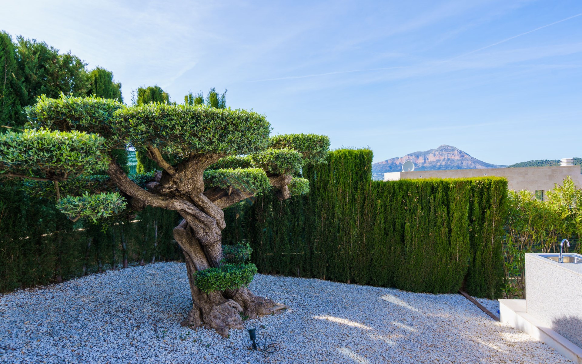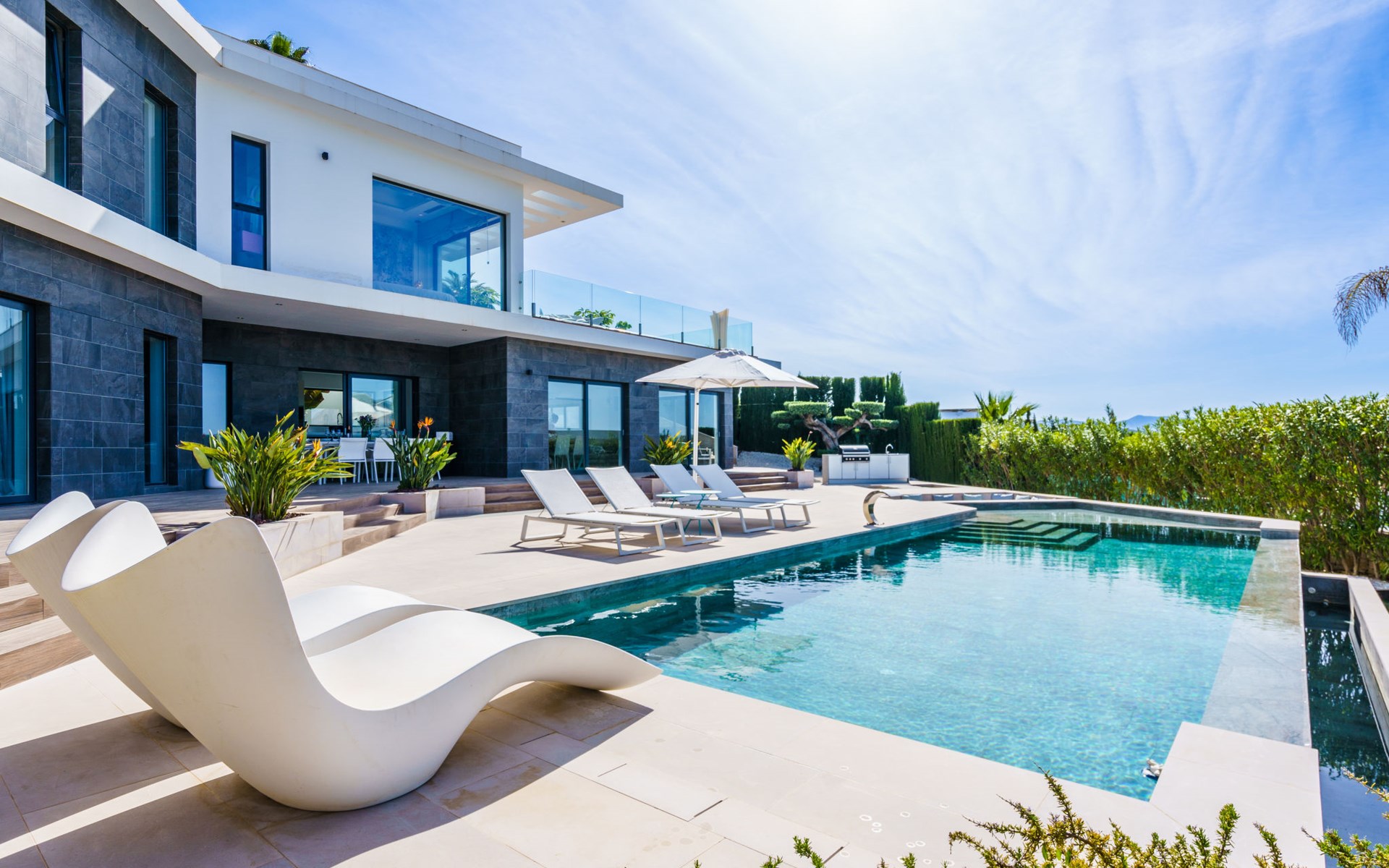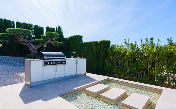 Very large, very modern, very luxurious villa "Adonia", 3 storeys. In the district of Cansalades Park Monte Olimpo 5 km from the centre of Jávea - El Arenal, 8 km from the centre of Moraira, in a quiet, sunny position, 5 km from the sea, 5 km from the beach. Private: large, beautiful, well-kept terraced garden with lawn and wildlife garden, swimming pool angular (10 x 4 m, depth 40 - 180 cm, seasonal availability: 01.Jan. - 31.Dec.) with internal staircase. Outdoor shower, pergola, terrace, garden furniture, barbecue. In the house: central heating system, air conditioning, burglar alarm system. Bumpy motor access to the house. Parking (for 2 cars) on the premises. Supermarket 2.5 km, restaurant 1 km, bar 2.5 km, bakery 2.5 km, café 2.5 km, bus stop "Parada Arenal" 5.2 km, sandy beach "El Arenal" 5 km, shingle beach "La Granadella" 10 km. Sports harbour 6 km, marina 6 km, golf course (9 hole) 3 km, surf school 5 km, sailing school 5 km. Please note: car recommended. The owner does not accept any youth groups.