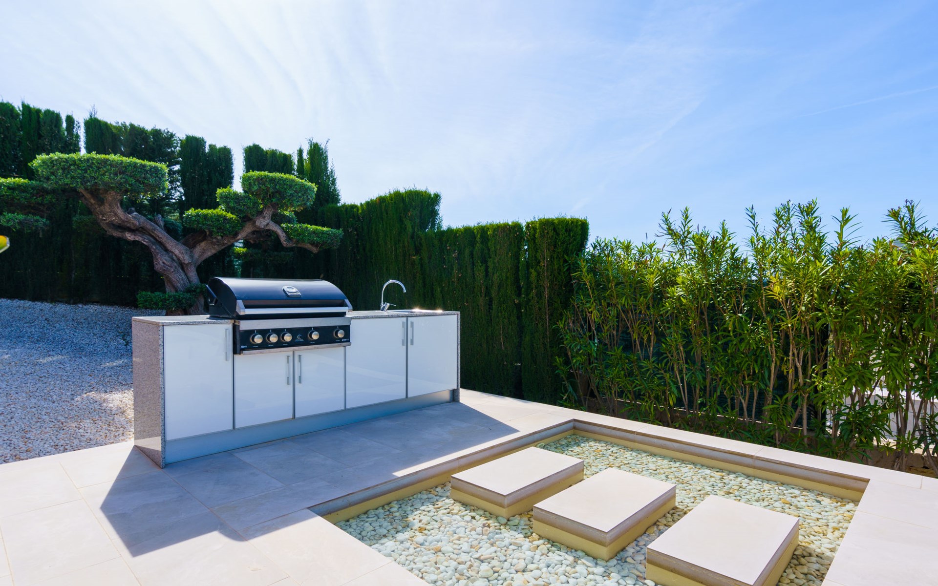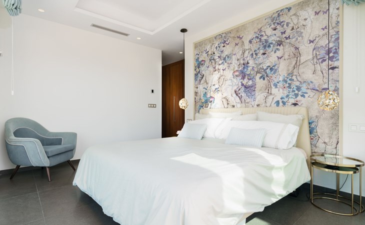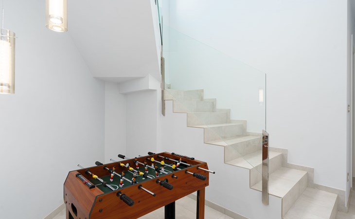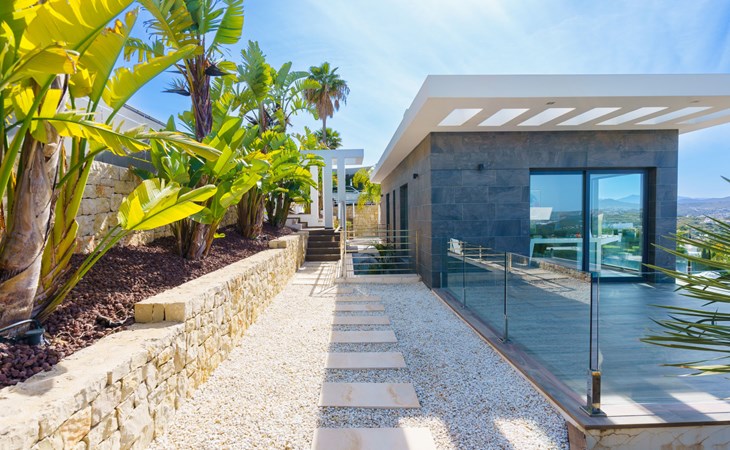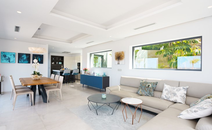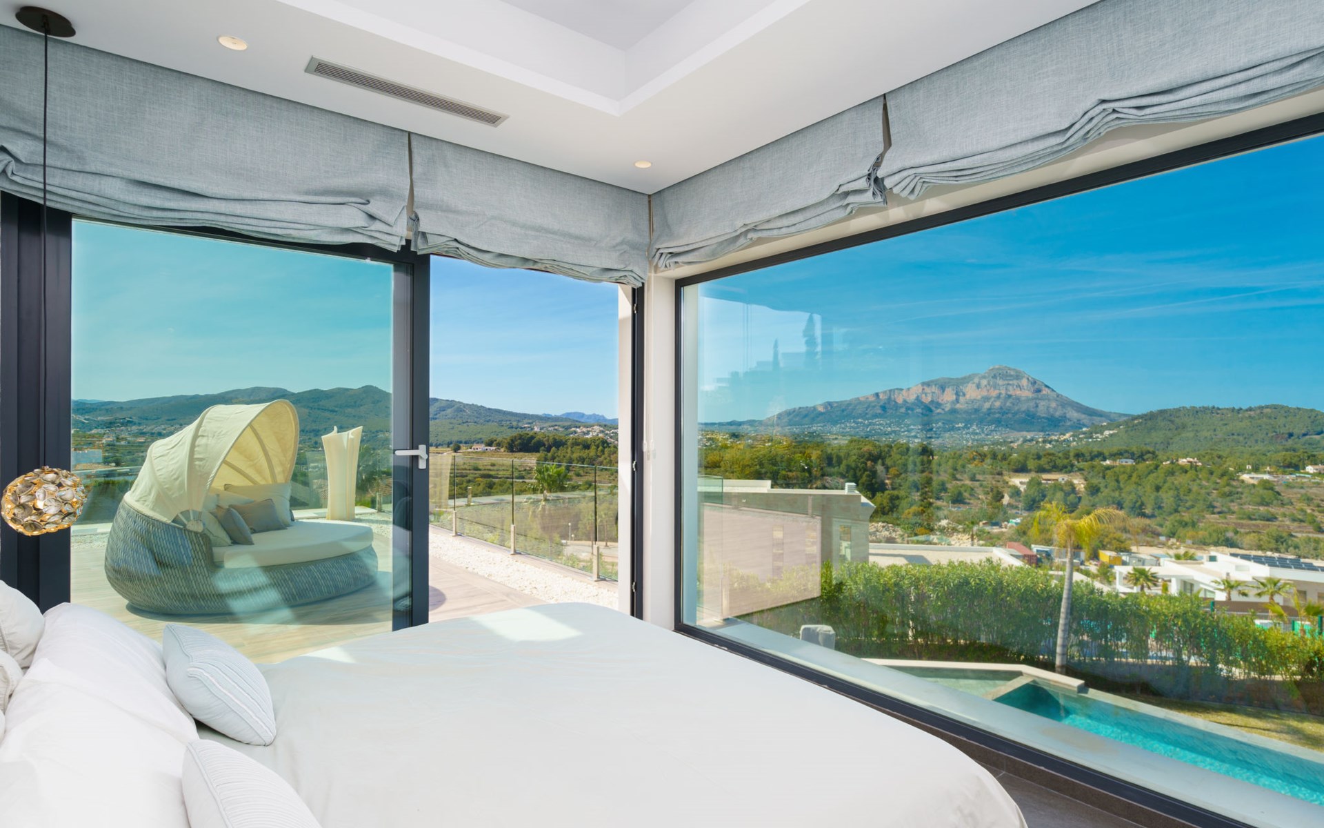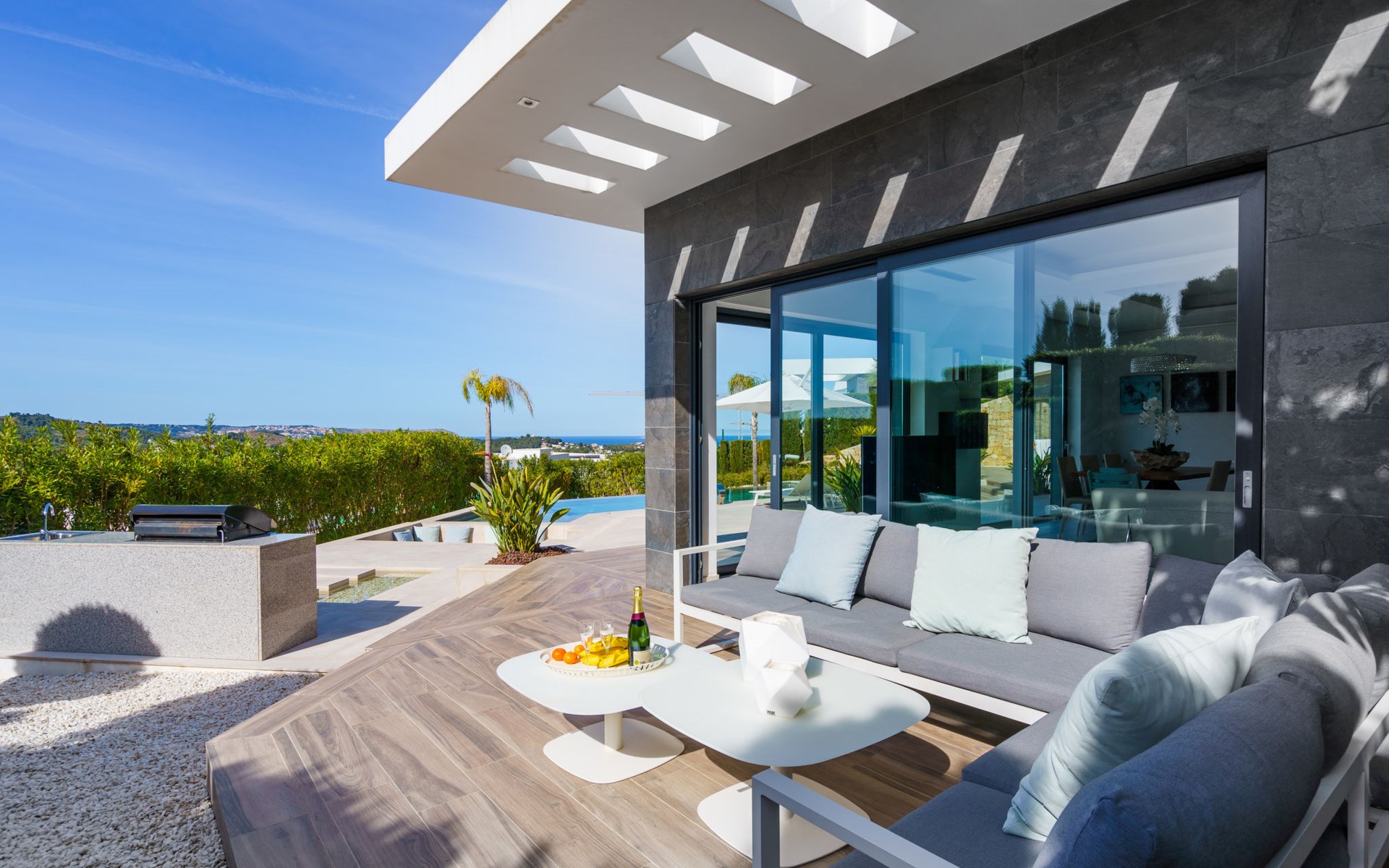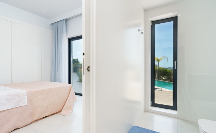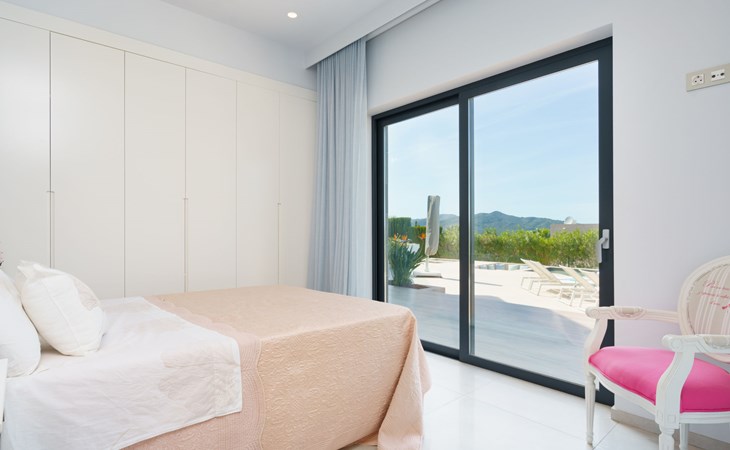 Very large, very modern, very luxurious villa "Adonia", 3 storeys. In the district of Cansalades Park Monte Olimpo 5 km from the centre of Jávea - El Arenal, 8 km from the centre of Moraira, in a quiet, sunny position, 5 km from the sea, 5 km from the beach. Private: large, beautiful, well-kept terraced garden with lawn and wildlife garden, swimming pool angular (10 x 4 m, depth 40 - 180 cm, seasonal availability: 01.Jan. - 31.Dec.) with internal staircase. Outdoor shower, pergola, terrace, garden furniture, barbecue. In the house: central heating system, air conditioning, burglar alarm system. Bumpy motor access to the house. Parking (for 2 cars) on the premises. Supermarket 2.5 km, restaurant 1 km, bar 2.5 km, bakery 2.5 km, café 2.5 km, bus stop "Parada Arenal" 5.2 km, sandy beach "El Arenal" 5 km, shingle beach "La Granadella" 10 km. Sports harbour 6 km, marina 6 km, golf course (9 hole) 3 km, surf school 5 km, sailing school 5 km. Please note: car recommended. The owner does not accept any youth groups.