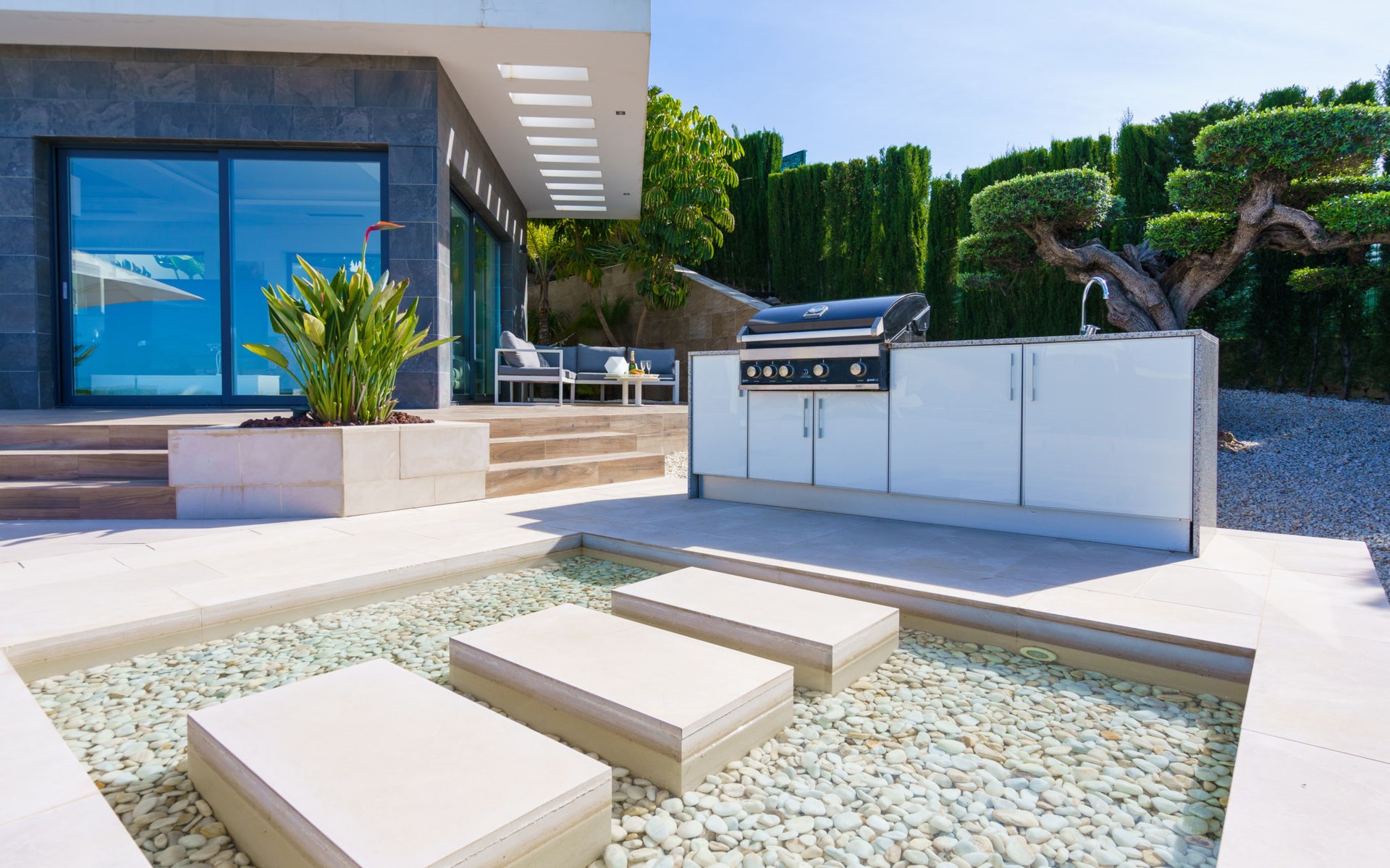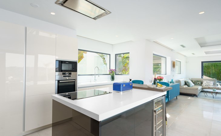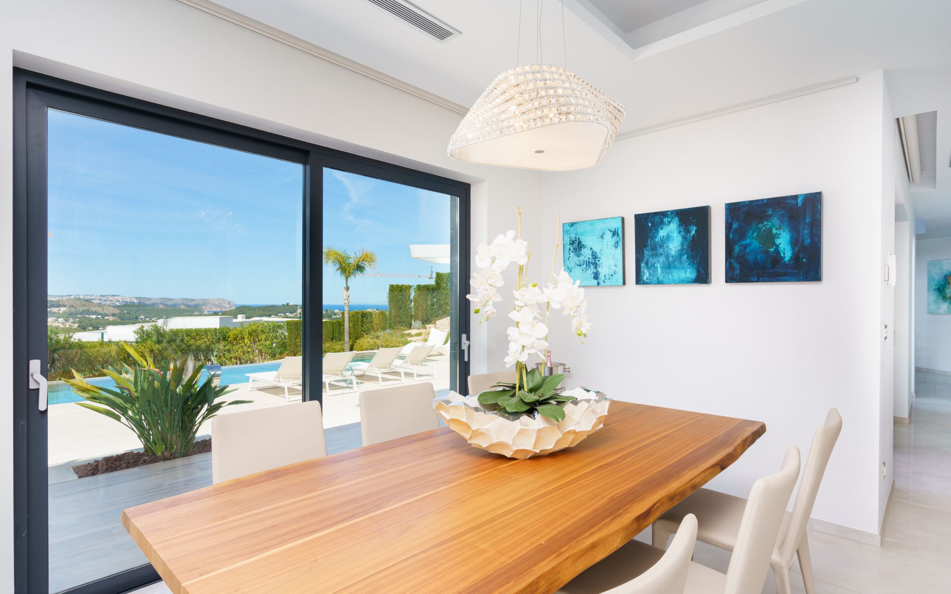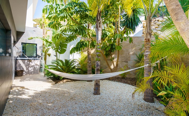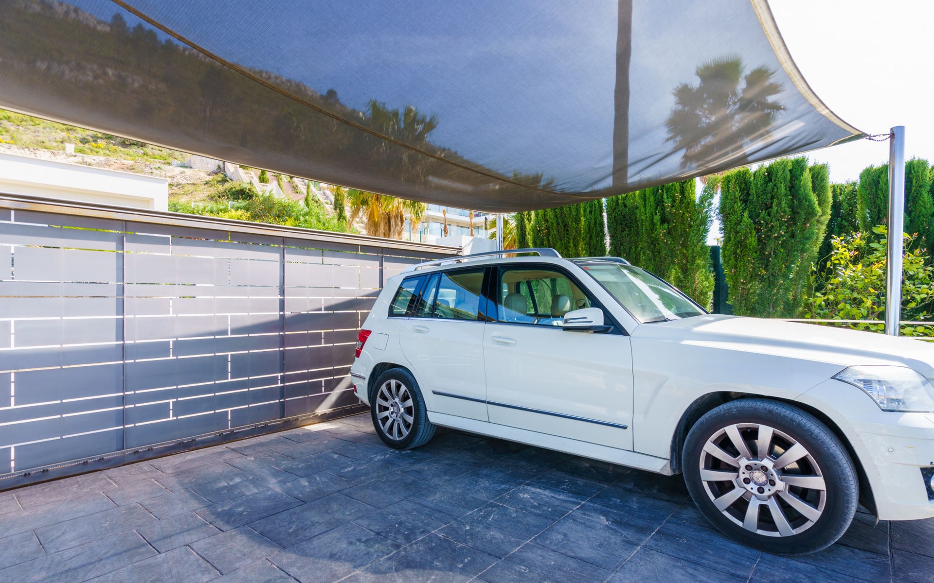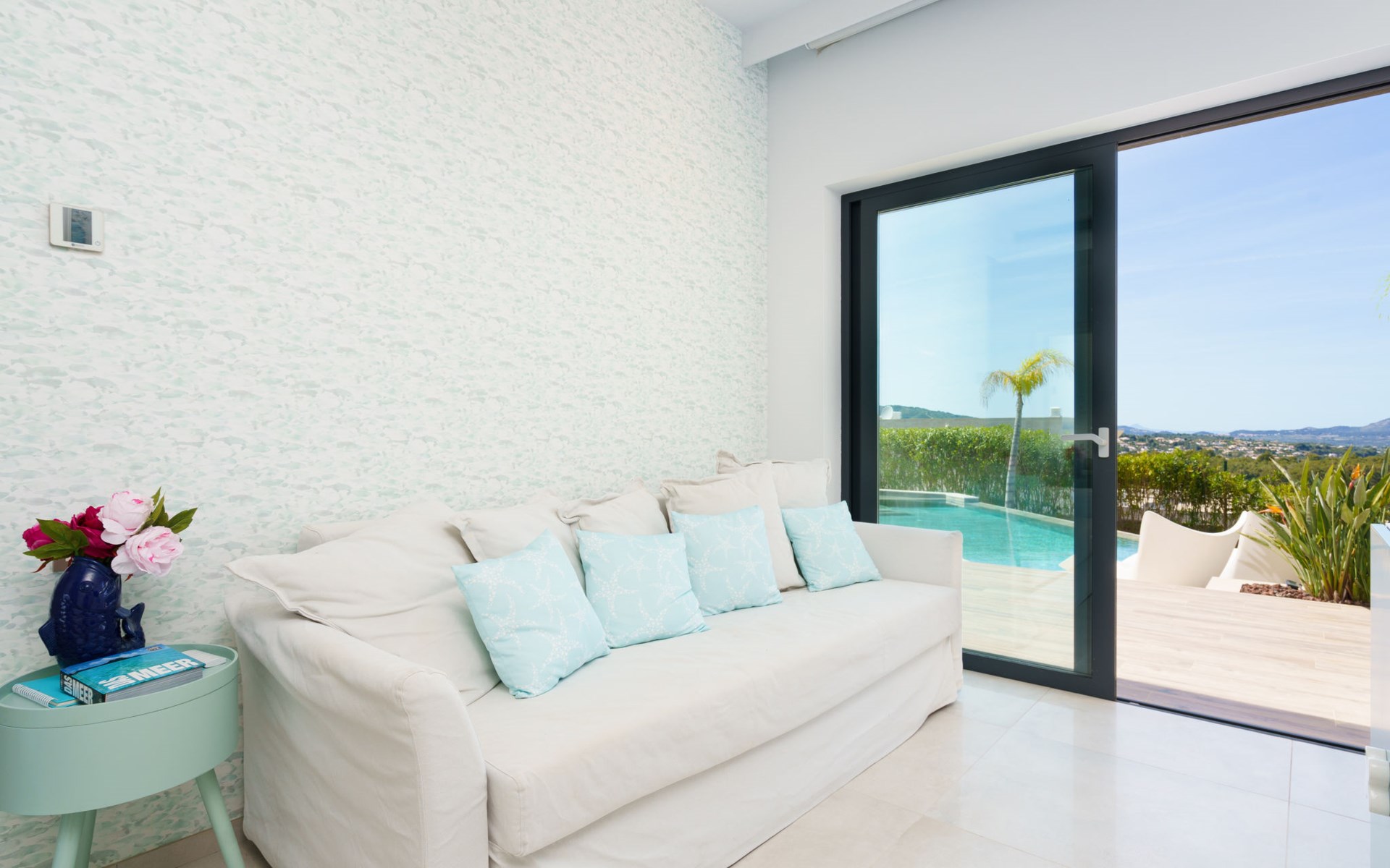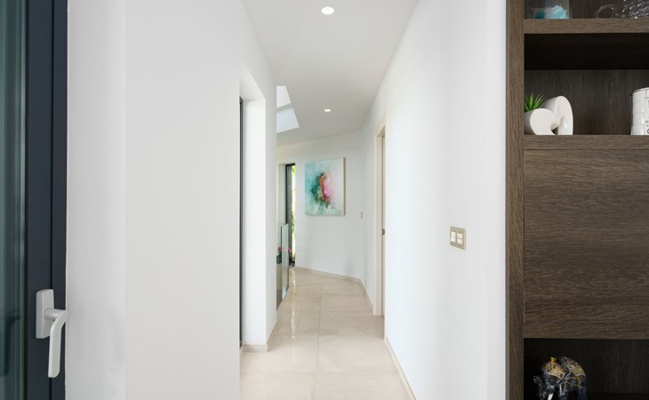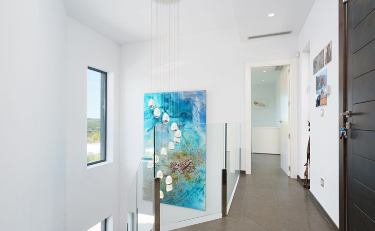Very large, very modern, very luxurious villa "Adonia", 3 storeys. In the district of Cansalades Park Monte Olimpo 5 km from the centre of Jávea - El Arenal, 8 km from the centre of Moraira, in a quiet, sunny position, 5 km from the sea, 5 km from the beach. Private: large, beautiful, well-kept terraced garden with lawn and wildlife garden, swimming pool angular (10 x 4 m, depth 40 - 180 cm, seasonal availability: 01.Jan. - 31.Dec.) with internal staircase. Outdoor shower, pergola, terrace, garden furniture, barbecue. In the house: central heating system, air conditioning, burglar alarm system. Bumpy motor access to the house. Parking (for 2 cars) on the premises. Supermarket 2.5 km, restaurant 1 km, bar 2.5 km, bakery 2.5 km, café 2.5 km, bus stop "Parada Arenal" 5.2 km, sandy beach "El Arenal" 5 km, shingle beach "La Granadella" 10 km. Sports harbour 6 km, marina 6 km, golf course (9 hole) 3 km, surf school 5 km, sailing school 5 km. Please note: car recommended. The owner does not accept any youth groups.
