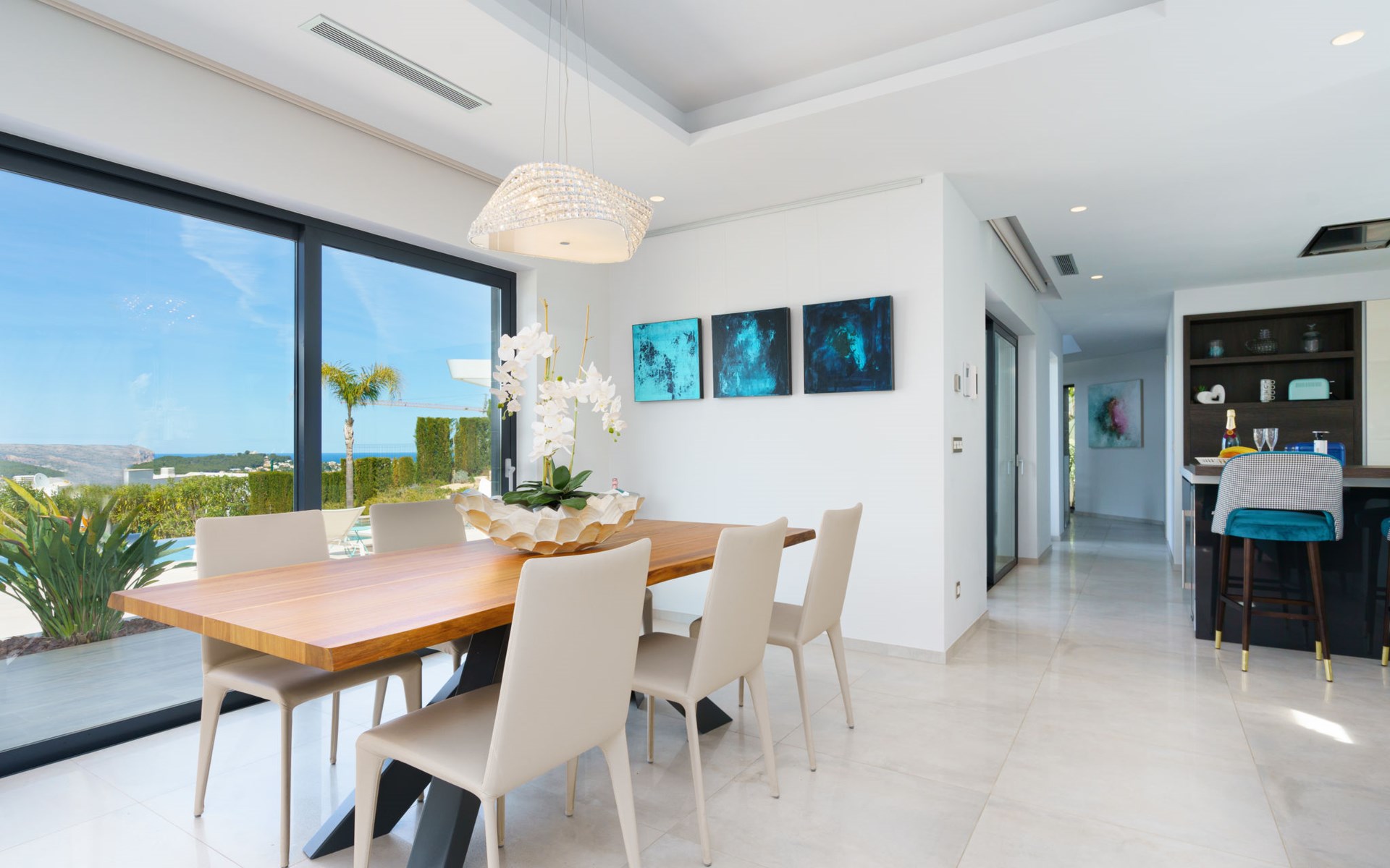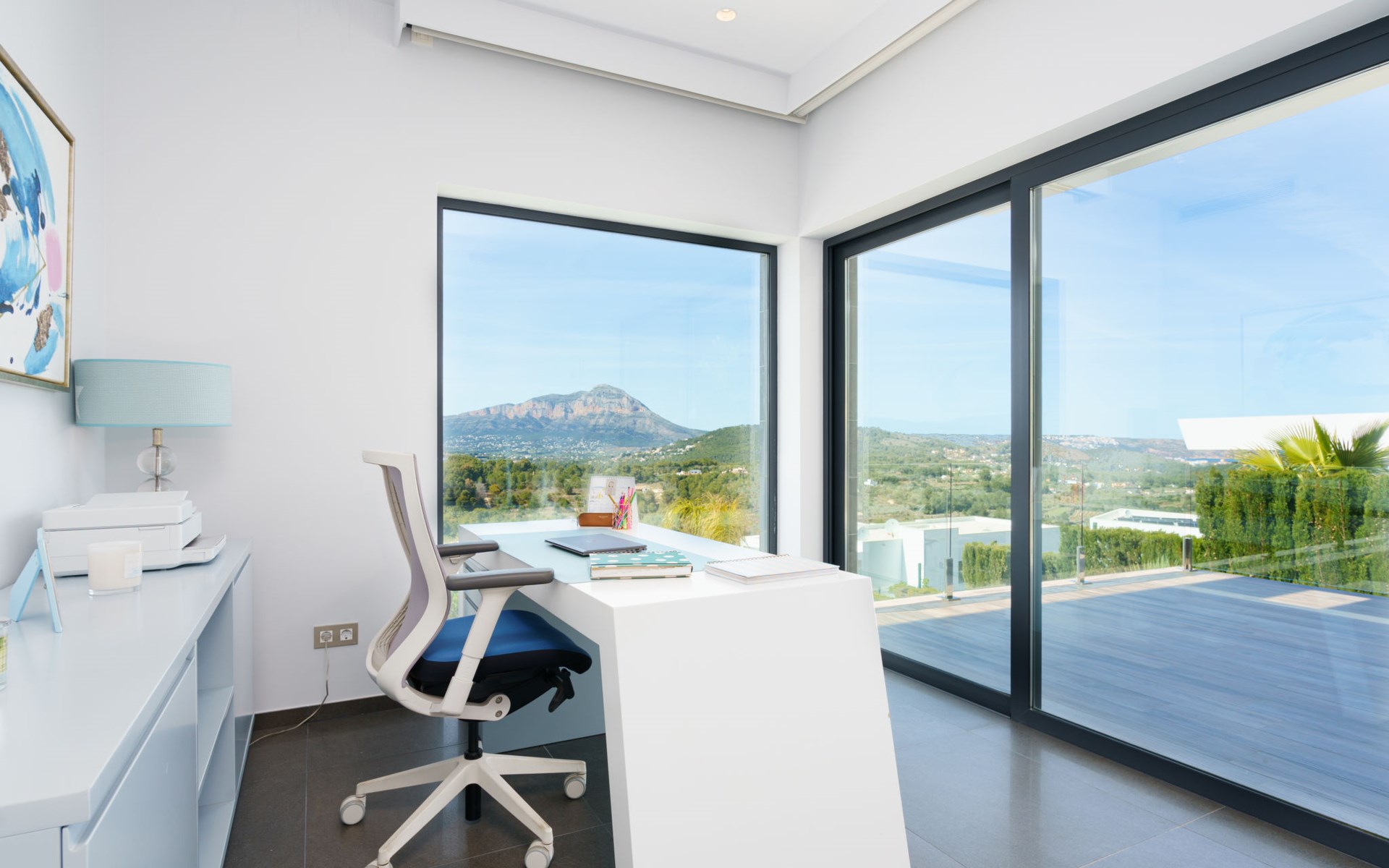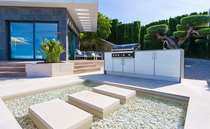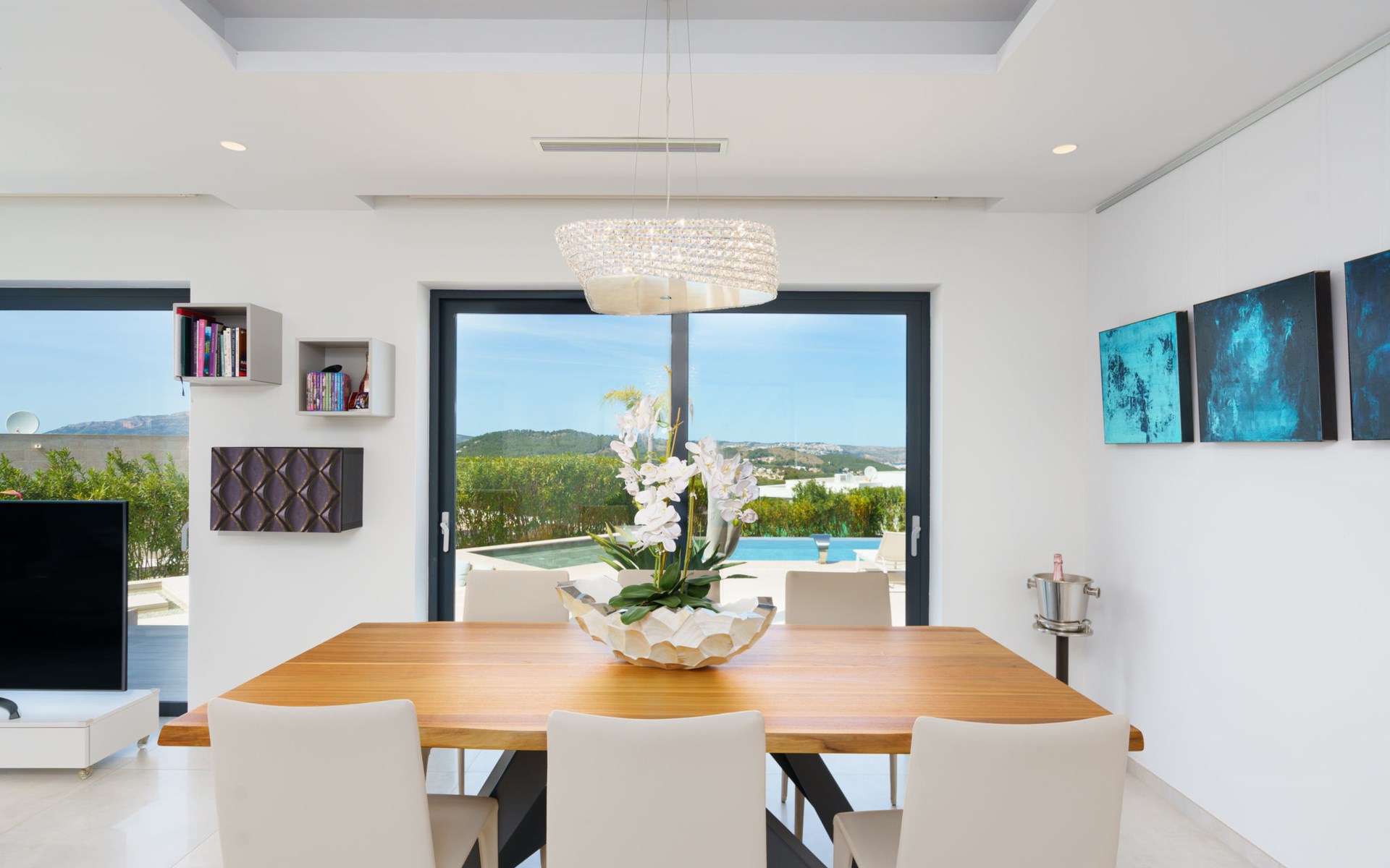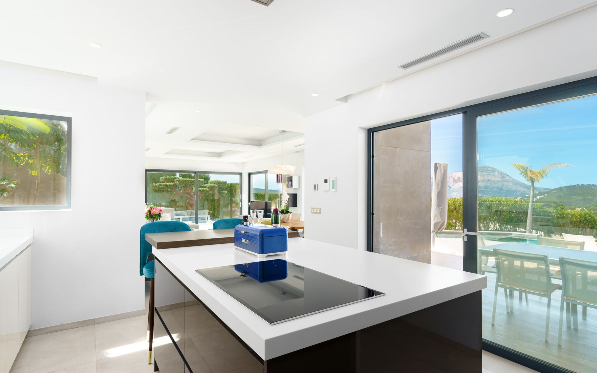 Very large, very modern, very luxurious villa "Adonia", 3 storeys. In the district of Cansalades Park Monte Olimpo 5 km from the centre of Jávea - El Arenal, 8 km from the centre of Moraira, in a quiet, sunny position, 5 km from the sea, 5 km from the beach. Private: large, beautiful, well-kept terraced garden with lawn and wildlife garden, swimming pool angular (10 x 4 m, depth 40 - 180 cm, seasonal availability: 01.Jan. - 31.Dec.) with internal staircase. Outdoor shower, pergola, terrace, garden furniture, barbecue. In the house: central heating system, air conditioning, burglar alarm system. Bumpy motor access to the house. Parking (for 2 cars) on the premises. Supermarket 2.5 km, restaurant 1 km, bar 2.5 km, bakery 2.5 km, café 2.5 km, bus stop "Parada Arenal" 5.2 km, sandy beach "El Arenal" 5 km, shingle beach "La Granadella" 10 km. Sports harbour 6 km, marina 6 km, golf course (9 hole) 3 km, surf school 5 km, sailing school 5 km. Please note: car recommended. The owner does not accept any youth groups.