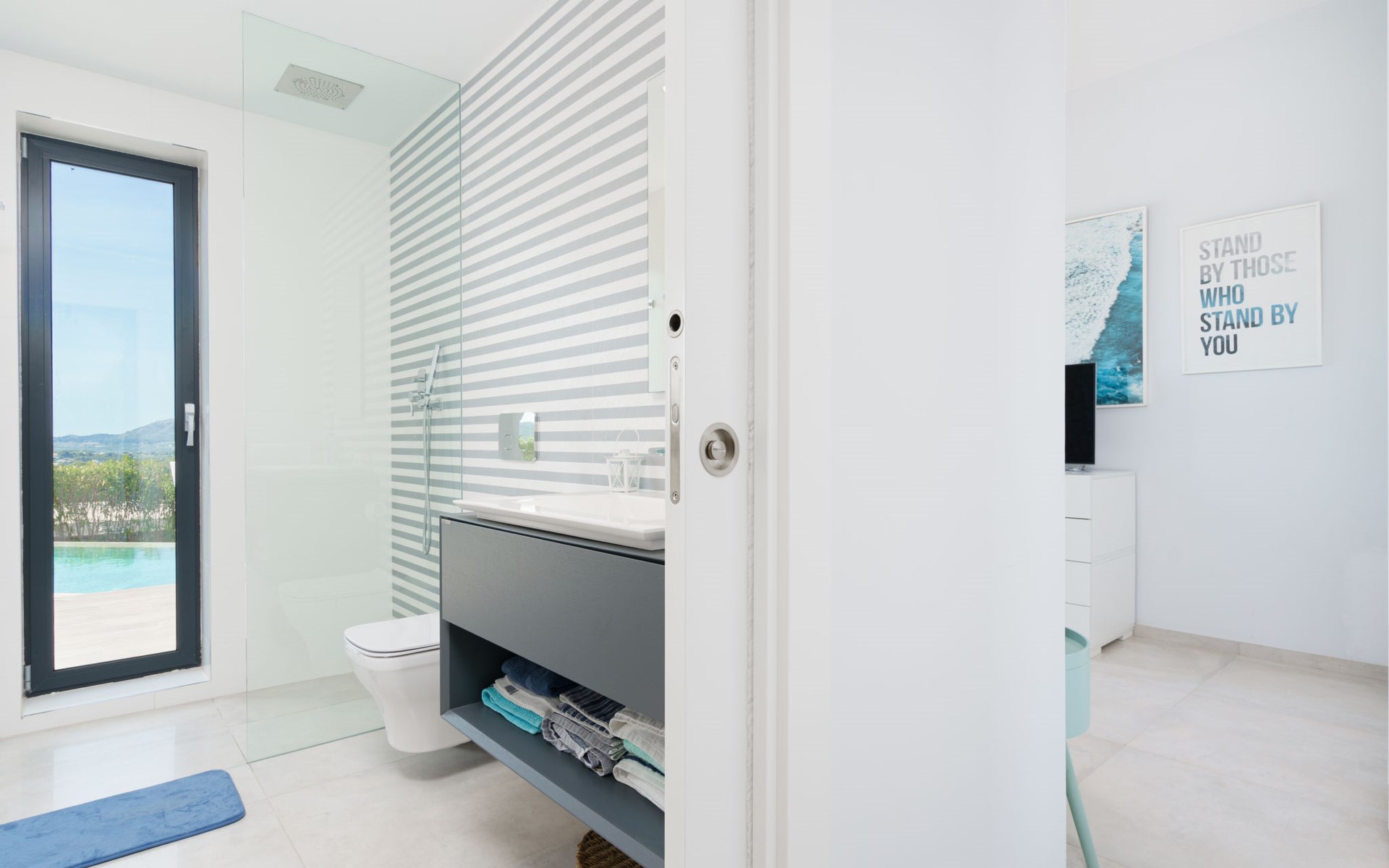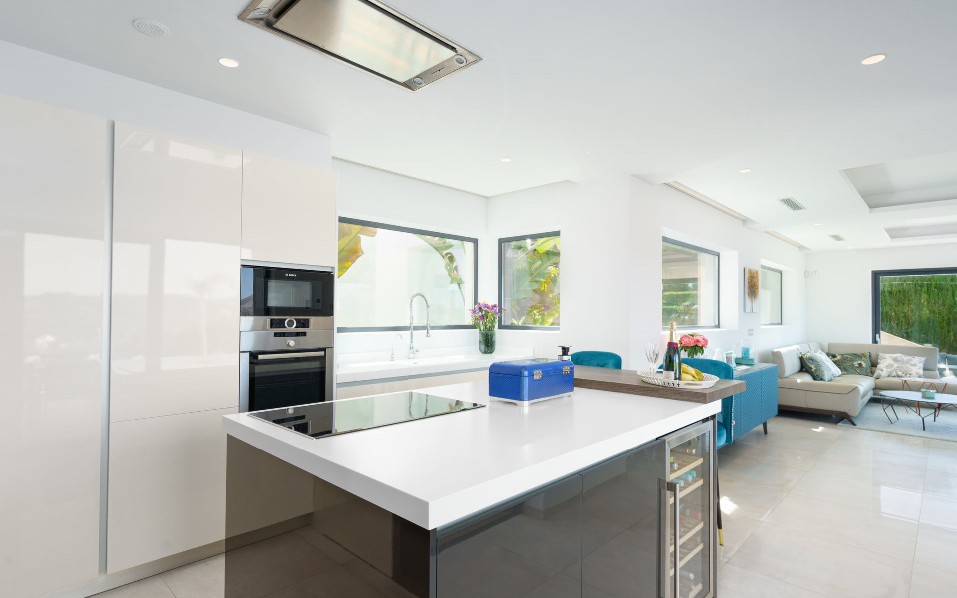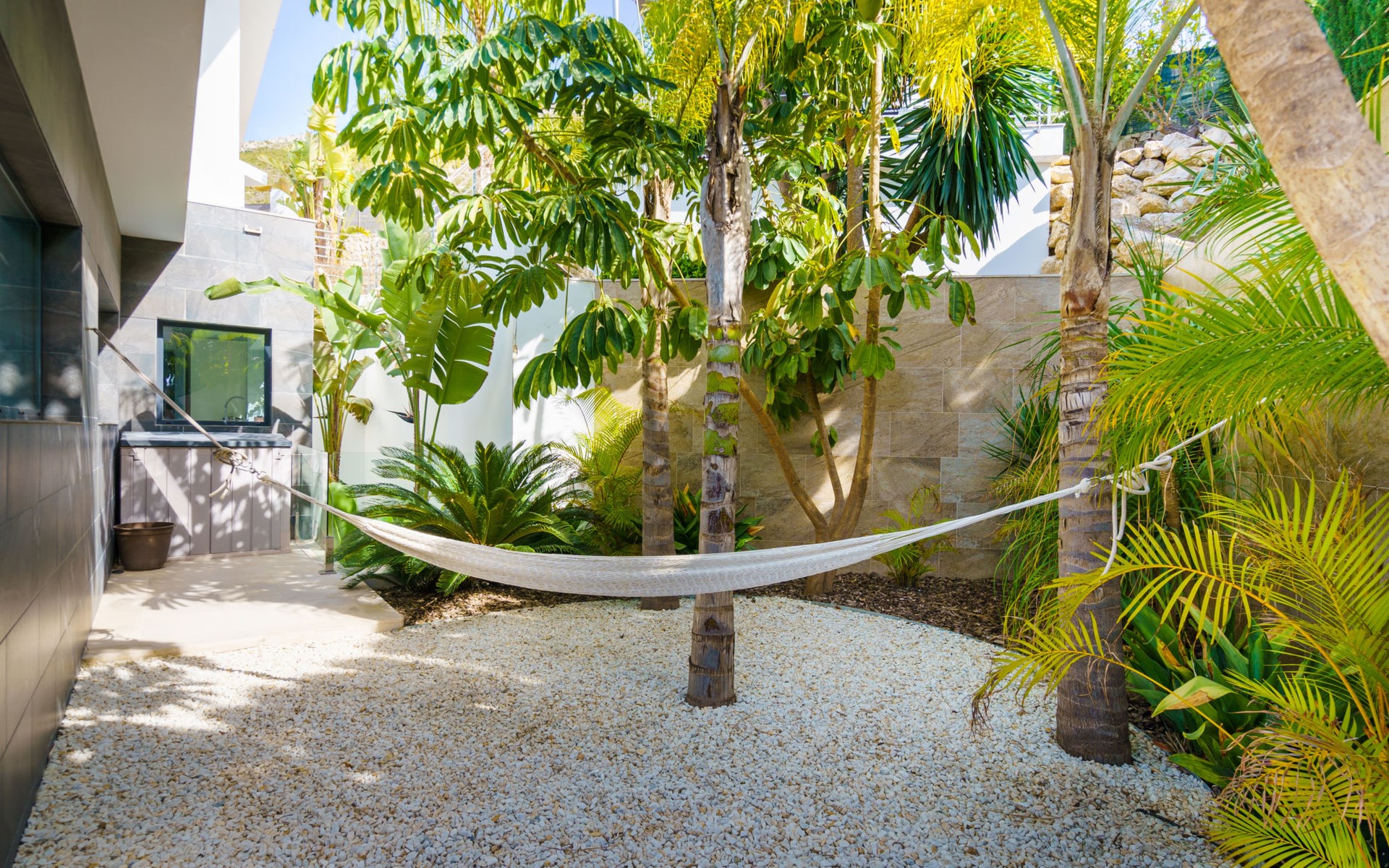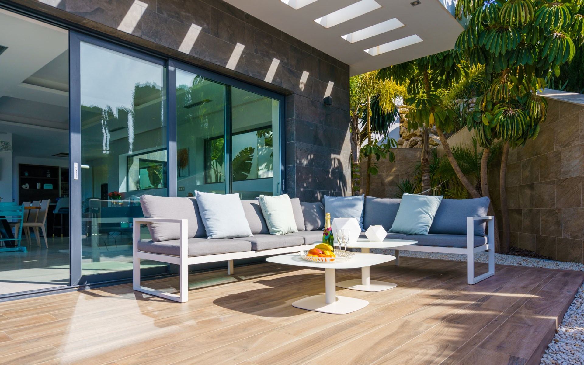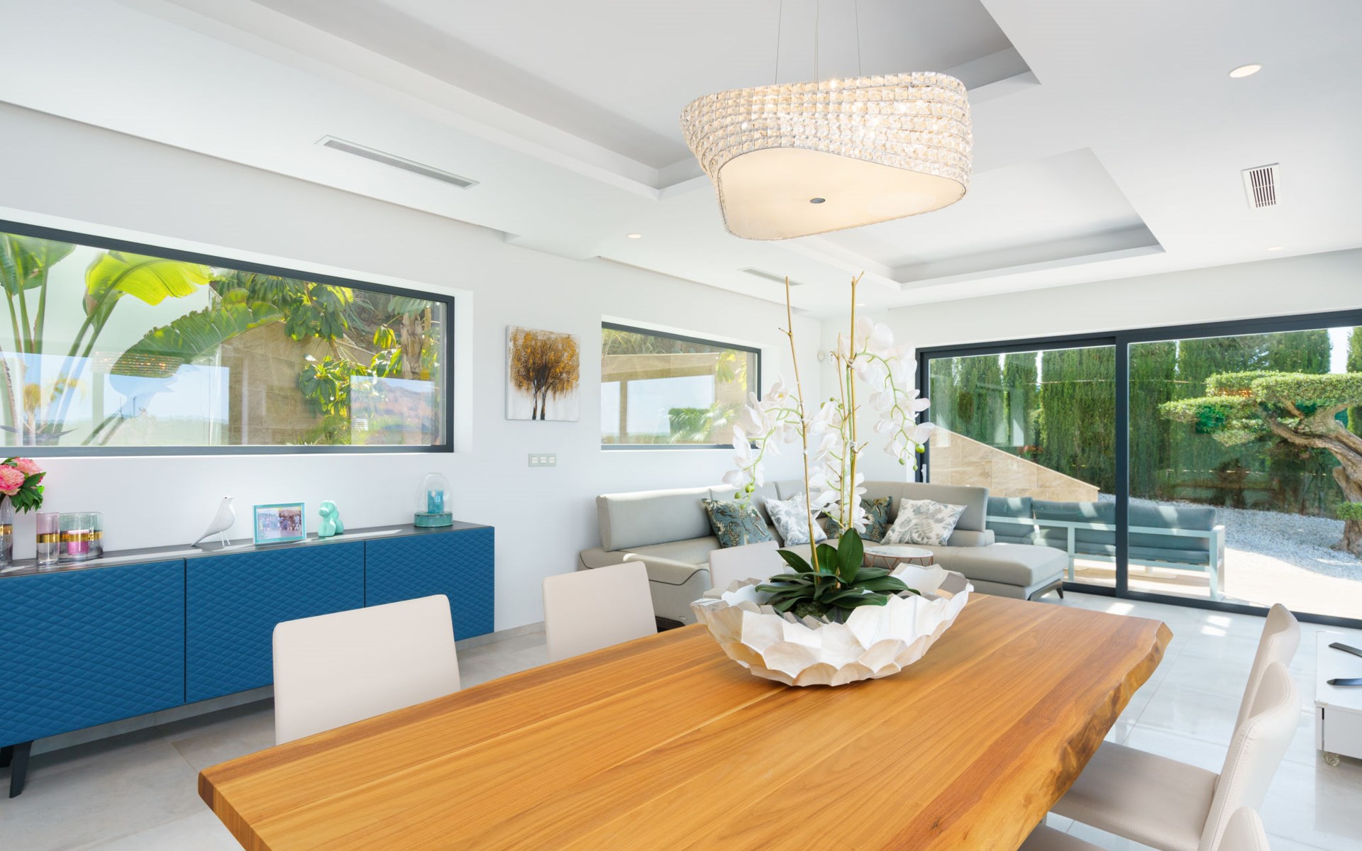 Very large, very modern, very luxurious villa "Adonia", 3 storeys. In the district of Cansalades Park Monte Olimpo 5 km from the centre of Jávea - El Arenal, 8 km from the centre of Moraira, in a quiet, sunny position, 5 km from the sea, 5 km from the beach. Private: large, beautiful, well-kept terraced garden with lawn and wildlife garden, swimming pool angular (10 x 4 m, depth 40 - 180 cm, seasonal availability: 01.Jan. - 31.Dec.) with internal staircase. Outdoor shower, pergola, terrace, garden furniture, barbecue. In the house: central heating system, air conditioning, burglar alarm system. Bumpy motor access to the house. Parking (for 2 cars) on the premises. Supermarket 2.5 km, restaurant 1 km, bar 2.5 km, bakery 2.5 km, café 2.5 km, bus stop "Parada Arenal" 5.2 km, sandy beach "El Arenal" 5 km, shingle beach "La Granadella" 10 km. Sports harbour 6 km, marina 6 km, golf course (9 hole) 3 km, surf school 5 km, sailing school 5 km. Please note: car recommended. The owner does not accept any youth groups.