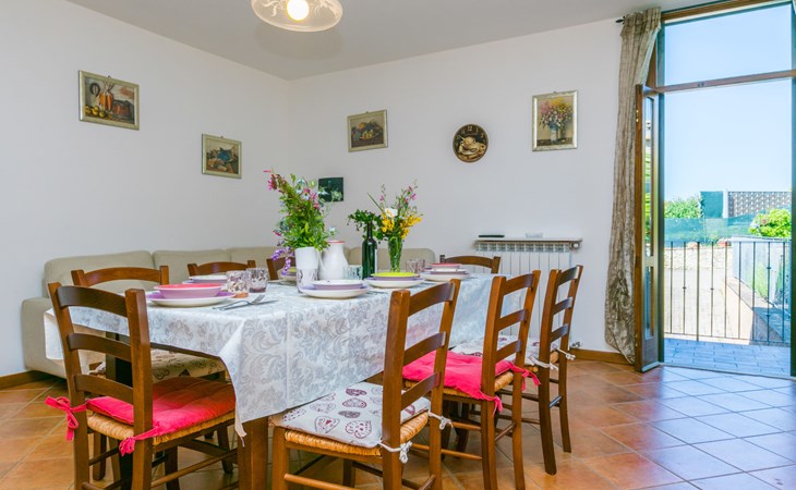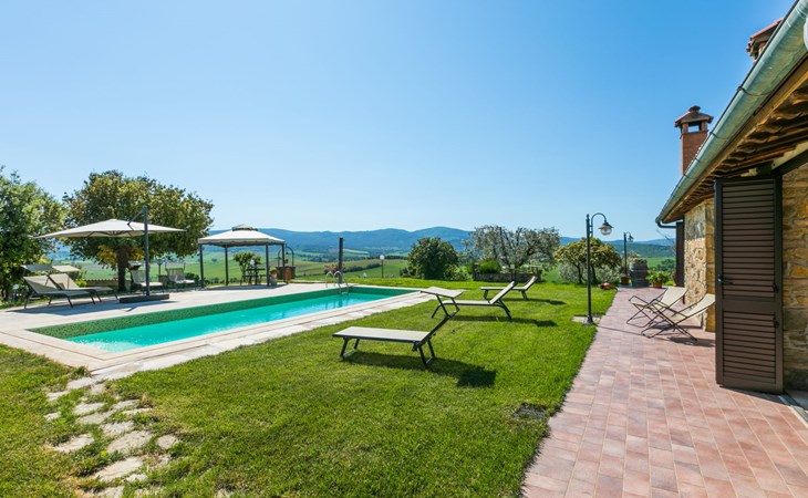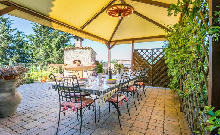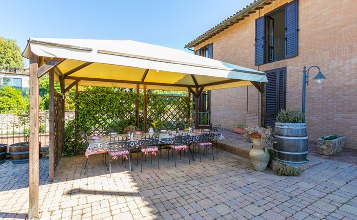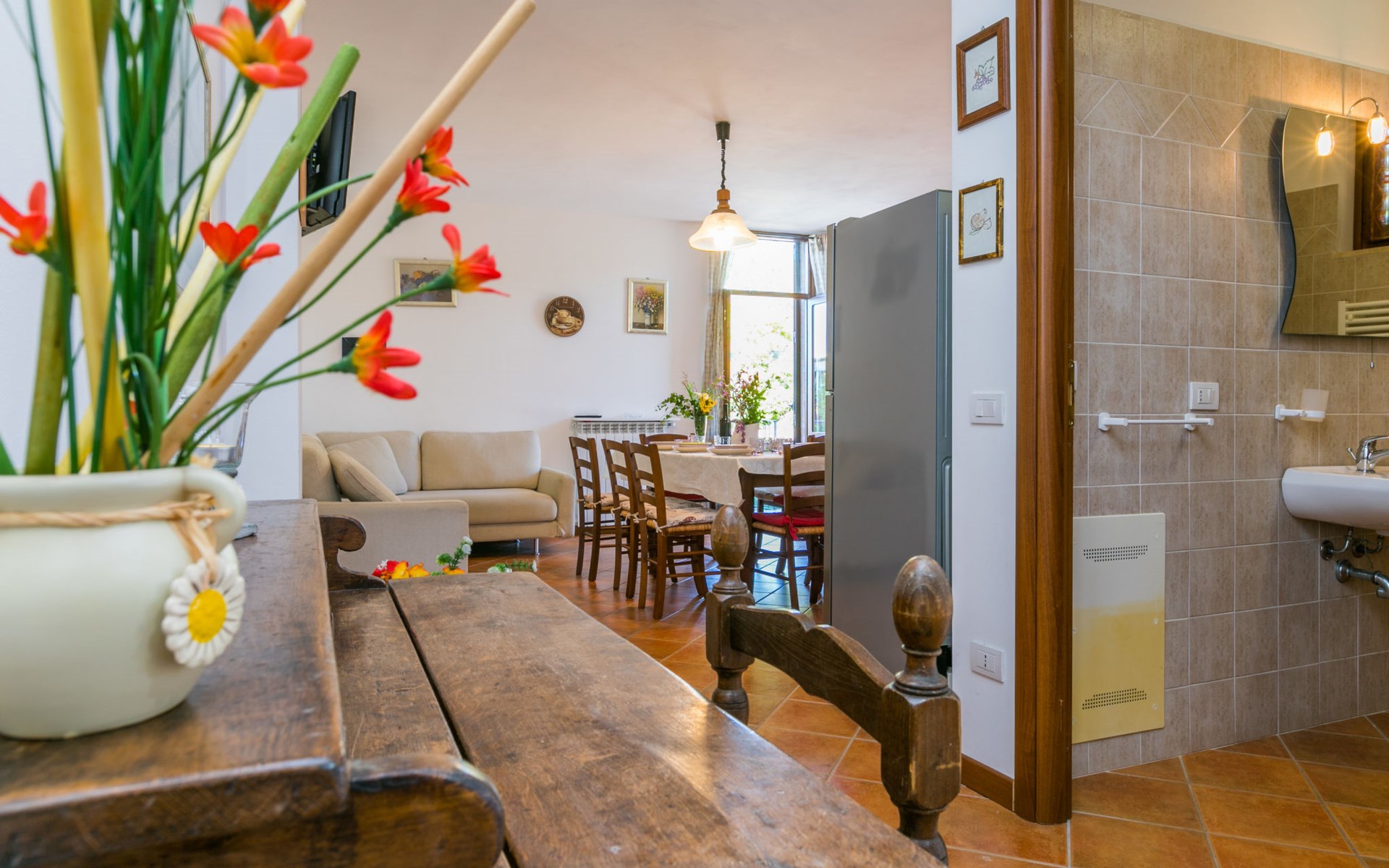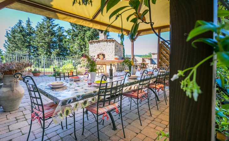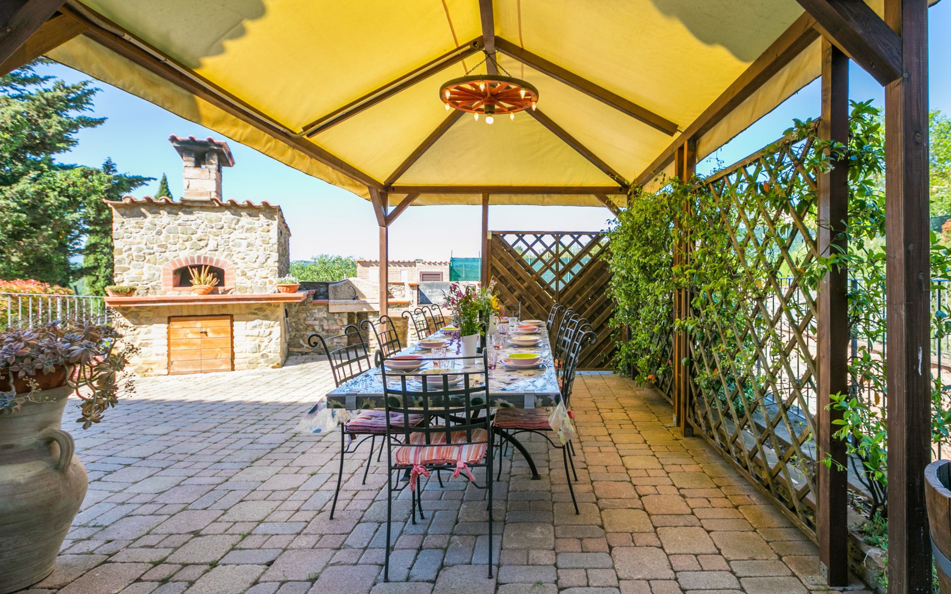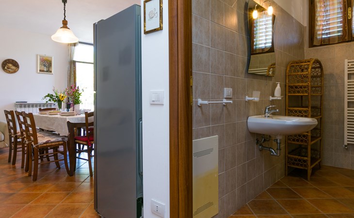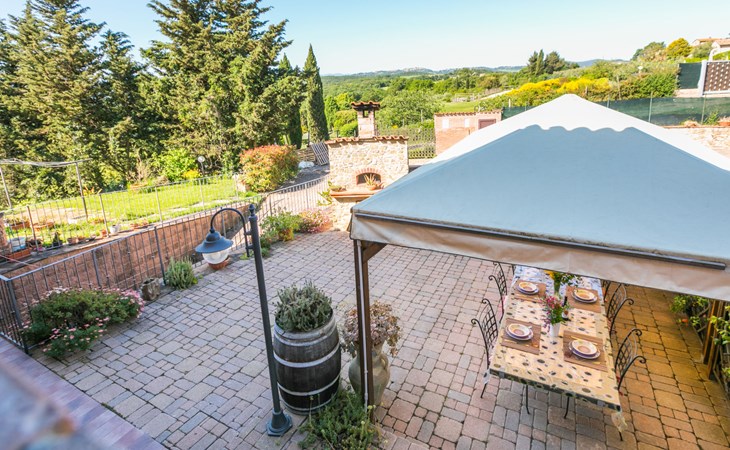 Lano 10 km from Colle di Val d'Elso: Beautiful semi-detached house "Metallo", detached, surrounded by trees, meadows and fields. In the hamlet Lano 10 km from the centre of Colle di Val d'Elsa, 5 km from the centre of Casole d'Elsa, 25 km from the centre of Siena, in an elevated position on a slope. For shared use: terraced garden, 1 ha (fenced) with plants and trees, meadow. Private: swimming pool (10 x 3 m, depth 140 - 180 cm, seasonal availability: 15.May. - 05.Oct.). Outdoor shower, arbour, terrace, garden furniture, barbecue, pool maintenance by the owner/gardener. Motor access (200 m via unmade road). Parking on the premises. Grocery 5 km, supermarket 10 km, restaurant 5 km, bus stop 1.5 km, railway station "Poggibonsi" 15 km, sandy beach "Cecina Mare" 67 km. Nearby attractions: San Gimignano 24 km, Siena 31 km, Firenze 70 km. Please note: baby equipment (included). Groups of teenagers on request only. Residence with electric gates. Owner lives in separate semi-detached house.