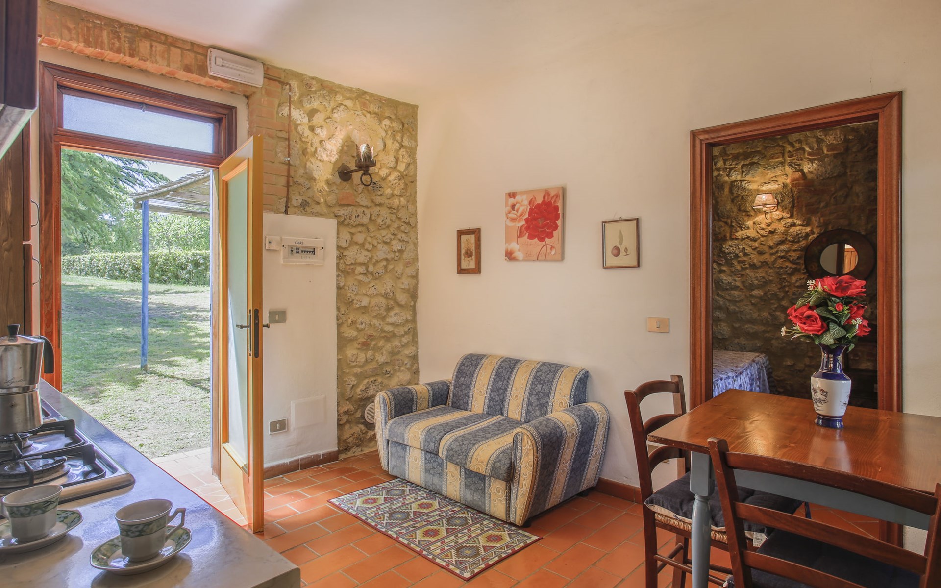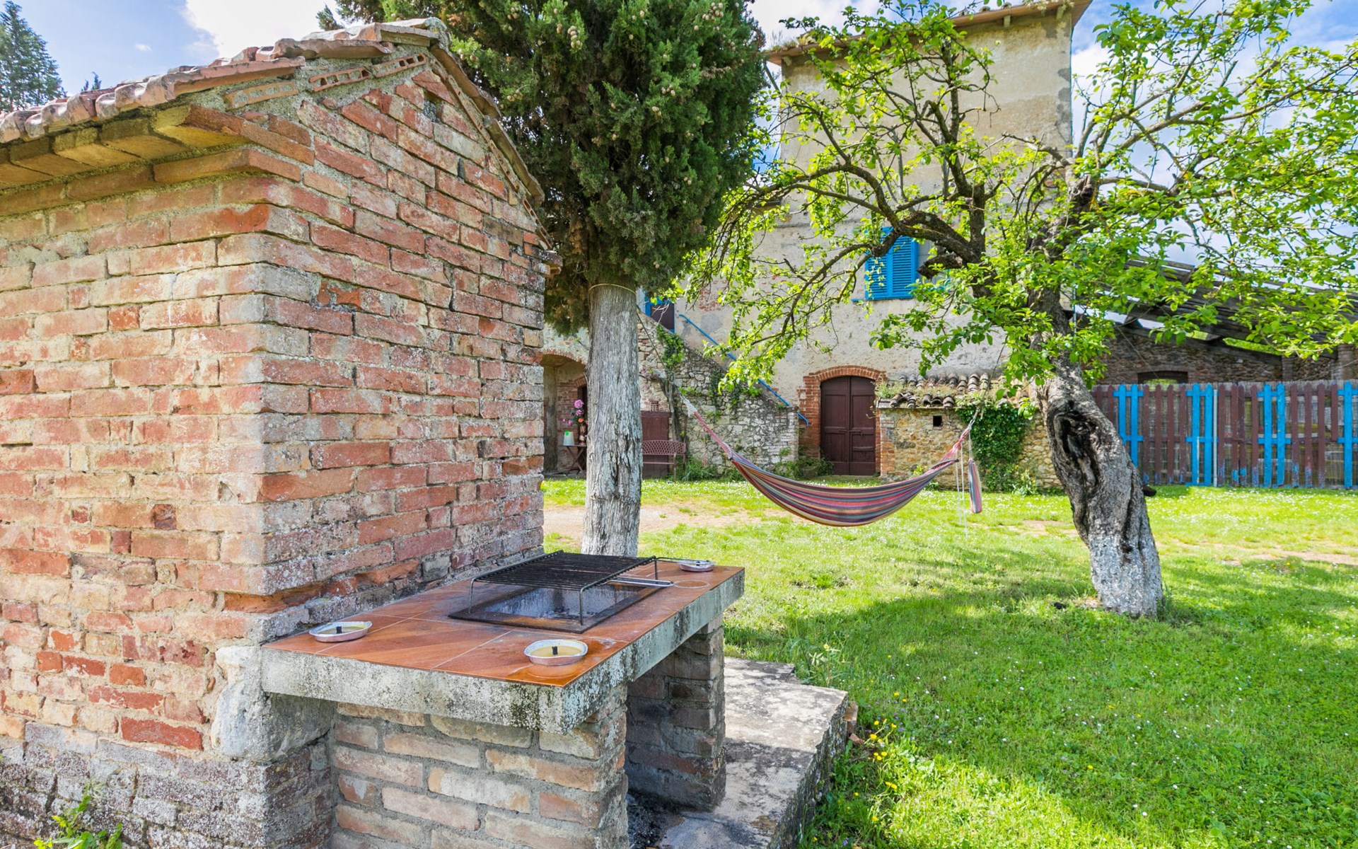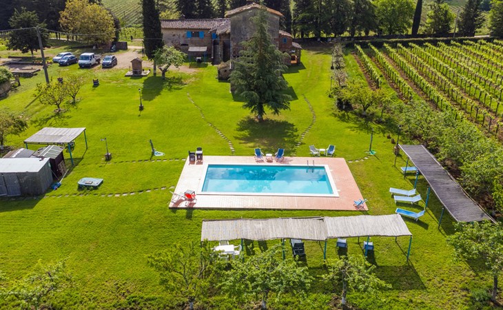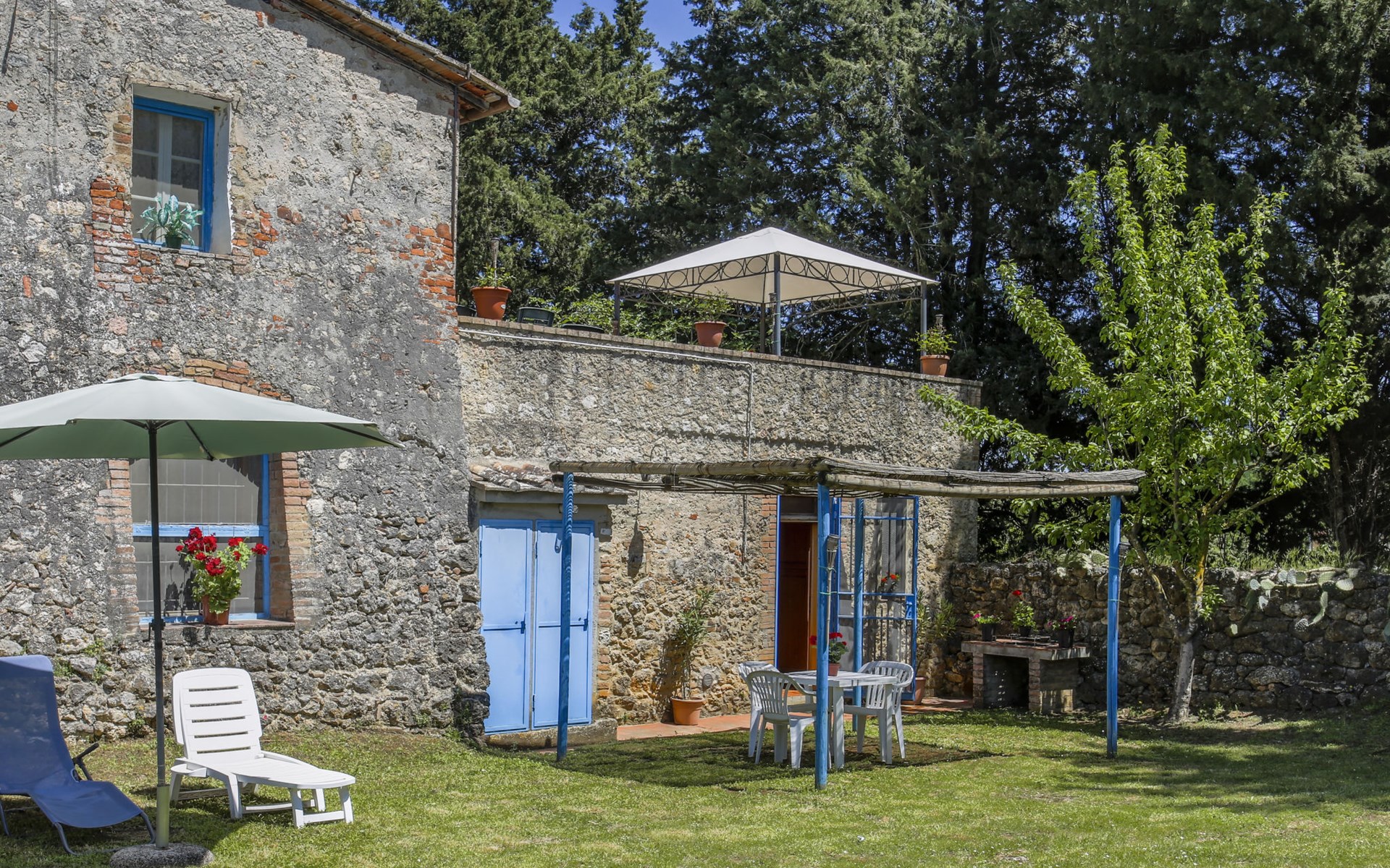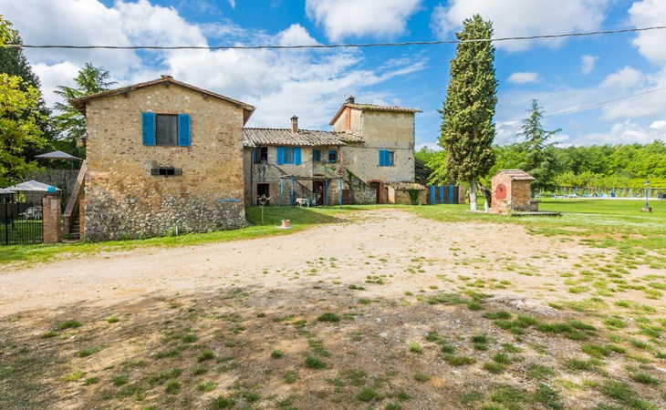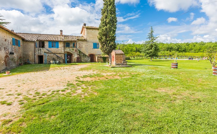Monteriggioni: Rustic farmhouse "Fattoria Petraglia", detached from the 15th century, surrounded by trees, meadows and vineyards. 6 apartments in the property. 2.2 km from the centre of Monteriggioni, 12 km from the centre of Siena, 33 km from the centre of San Gimignano, in a quiet, sunny position, 90 km from the sea, in the countryside. For shared use: natural state property 50 ha with plants and trees, natural garden, meadow, swimming pool (10 x 5 m, seasonal availability: 01.May. - 10.Oct.). Outdoor shower, pergola, terrace, garden furniture, barbecue, pool maintenance by the owner/gardener. In the house: washing machine (for shared use, extra). 100 m long motor access (via unmade road). Parking on the premises. Grocery 2.2 km, supermarket 12 km, bus stop 2.2 km, railway station "Siena" 12 km. Nearby attractions: Castellina in Chianti 20 km, Radda in Chianti 24 km, Montalcino 45 km, Volterra 50 km, Firenze 70 km. Please note: baby equipment (included). All houses/apartments are individually designed/furnished.
