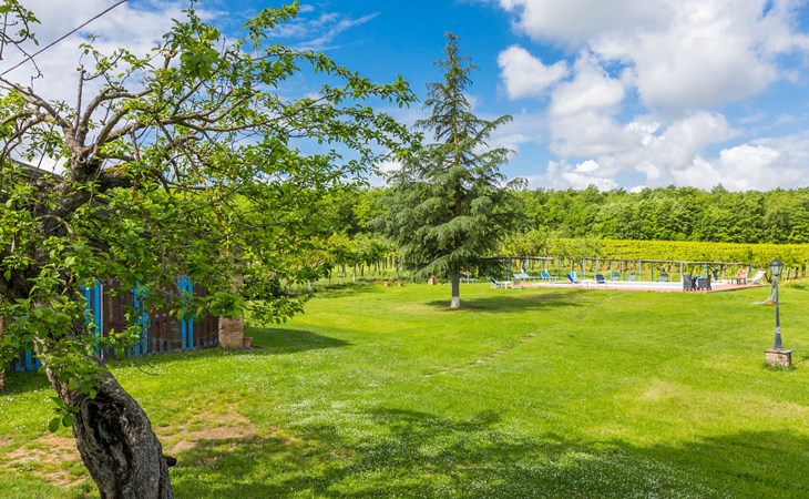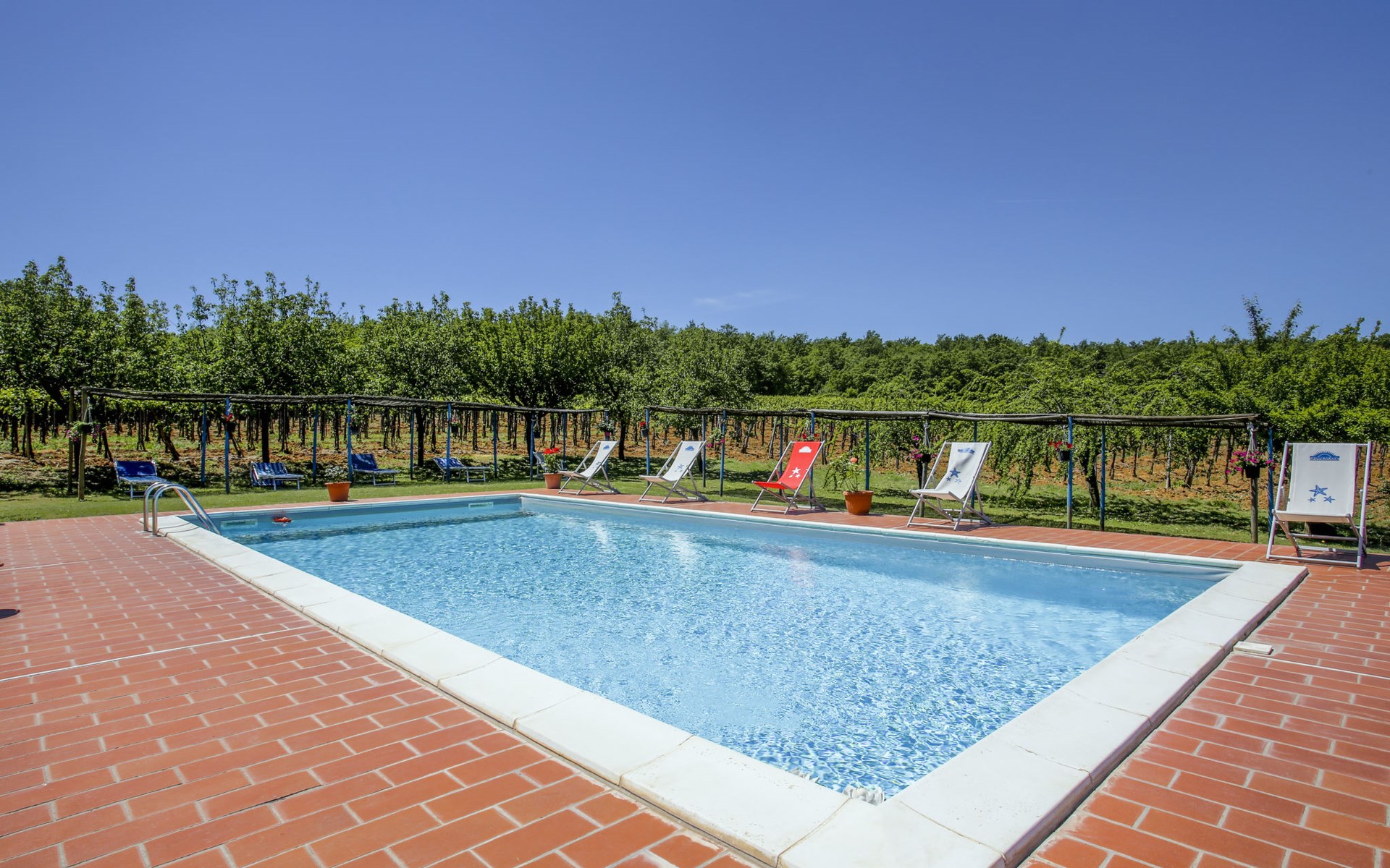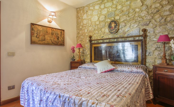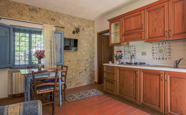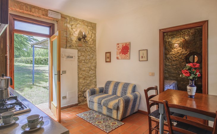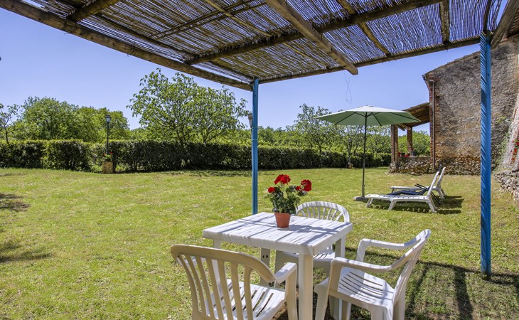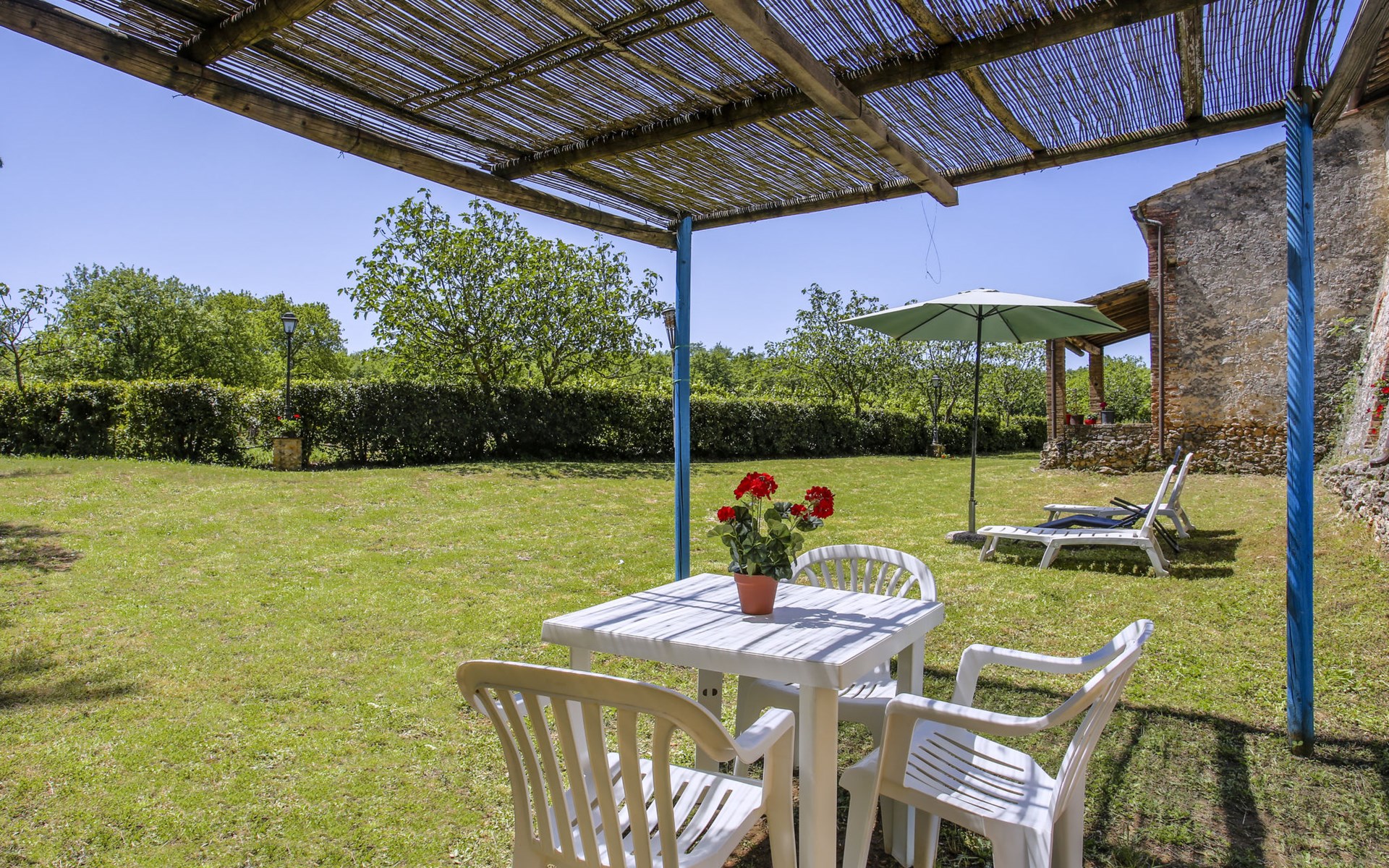Monteriggioni: Rustic farmhouse "Fattoria Petraglia", detached from the 15th century, surrounded by trees, meadows and vineyards. 6 apartments in the property. 2.2 km from the centre of Monteriggioni, 12 km from the centre of Siena, 33 km from the centre of San Gimignano, in a quiet, sunny position, 90 km from the sea, in the countryside. For shared use: natural state property 50 ha with plants and trees, natural garden, meadow, swimming pool (10 x 5 m, seasonal availability: 01.May. - 10.Oct.). Outdoor shower, pergola, terrace, garden furniture, barbecue, pool maintenance by the owner/gardener. In the house: washing machine (for shared use, extra). 100 m long motor access (via unmade road). Parking on the premises. Grocery 2.2 km, supermarket 12 km, bus stop 2.2 km, railway station "Siena" 12 km. Nearby attractions: Castellina in Chianti 20 km, Radda in Chianti 24 km, Montalcino 45 km, Volterra 50 km, Firenze 70 km. Please note: baby equipment (included). All houses/apartments are individually designed/furnished.