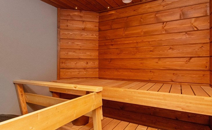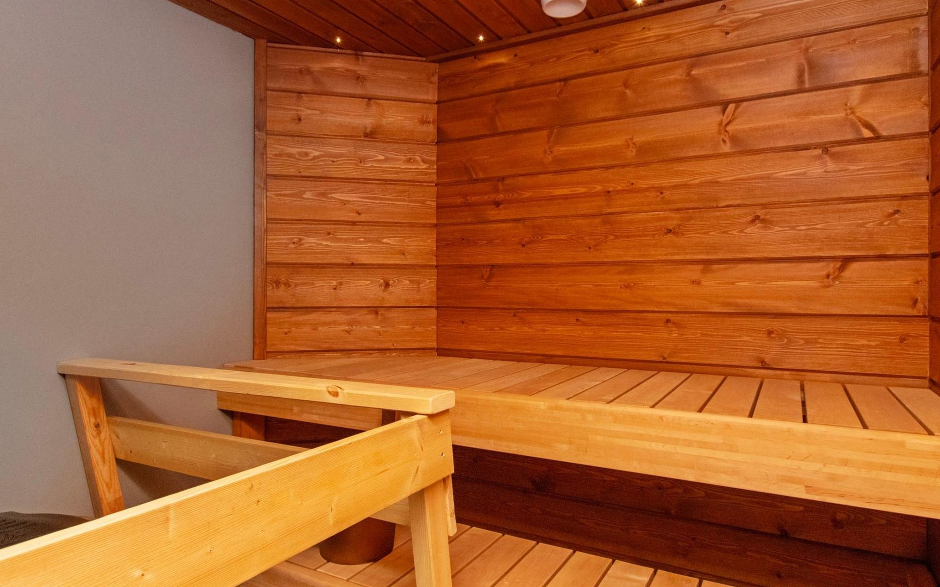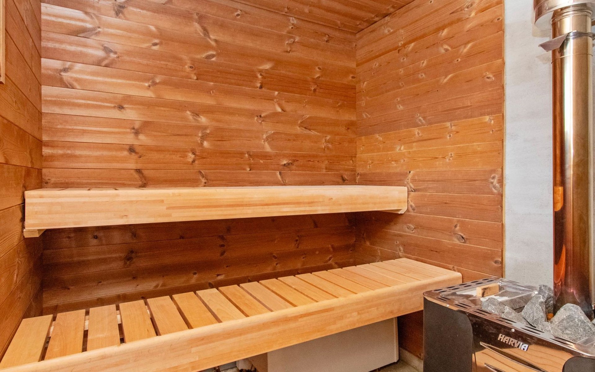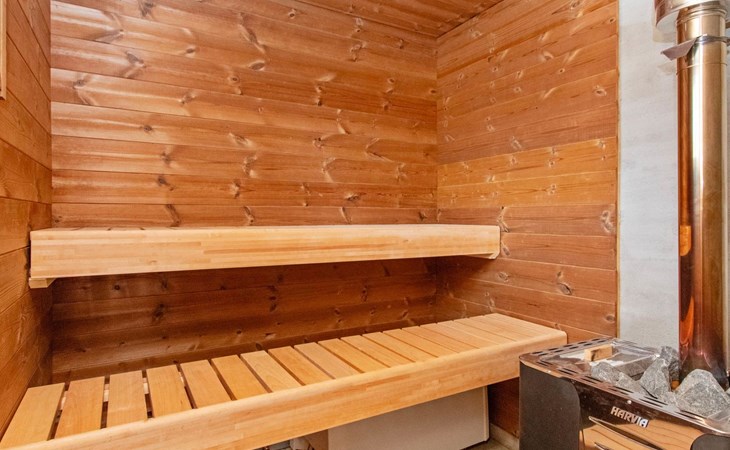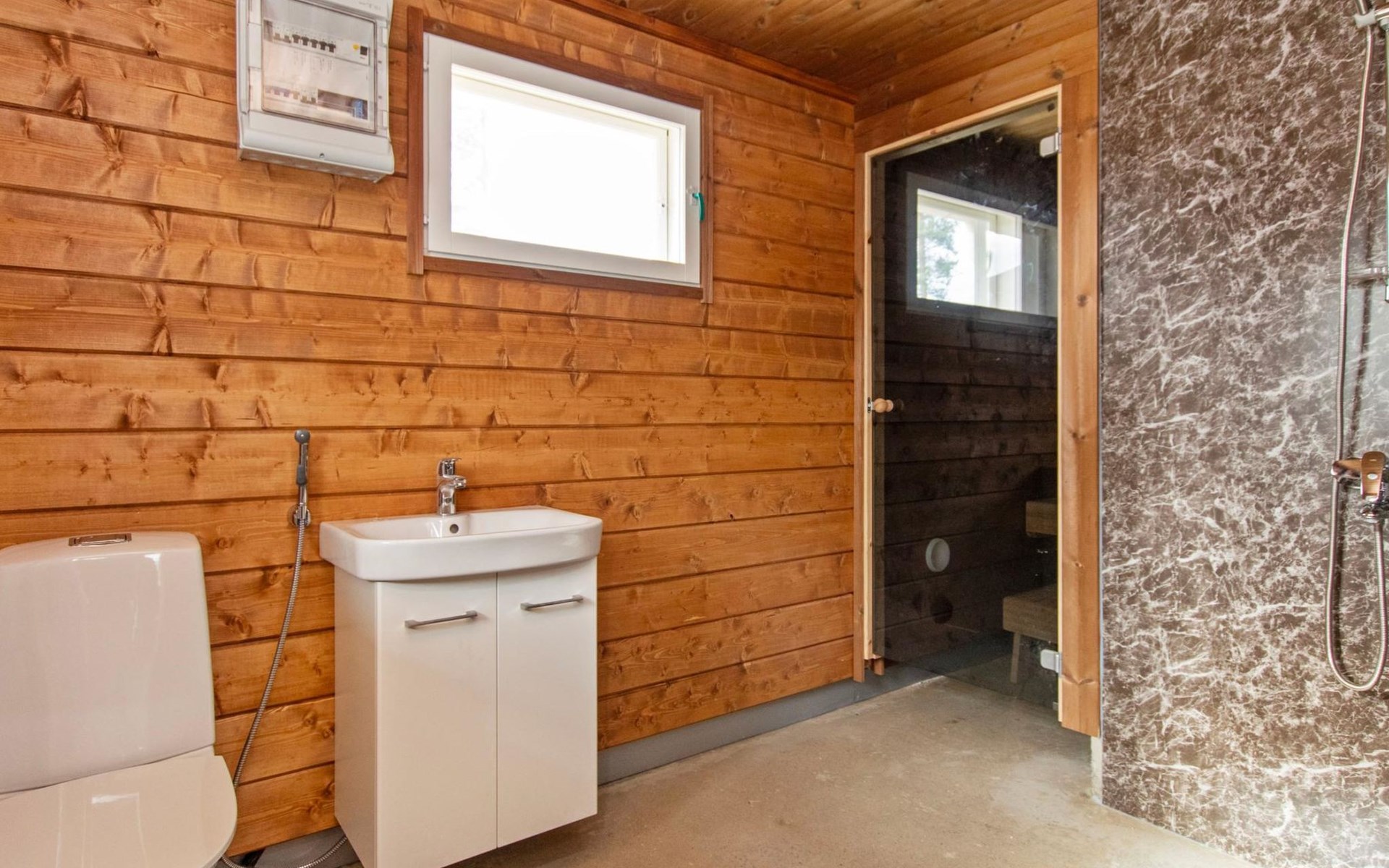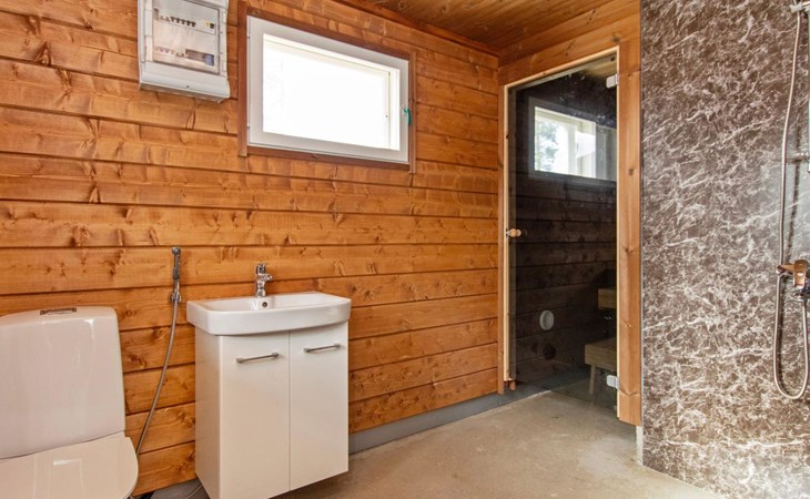The lakeside sauna (2023) includes a dressing room, WC, shower, and wood-heated sauna stove. There is a covered patio.