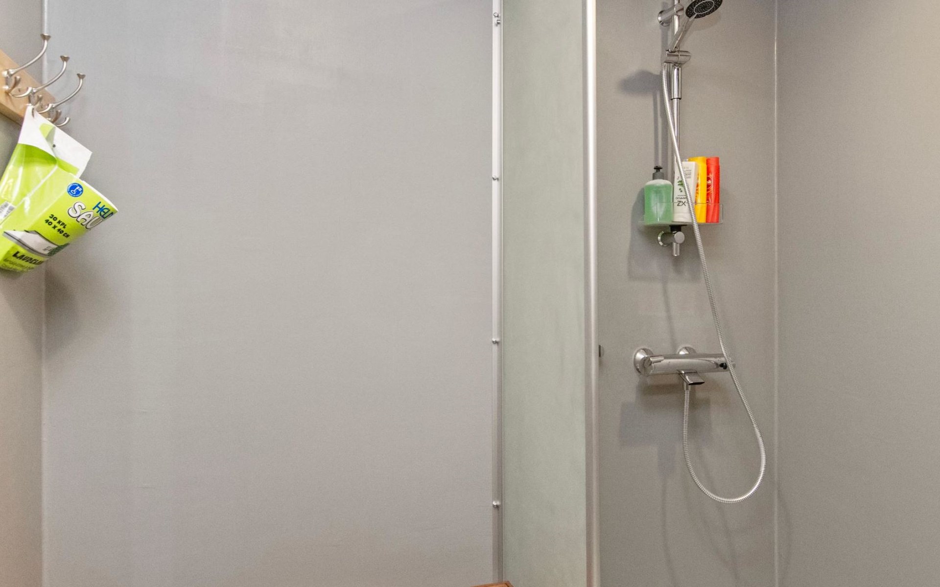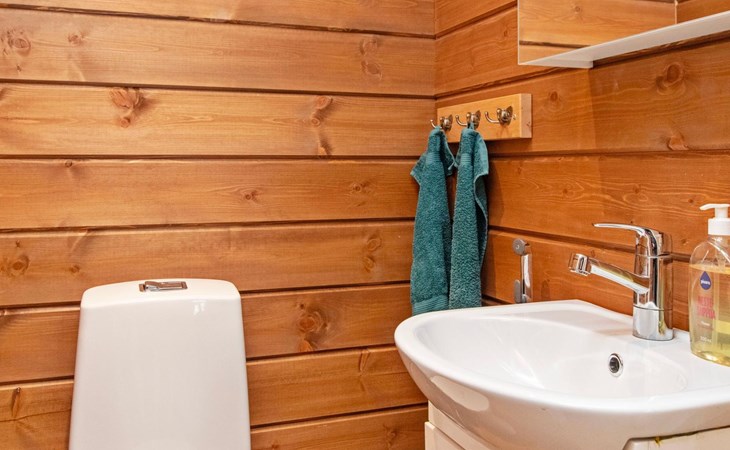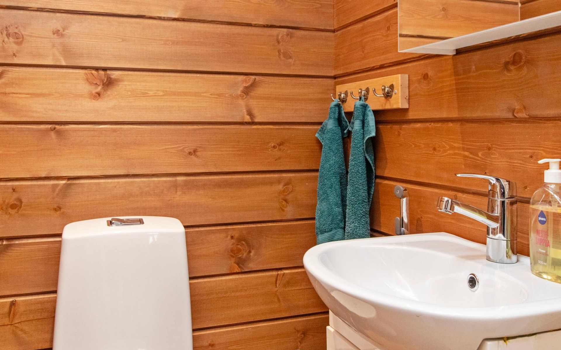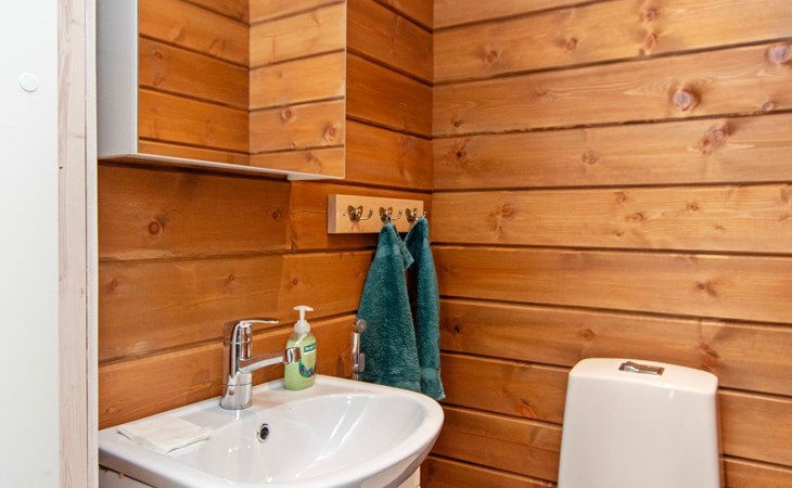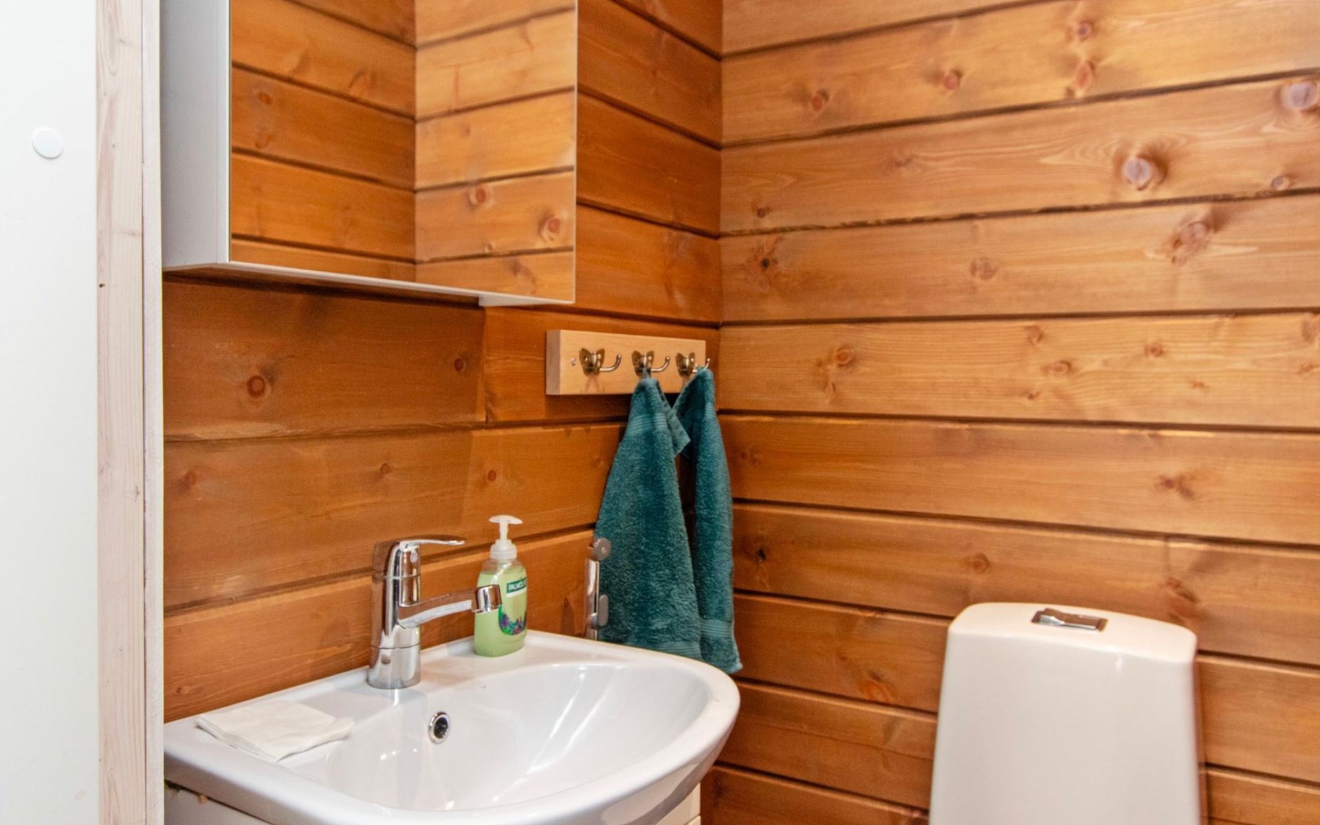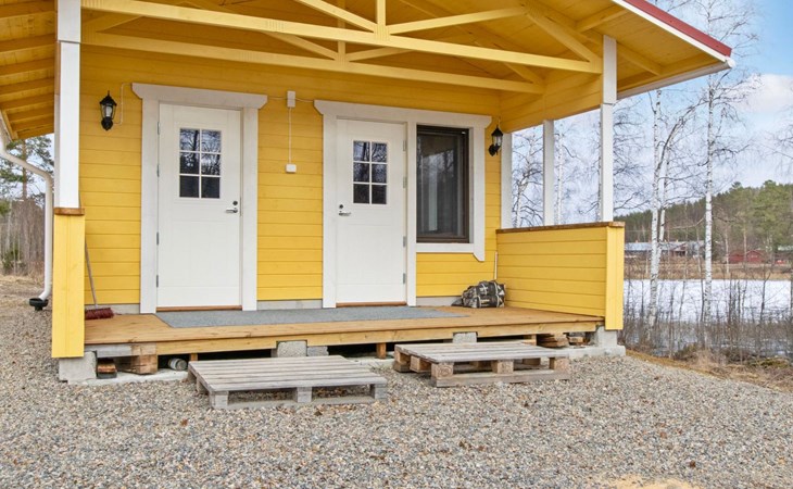 The lakeside sauna (2023) includes a dressing room, WC, shower, and wood-heated sauna stove. There is a covered patio.