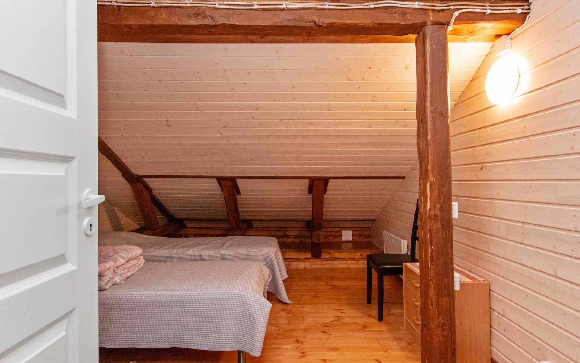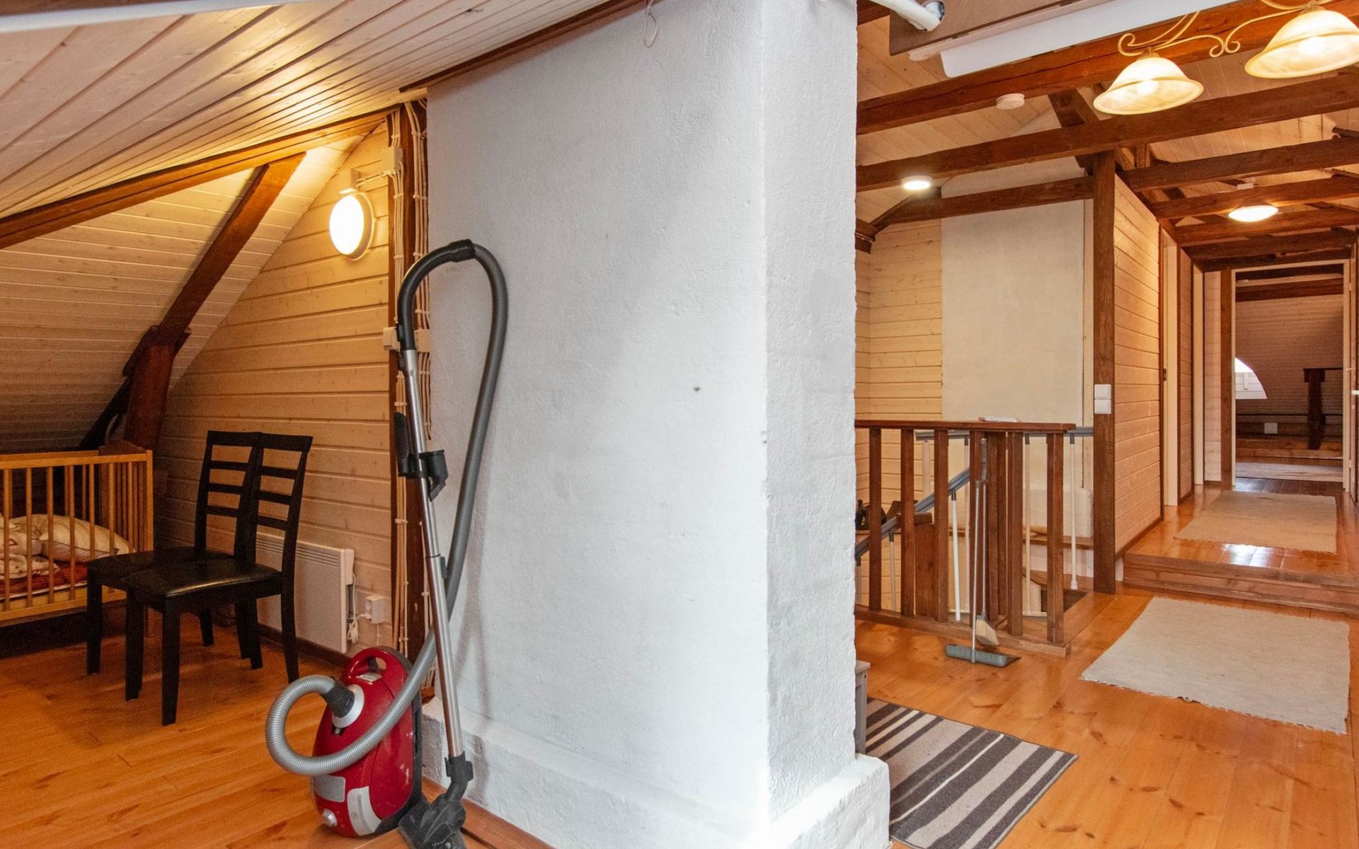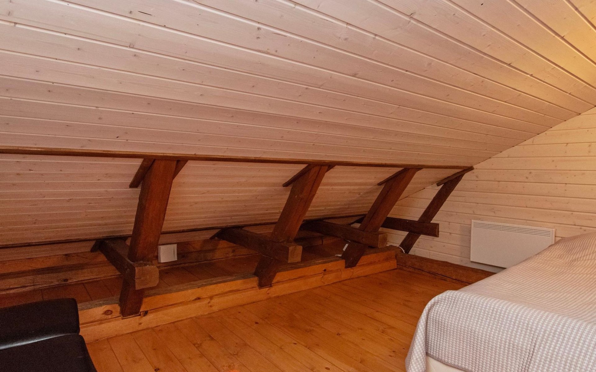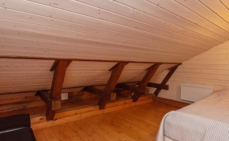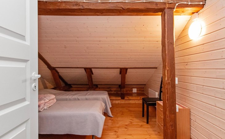 On the upper floor, there is a hall and five bedrooms. Bedroom 3 has one bed, bedroom 4 has two beds, bedroom 5 has two beds, bedroom 6 has two beds, and bedroom 7 has one bed. Some of the bedrooms do not have windows, and there is a WC. Access to the upper floor is available both from inside and directly from outside.