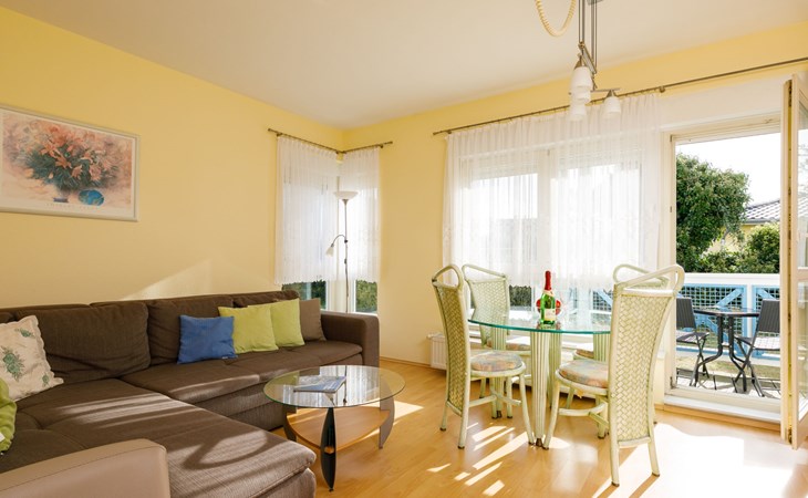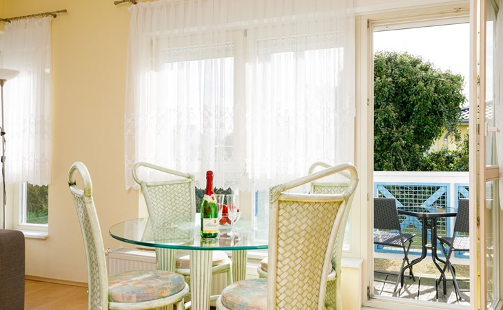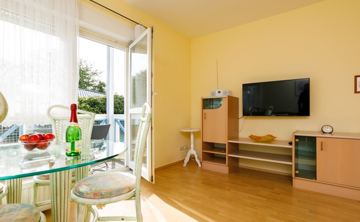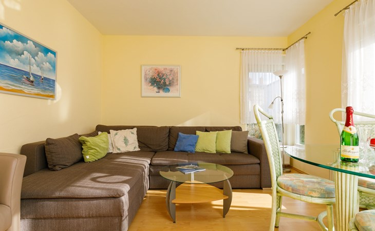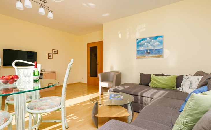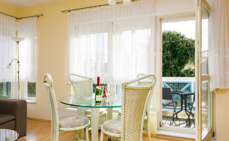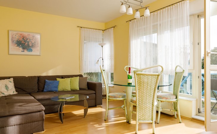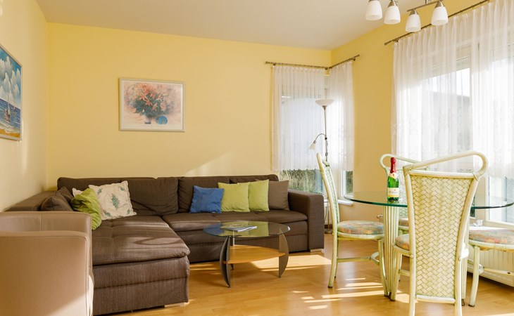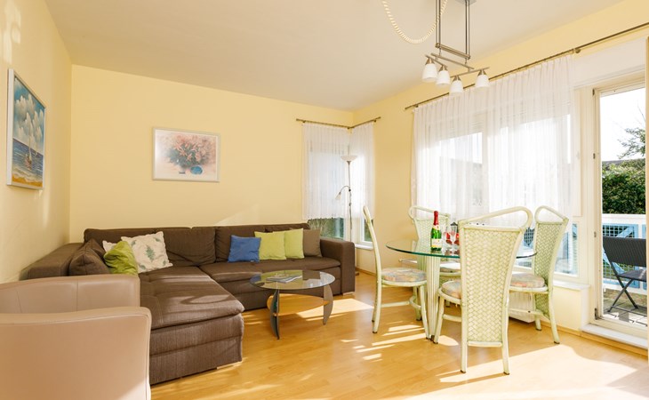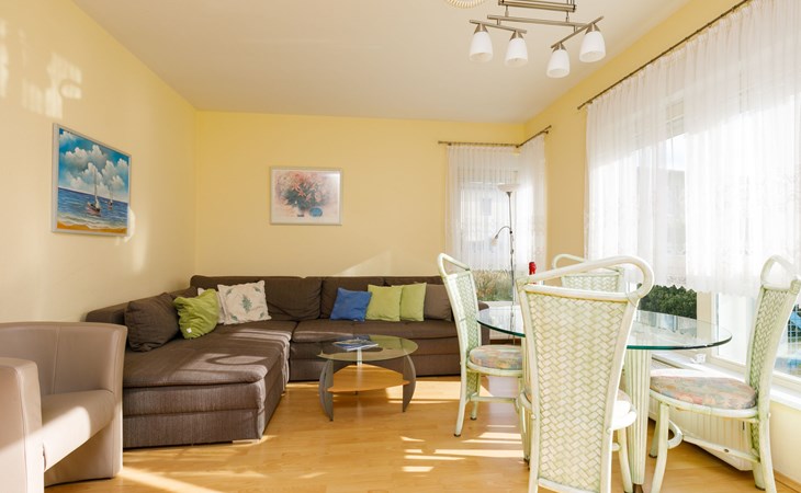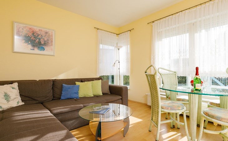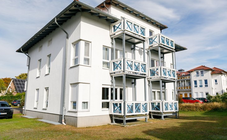 Apartment block, 2 storeys. In the resort 750 m from the centre of Koserow, 900 m from the sea, 900 m from the beach. In the house: central heating system. Parking on the premises. Supermarket 1 km, restaurant 200 m, bakery, café 150 m, bus stop 900 m, railway station 1.3 km, sandy beach 900 m, thermal baths "Bernsteintherme" 9 km. Golf course (18 hole) 18 km, surf school 9 km, minigolf 600 m.
