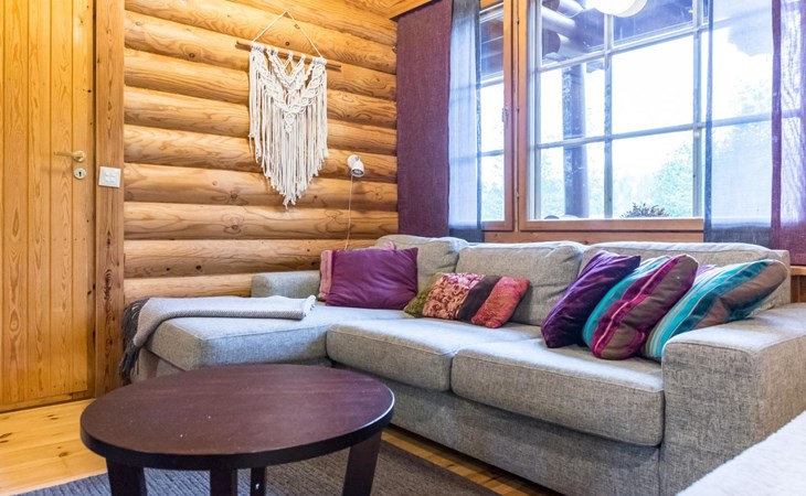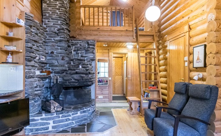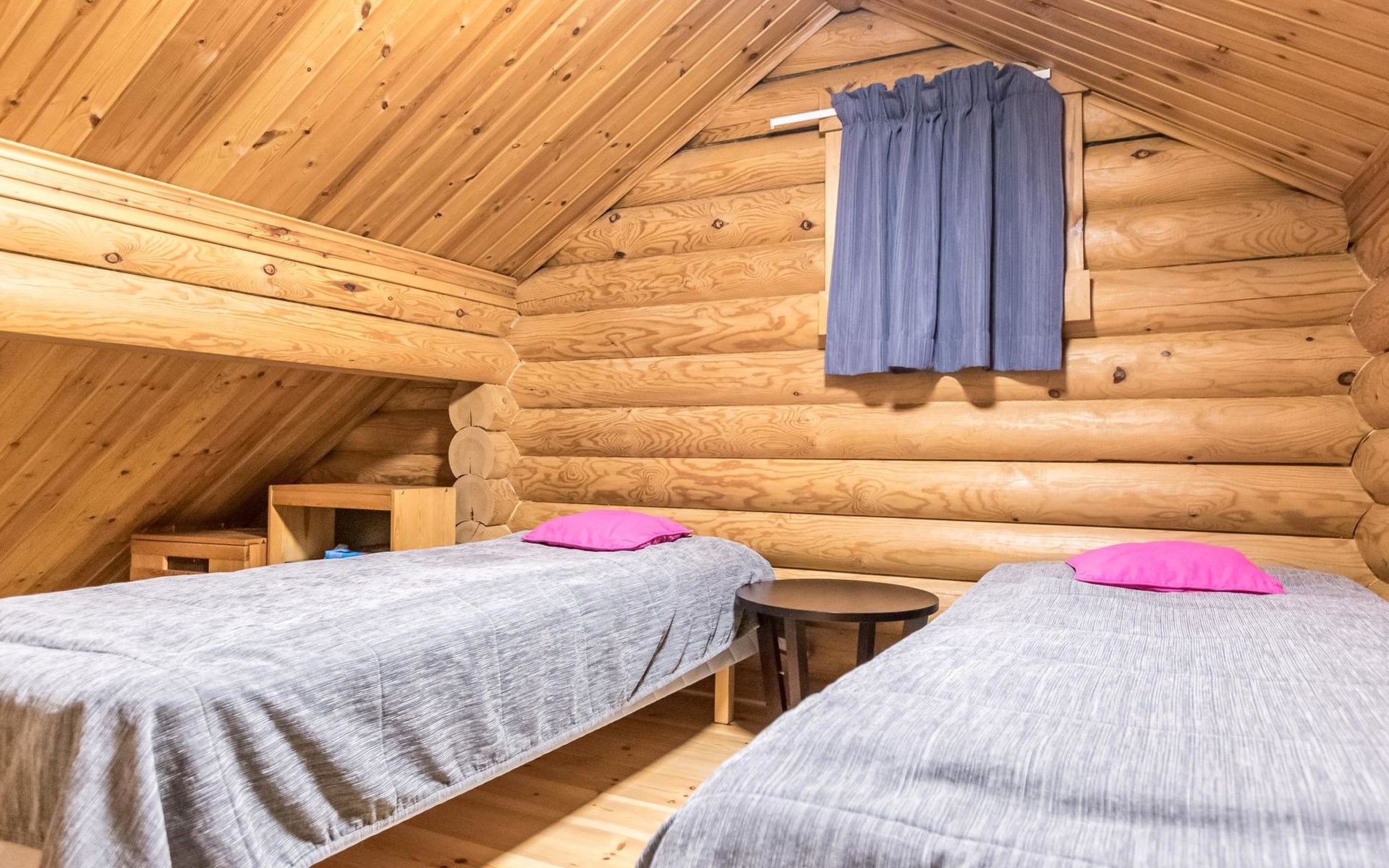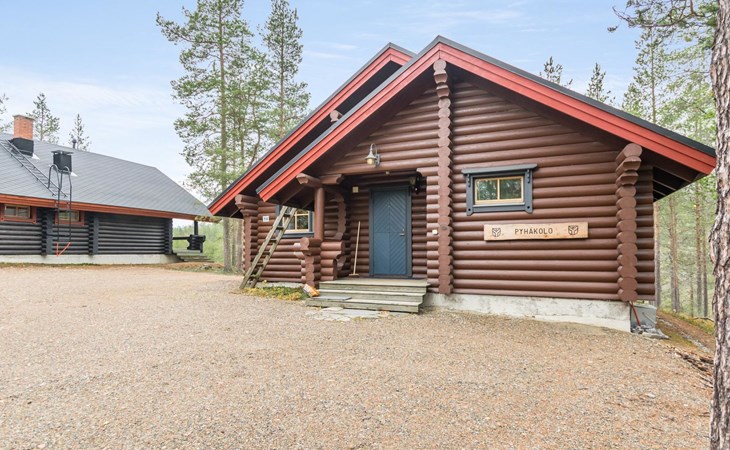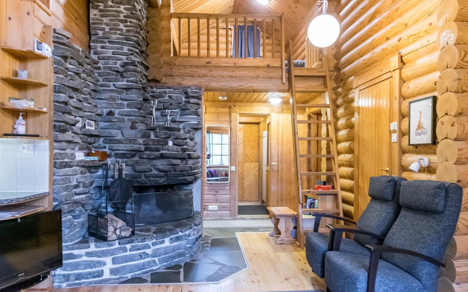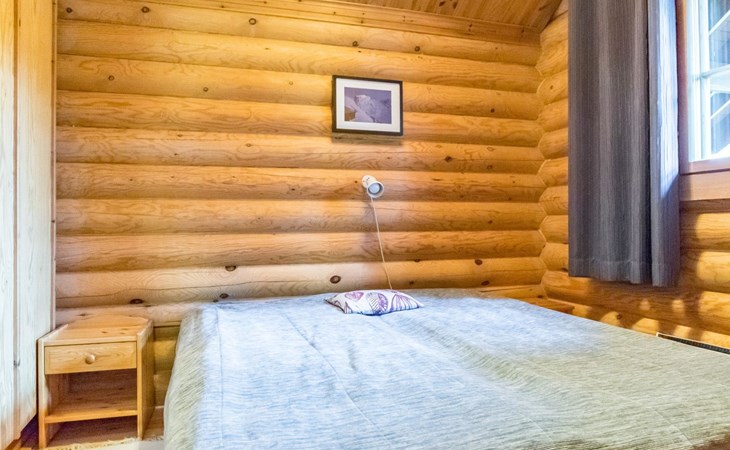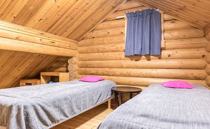 Round log cottage built in 1990. 50 km north from Kemijärvi. Downstairs kitchen/living room, two bedrooms (2 x 80 cm beds) and one bedroom with sofa-bed, WC, bathroom with two showers and sauna. Upstairs sleeping loft (2 x 80 cm bed). Large terrace.