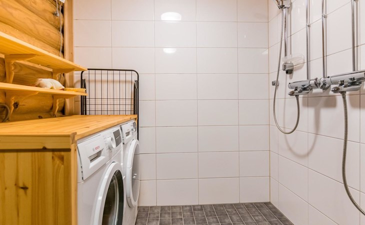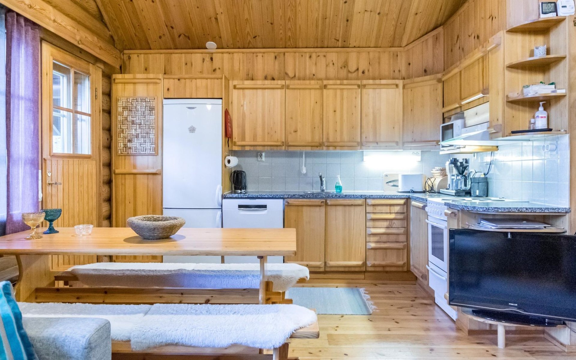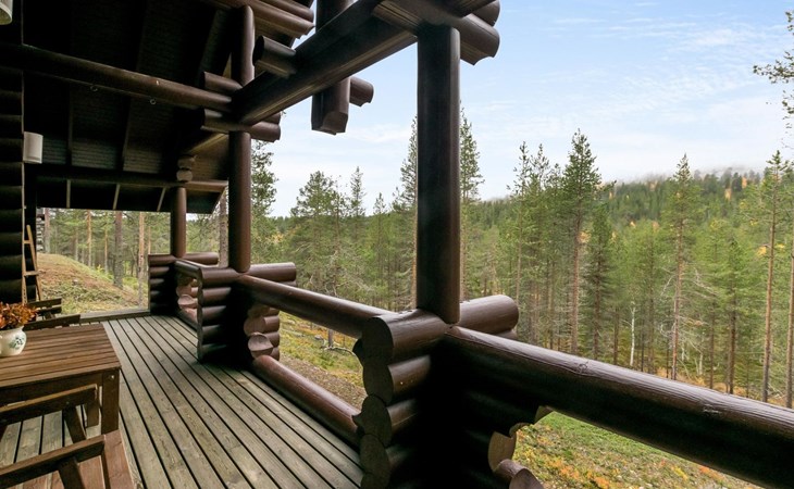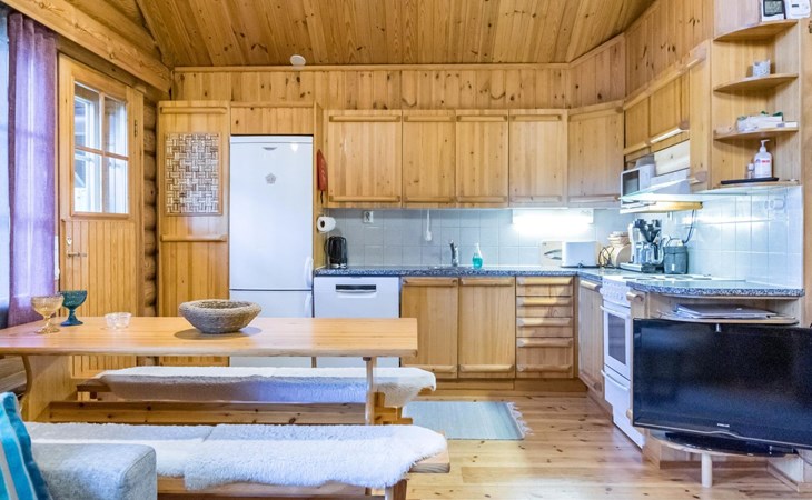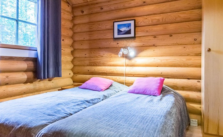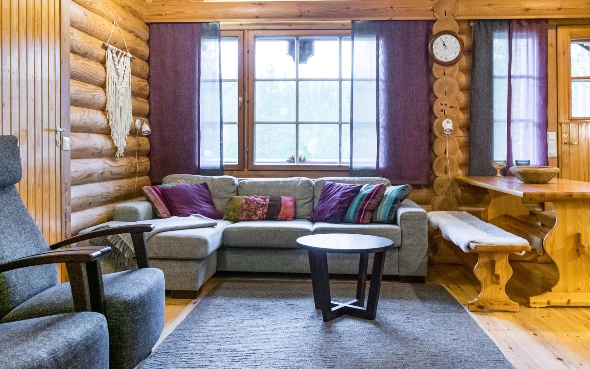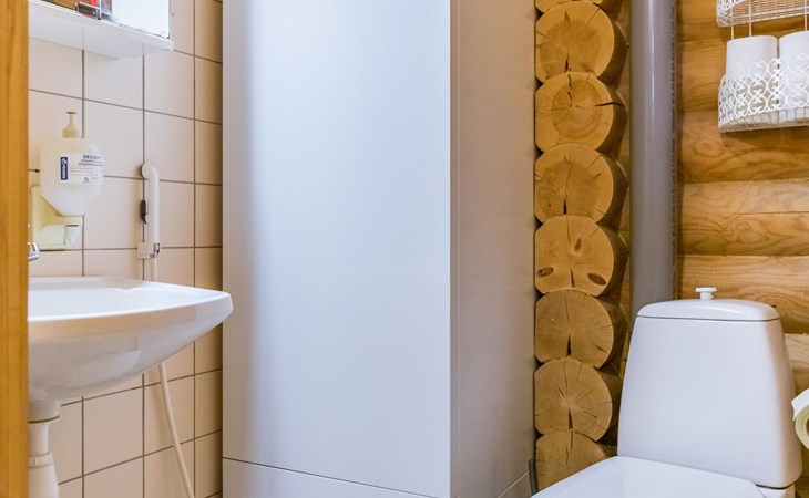 Round log cottage built in 1990. 50 km north from Kemijärvi. Downstairs kitchen/living room, two bedrooms (2 x 80 cm beds) and one bedroom with sofa-bed, WC, bathroom with two showers and sauna. Upstairs sleeping loft (2 x 80 cm bed). Large terrace.