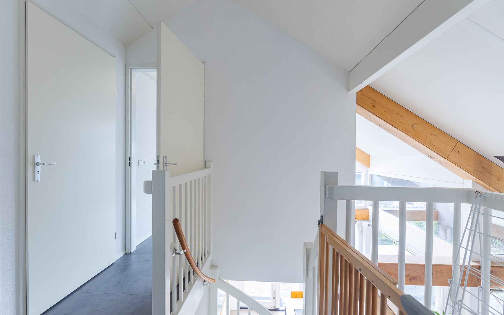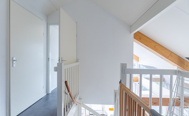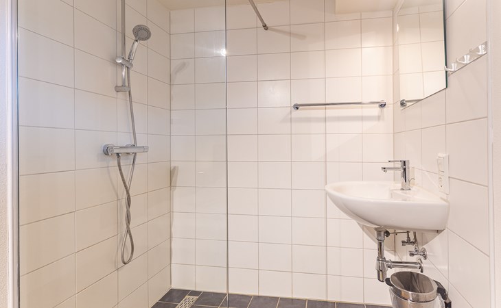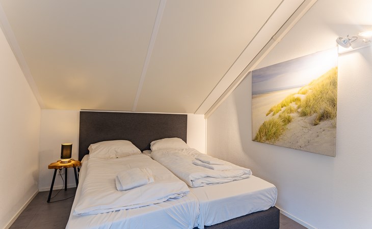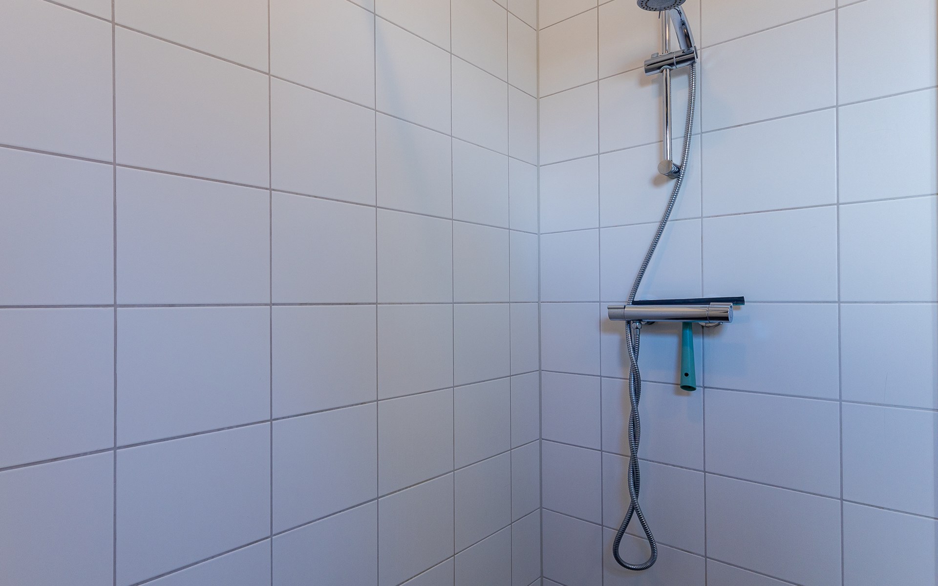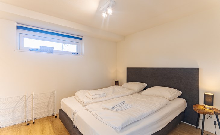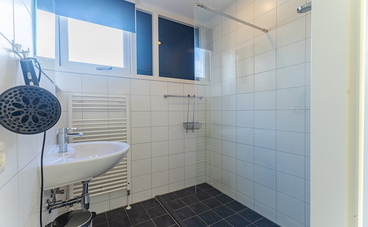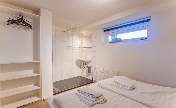 Solskin accommodates six people in three bedrooms. On the ground floor is a bedroom with a double bed (160x200cm) with 2 separate mattresses and there are bedside tables with bed lighting plus an open wardrobe with a small hanging section and some shelves. The first bathroom is en-suite and equipped with a washbasin with mirror and a walk-in shower. The other two bedrooms are on the first floor and can be reached via the stairs. The stairs are secured with a stair gate for small children both upstairs and downstairs. The first bedroom is furnished with a double bed (160x200cm) with 2 separate mattresses and a low cabinet with shelves. In the second bedroom are 2 single beds (80x200cm) with an open wardrobe with hanging section and some shelves and an extra storage cabinet. The bathroom on the first floor is equipped with a washbasin and a walk-in shower. There are separate toilets on both floors.