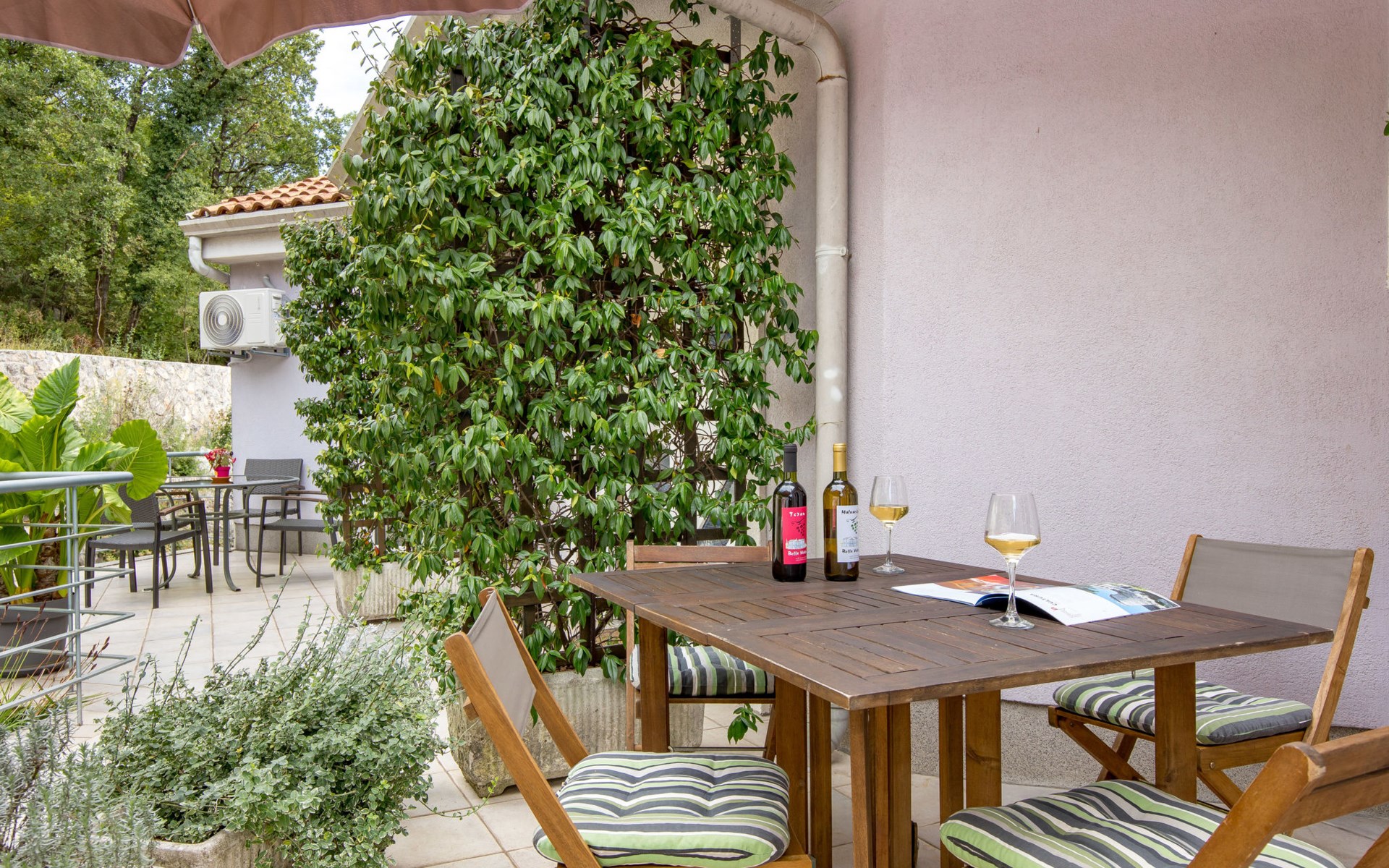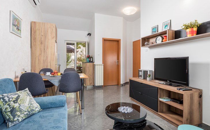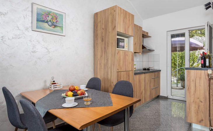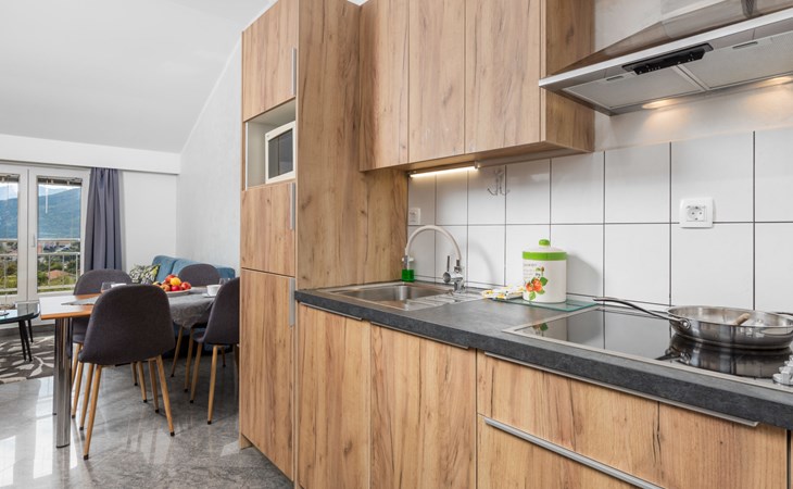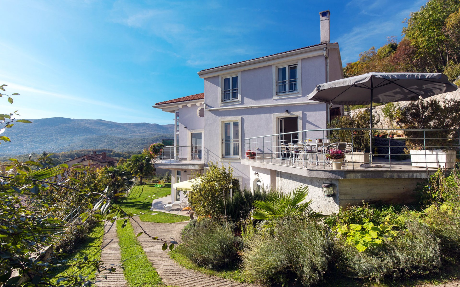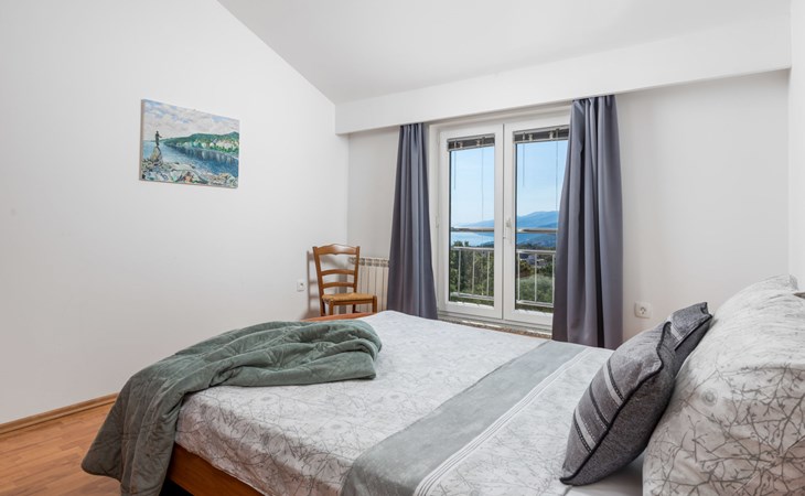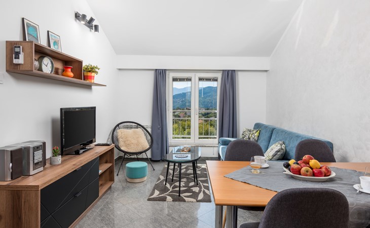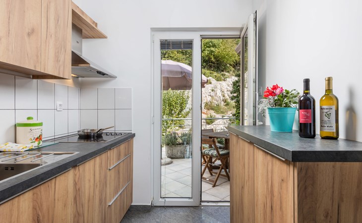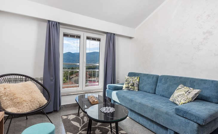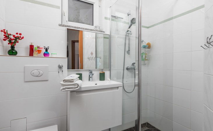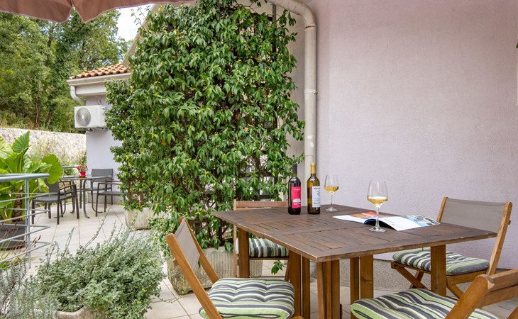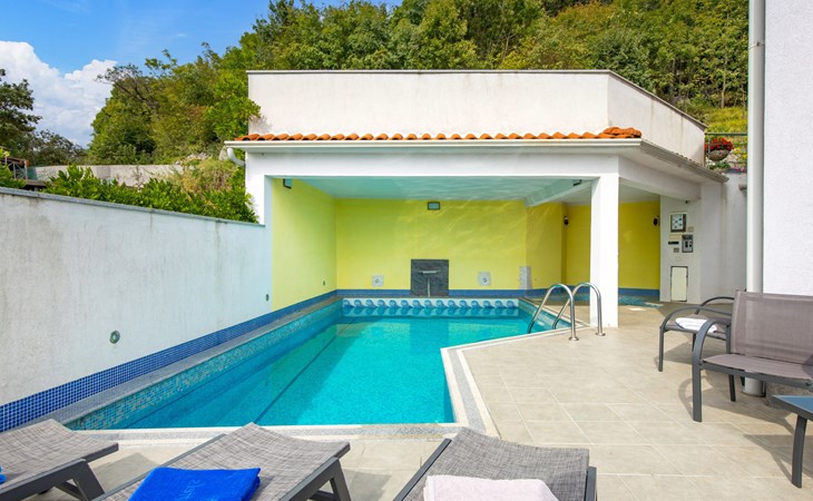 Apartment block "Bella Vista". 6 km from the centre of Opatija, 11 km from the centre of Ičići, on a slope, 3 km from the sea, 3 km from the beach, in a cul-de-sac, in the countryside. For shared use: property 1'200 m2 with flowers and trees, swimming pool heated (7 x 4 m, depth 120 - 160 cm, seasonal availability: 29.Apr. - 30.Nov. pool opening hours: 08:00-22:00). Outdoor shower, terrace, barbecue. In the house: internet access, washing machine, tumble dryer (for shared use, extra). Parking at the house on the premises. Shop 200 m, bus stop 1.2 km, pebble beach 3 km.