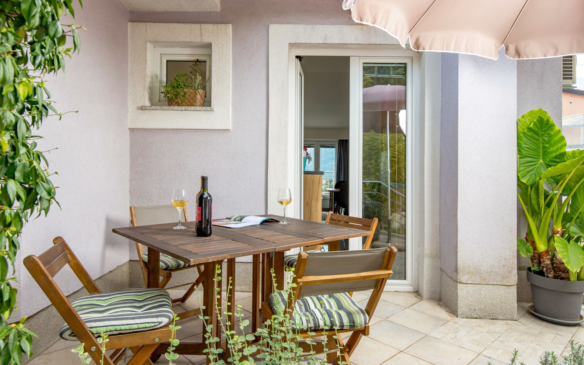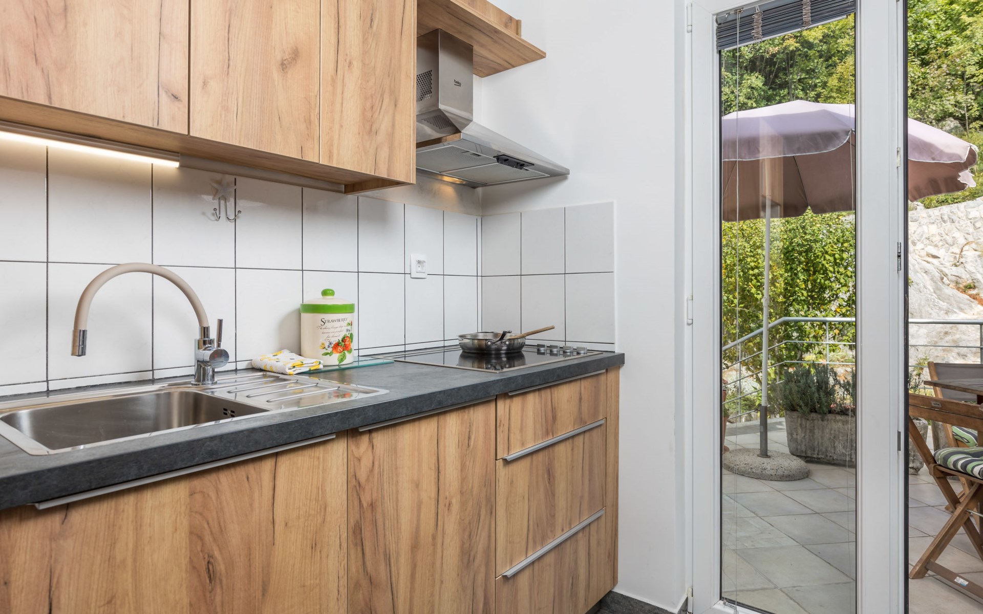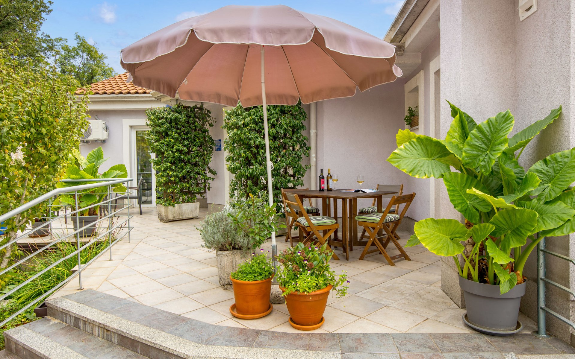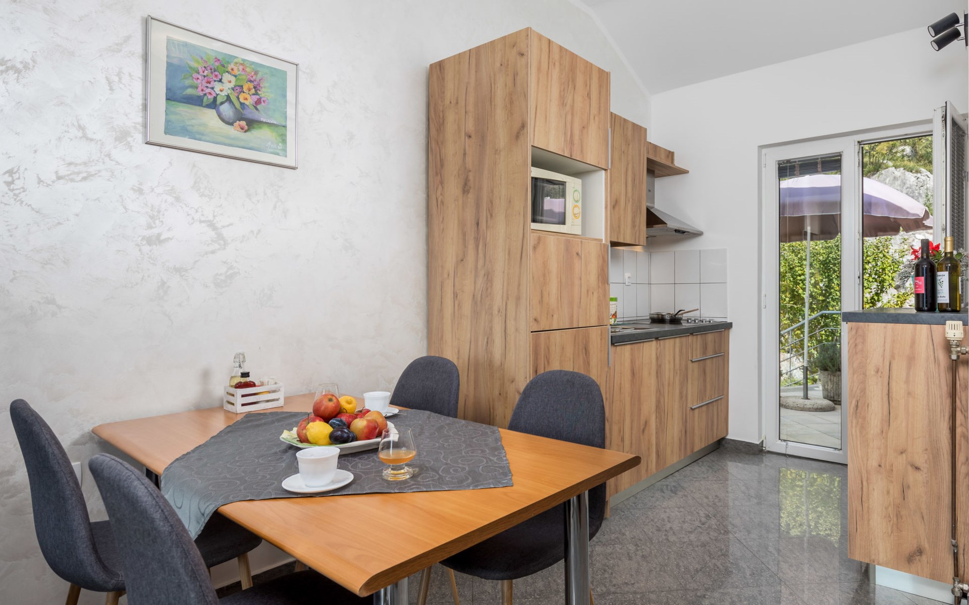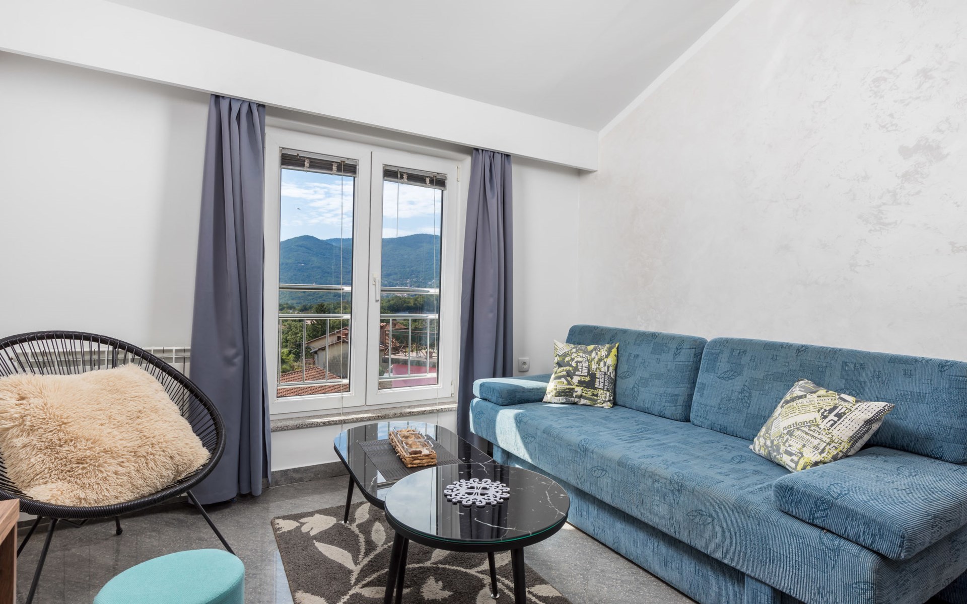 Apartment block "Bella Vista". 6 km from the centre of Opatija, 11 km from the centre of Ičići, on a slope, 3 km from the sea, 3 km from the beach, in a cul-de-sac, in the countryside. For shared use: property 1'200 m2 with flowers and trees, swimming pool heated (7 x 4 m, depth 120 - 160 cm, seasonal availability: 29.Apr. - 30.Nov. pool opening hours: 08:00-22:00). Outdoor shower, terrace, barbecue. In the house: internet access, washing machine, tumble dryer (for shared use, extra). Parking at the house on the premises. Shop 200 m, bus stop 1.2 km, pebble beach 3 km.