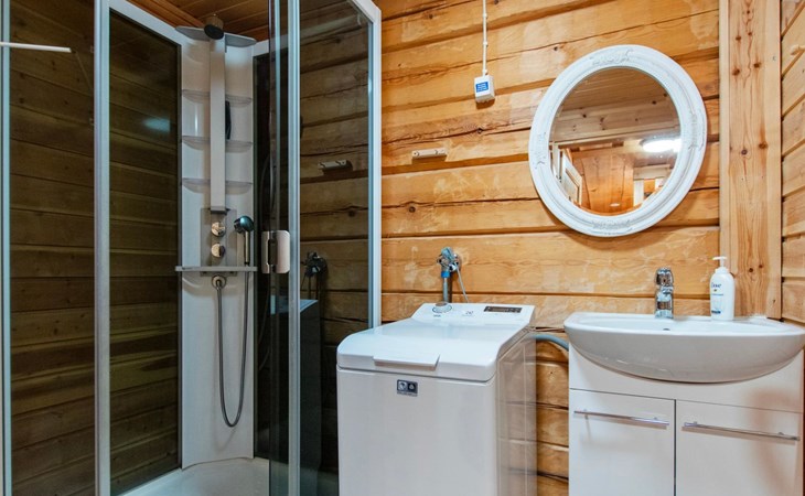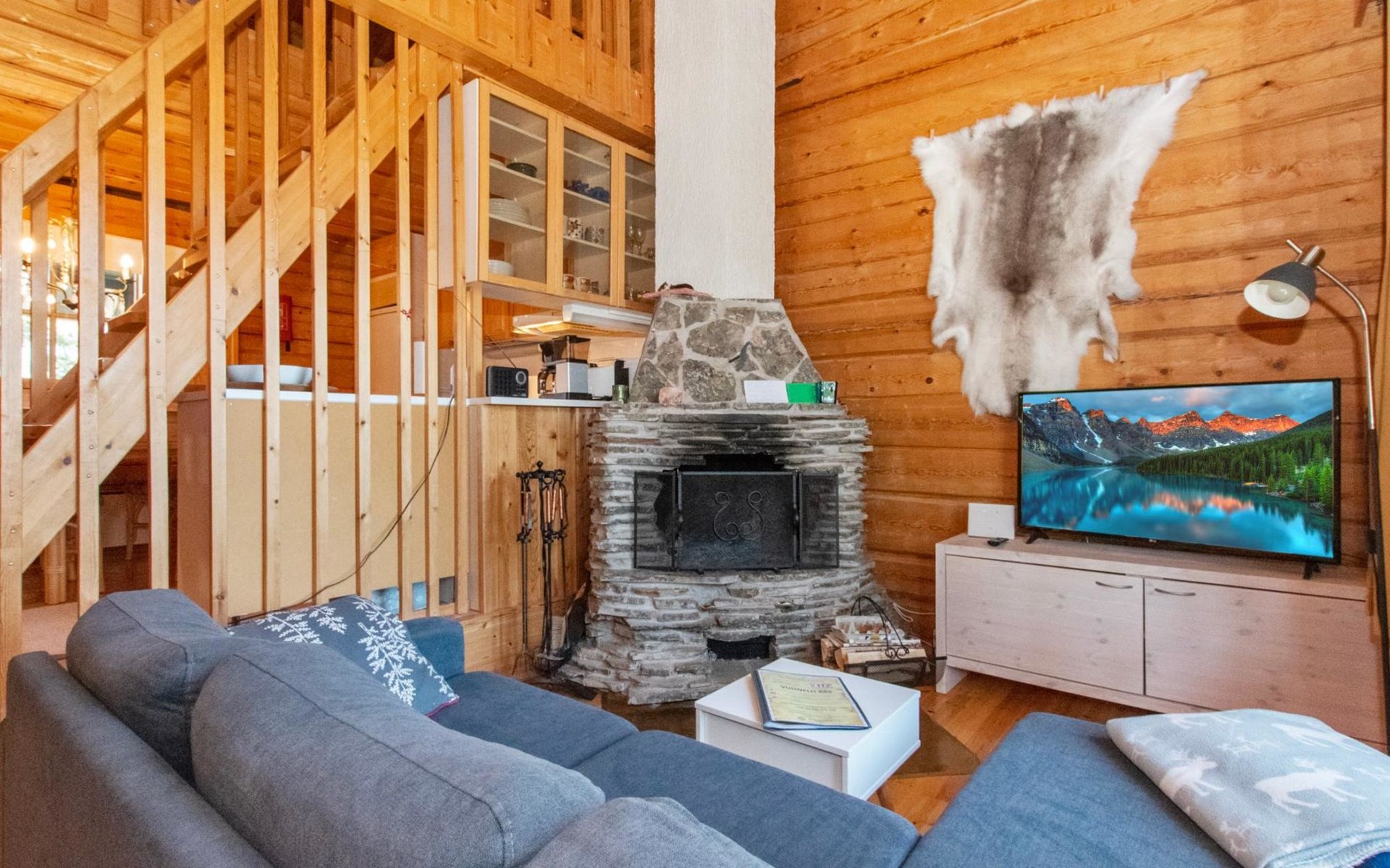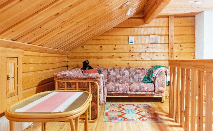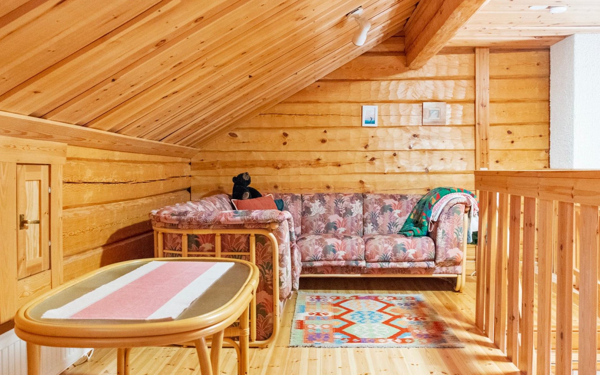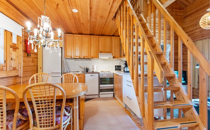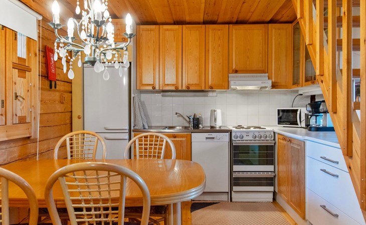 Apartment area 46 m² + loft 15 m². The living room kitchen has an atmospheric fireplace, a bedroom with a double bed, 2 single beds in the loft (superlo mattresses) and a toilet. Washroom, sauna (with electric stove), toilet, terrace.