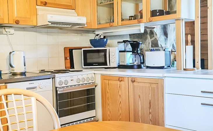 In equipment; coffee machine, kettle, toaster, iron and ironing board, hair dryer. Car heating plug in the parking lot and a small outdoor storage room for storing skis.