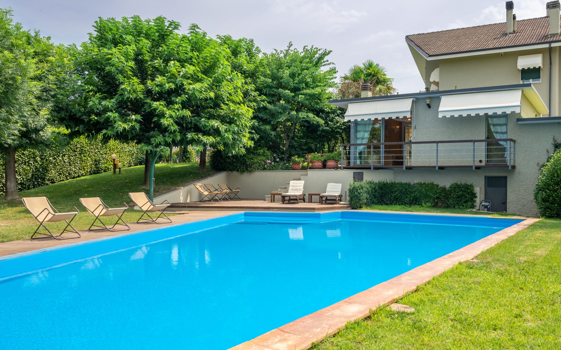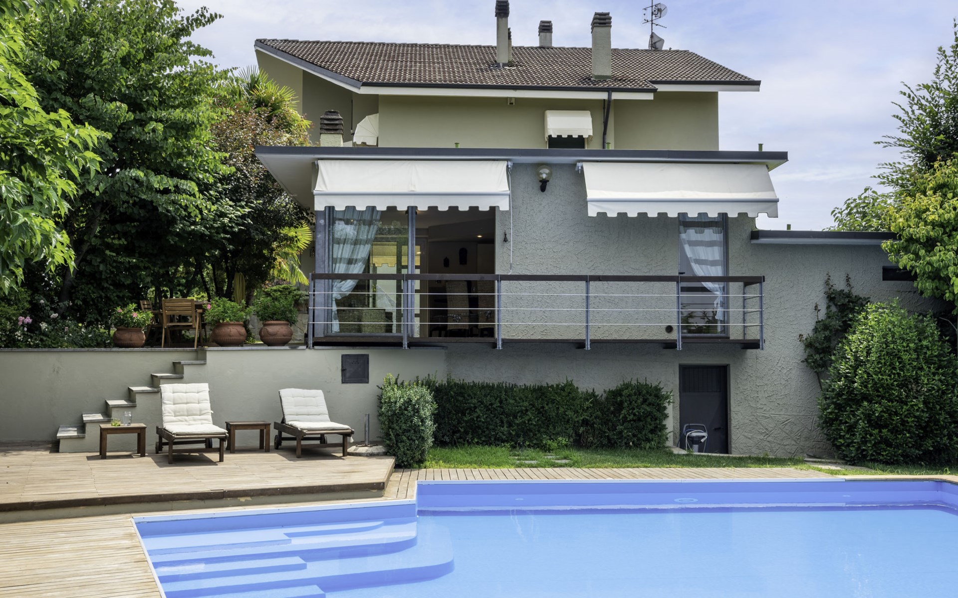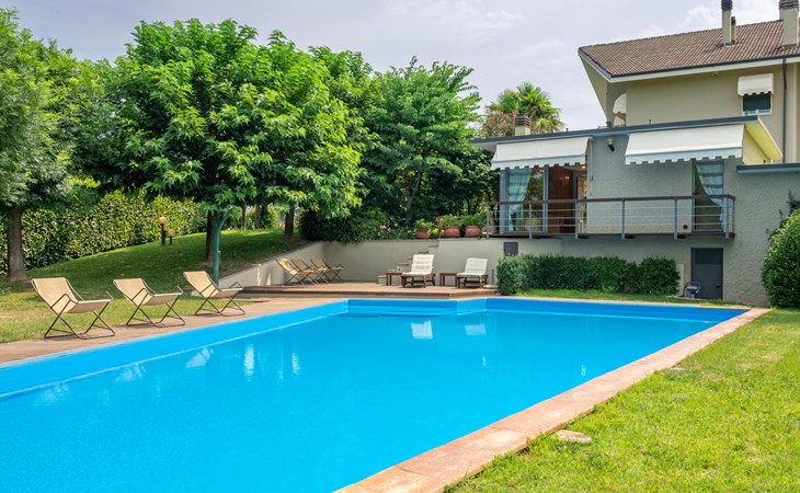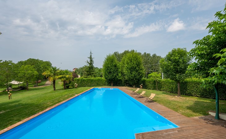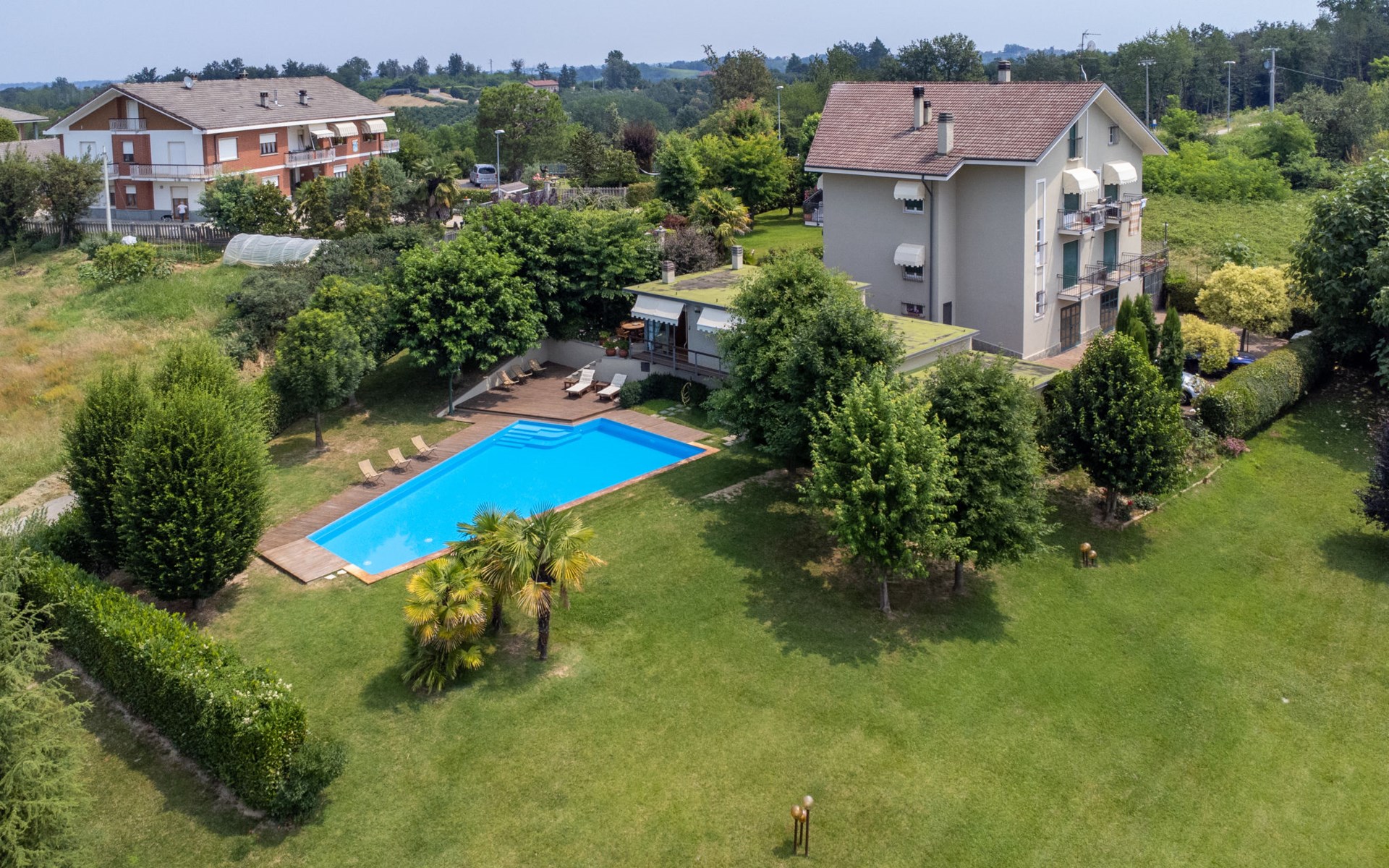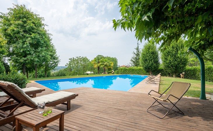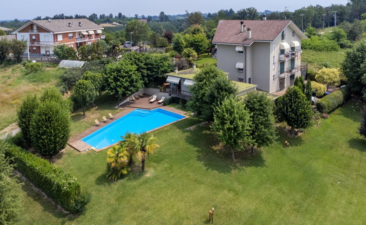 3-family house. In the district of San Grato 5 km from the centre of Monteu Roero, in an elevated position. Private: park (fenced), flowers and trees, swimming pool (14 x 6 m, depth 110 cm, seasonal availability: 01.May. - 30.Sep.). Shower/WC in the pool area, parking (for 2 cars) at the house. Restaurant, bar 500 m, bus stop 2 km. Nearby attractions: Alba 20 km, Rocche del Roero. Please note: car recommended. The owner lives on the same property.