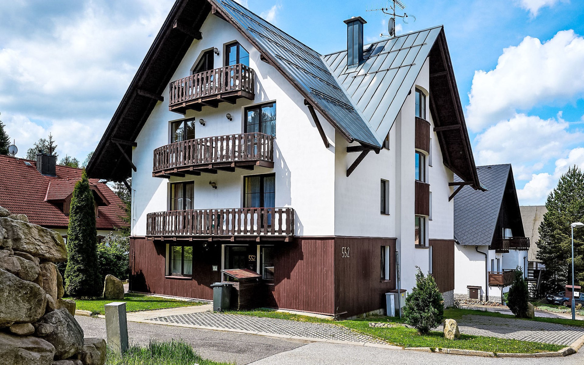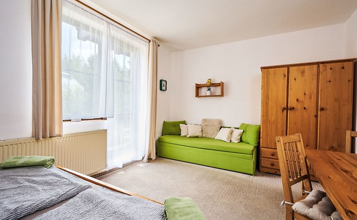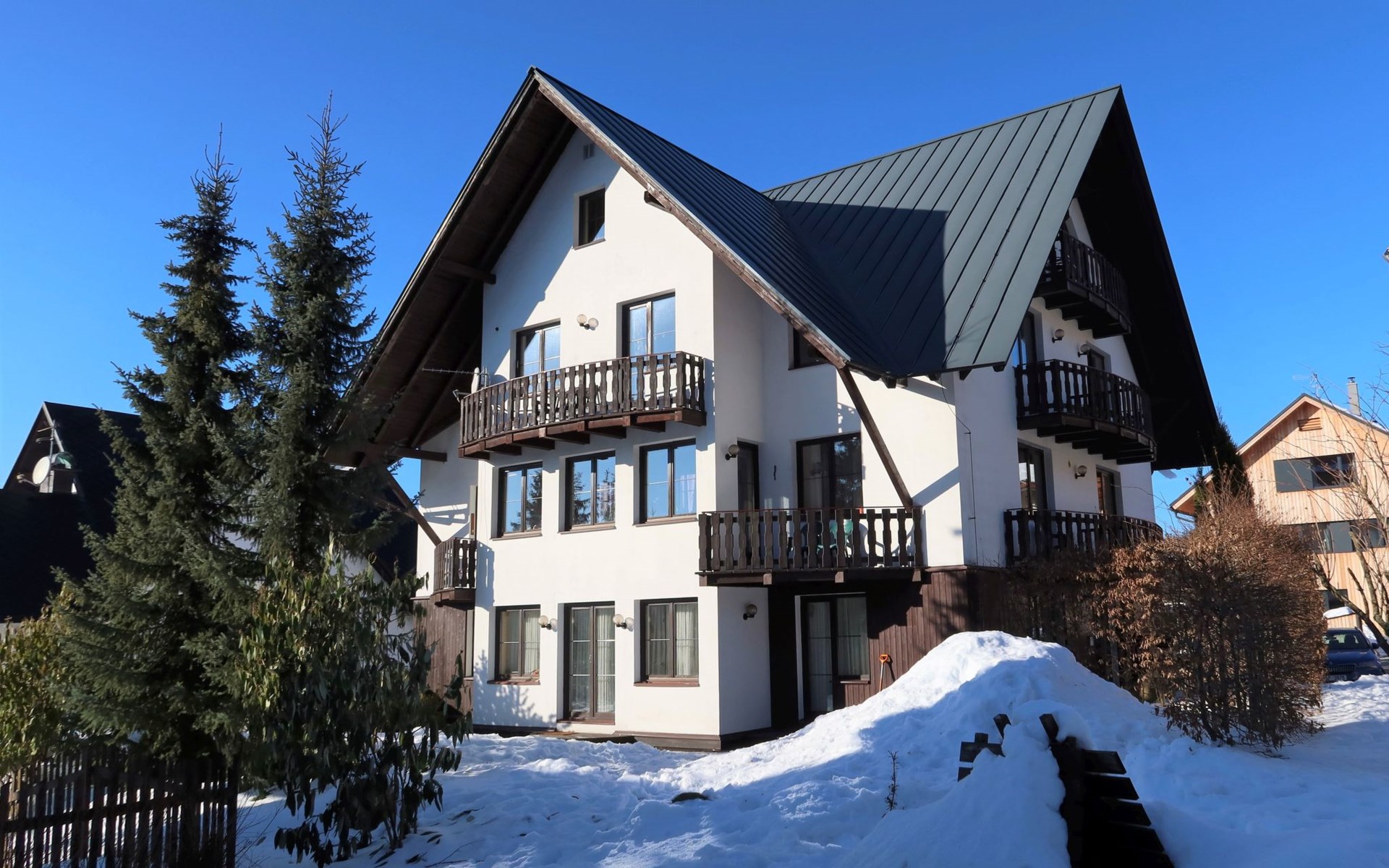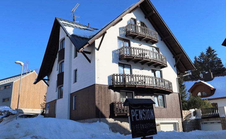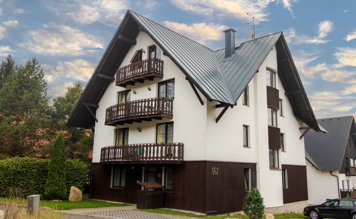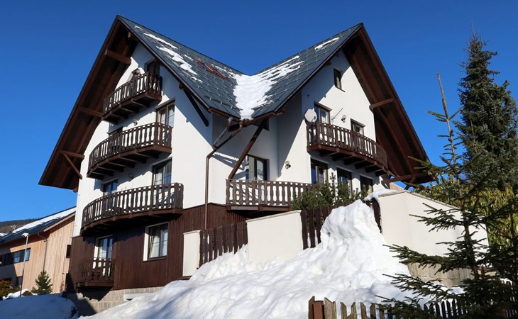 Apartment house 700 m a.s.l., 4 storeys. 3 apartments in the property. In the district of Klondajk 300 m from the centre of Harrachow, in the residential district, 25 km from the lake, 500 m from the skiing area. In the house: storage room for skis. Parking at the house, single garage (extra). Shop, supermarket, restaurant 150 m, bus stop "Harrachov, sklárna" 600 m, railway station "Harrachov, Mýtiny" 3 km, grass beach 25 km, outdoor swimming pool 1 km, indoor swimming pool 1 km. Golf course (9 hole) 3.5 km, tennis 2 km, indoor tennis centre 3 km, ski lift 500 m, chair lift 500 km, slopes, ski rental 500 m, ski bus stop 10 m, ski school 500 km, children's ski school, children's playground 500 m. Nearby attractions: Mumlava vodopád 2.5 km, Kořenov 8 km, Jizerka 15 km, Jablonec nad Nisou 29 km, Liberec, Ještěd 40 km, Termy Cieplickie (Pl) 30 m. Well-known ski regions can easily be reached: Harrachov 1 km, Příchovice 10 km, Rokytnice nad Jizerou 15 km. Hiking paths: Western City(Pl) 40 km, Karpacz Wang,Park miniatury Kowary (Pl) 44 km, Giganteria Piechowice 23km, Dinopark(Pl) 15 km. Garage on request. HARRACHOV CARD guest card included in the price.