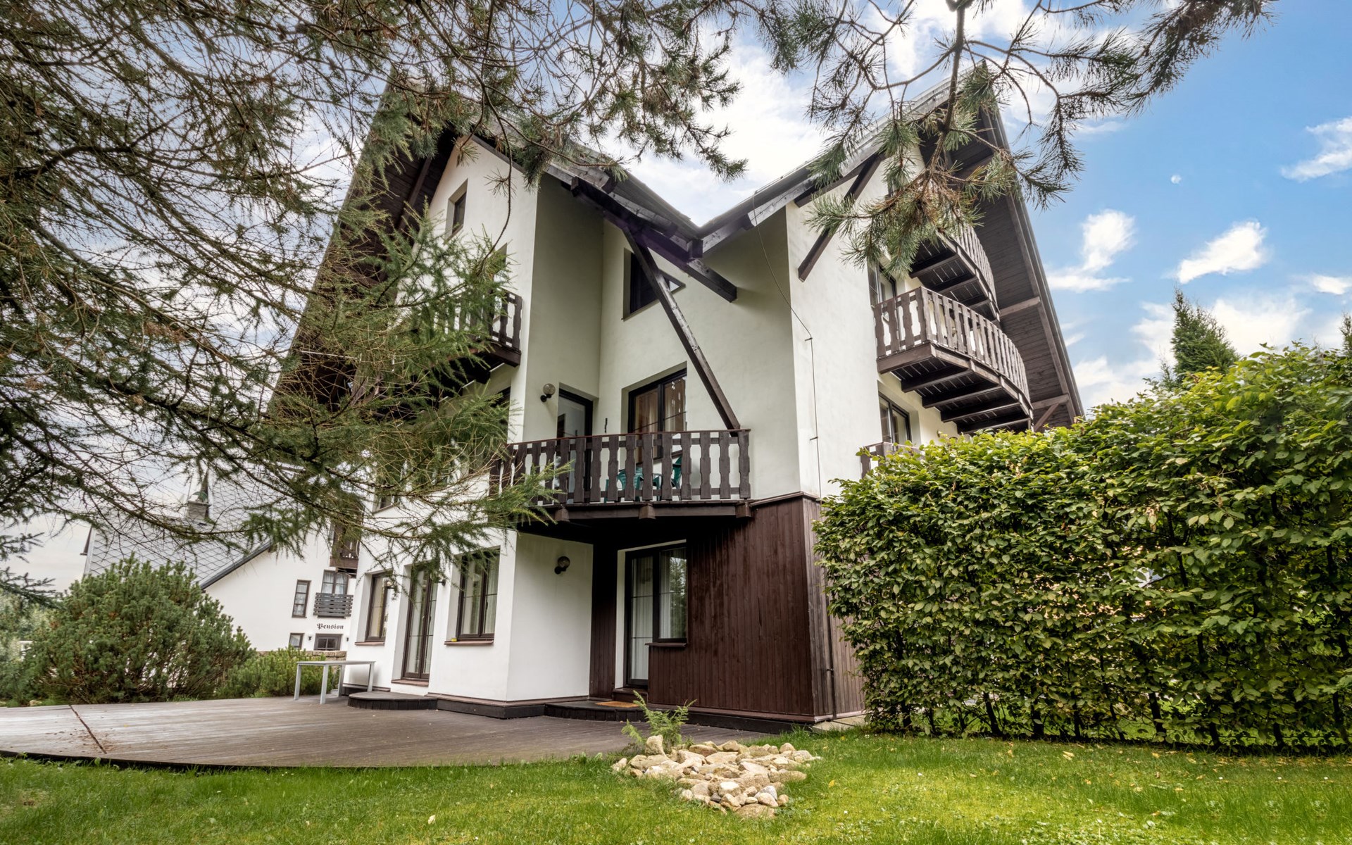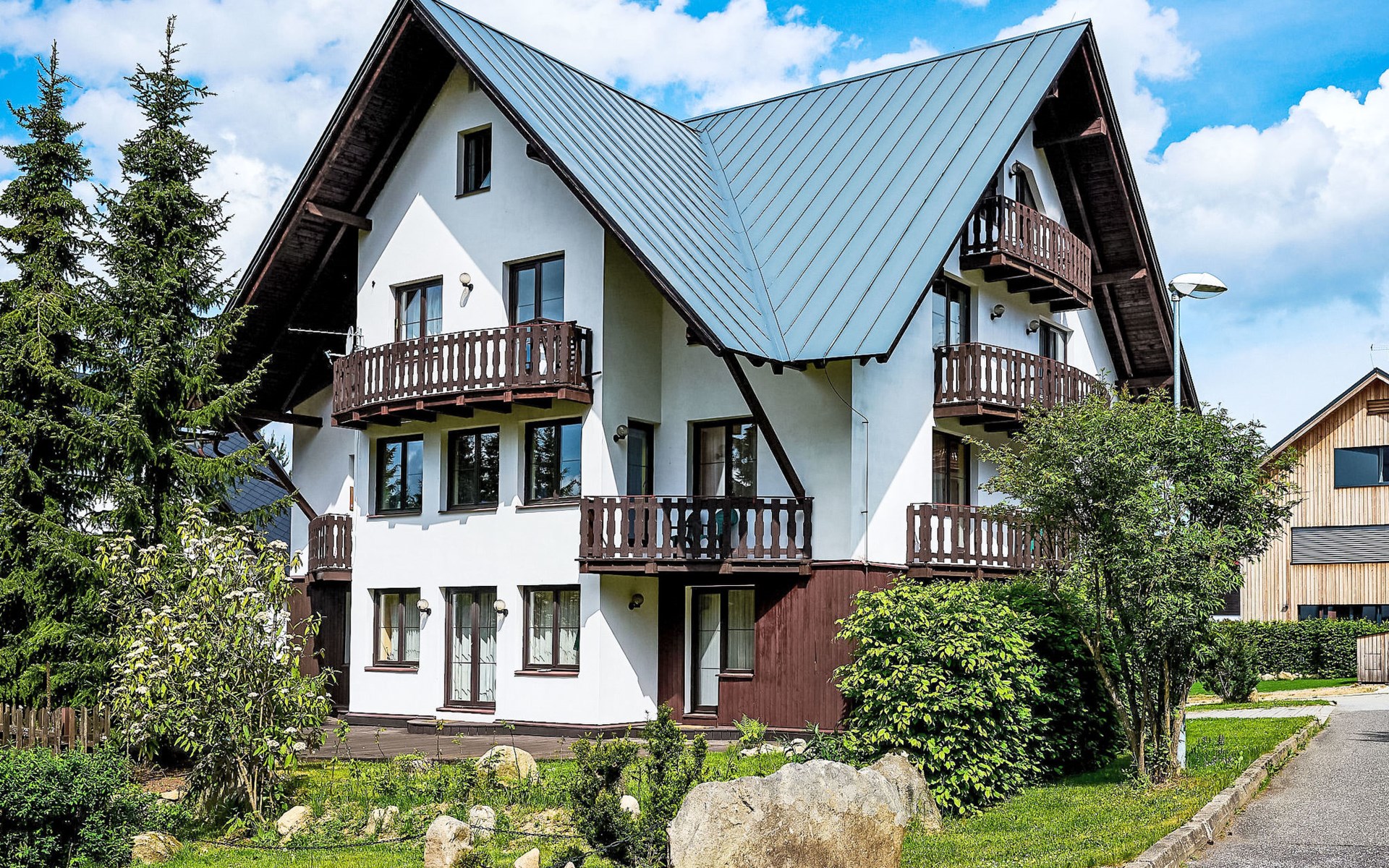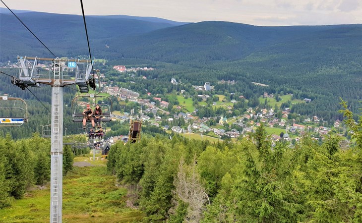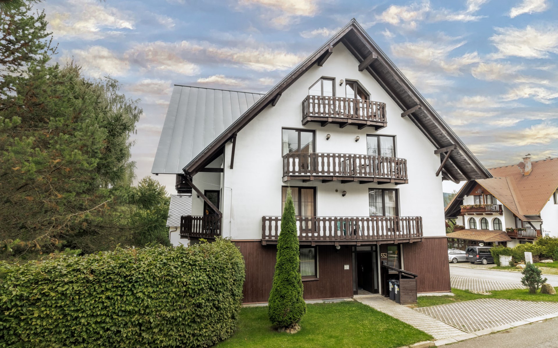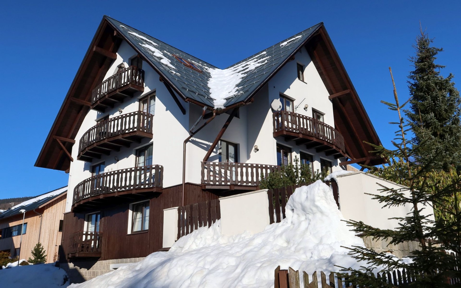 Apartment house 700 m a.s.l., 4 storeys. 3 apartments in the property. In the district of Klondajk 300 m from the centre of Harrachow, in the residential district, 25 km from the lake, 500 m from the skiing area. In the house: storage room for skis. Parking at the house, single garage (extra). Shop, supermarket, restaurant 150 m, bus stop "Harrachov, sklárna" 600 m, railway station "Harrachov, Mýtiny" 3 km, grass beach 25 km, outdoor swimming pool 1 km, indoor swimming pool 1 km. Golf course (9 hole) 3.5 km, tennis 2 km, indoor tennis centre 3 km, ski lift 500 m, chair lift 500 km, slopes, ski rental 500 m, ski bus stop 10 m, ski school 500 km, children's ski school, children's playground 500 m. Nearby attractions: Mumlava vodopád 2.5 km, Kořenov 8 km, Jizerka 15 km, Jablonec nad Nisou 29 km, Liberec, Ještěd 40 km, Termy Cieplickie (Pl) 30 m. Well-known ski regions can easily be reached: Harrachov 1 km, Příchovice 10 km, Rokytnice nad Jizerou 15 km. Hiking paths: Western City(Pl) 40 km, Karpacz Wang,Park miniatury Kowary (Pl) 44 km, Giganteria Piechowice 23km, Dinopark(Pl) 15 km. Garage on request. HARRACHOV CARD guest card included in the price.
