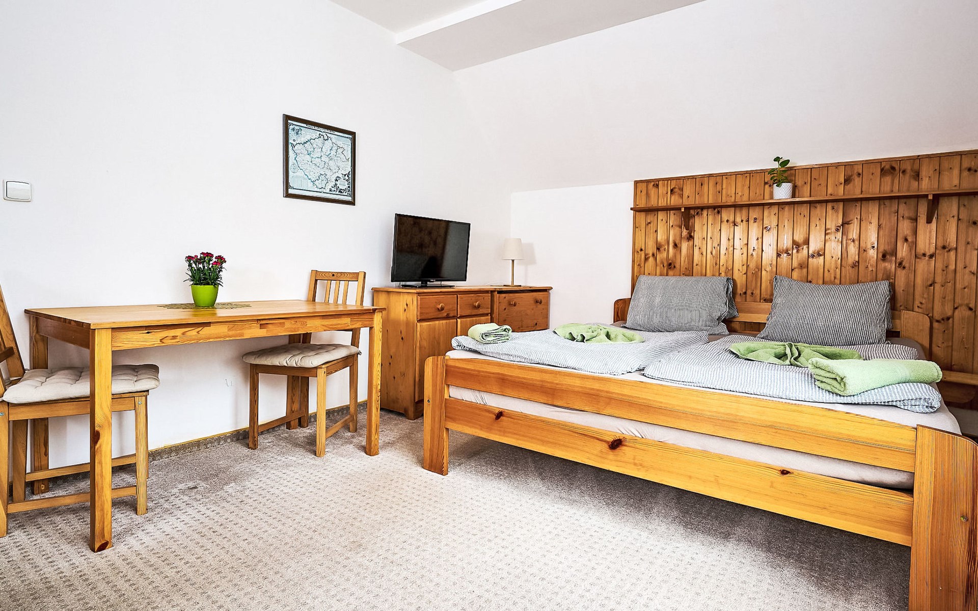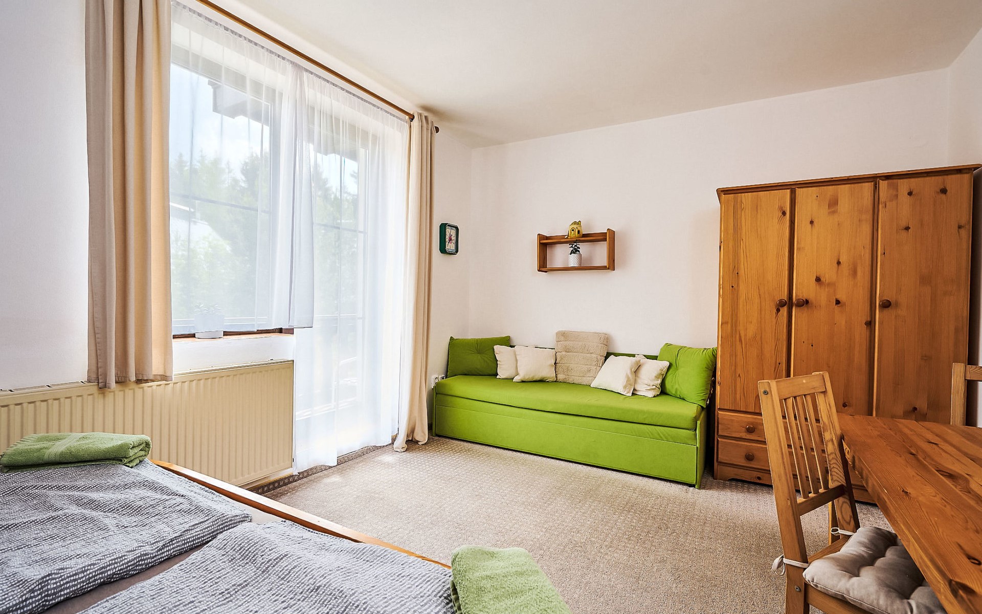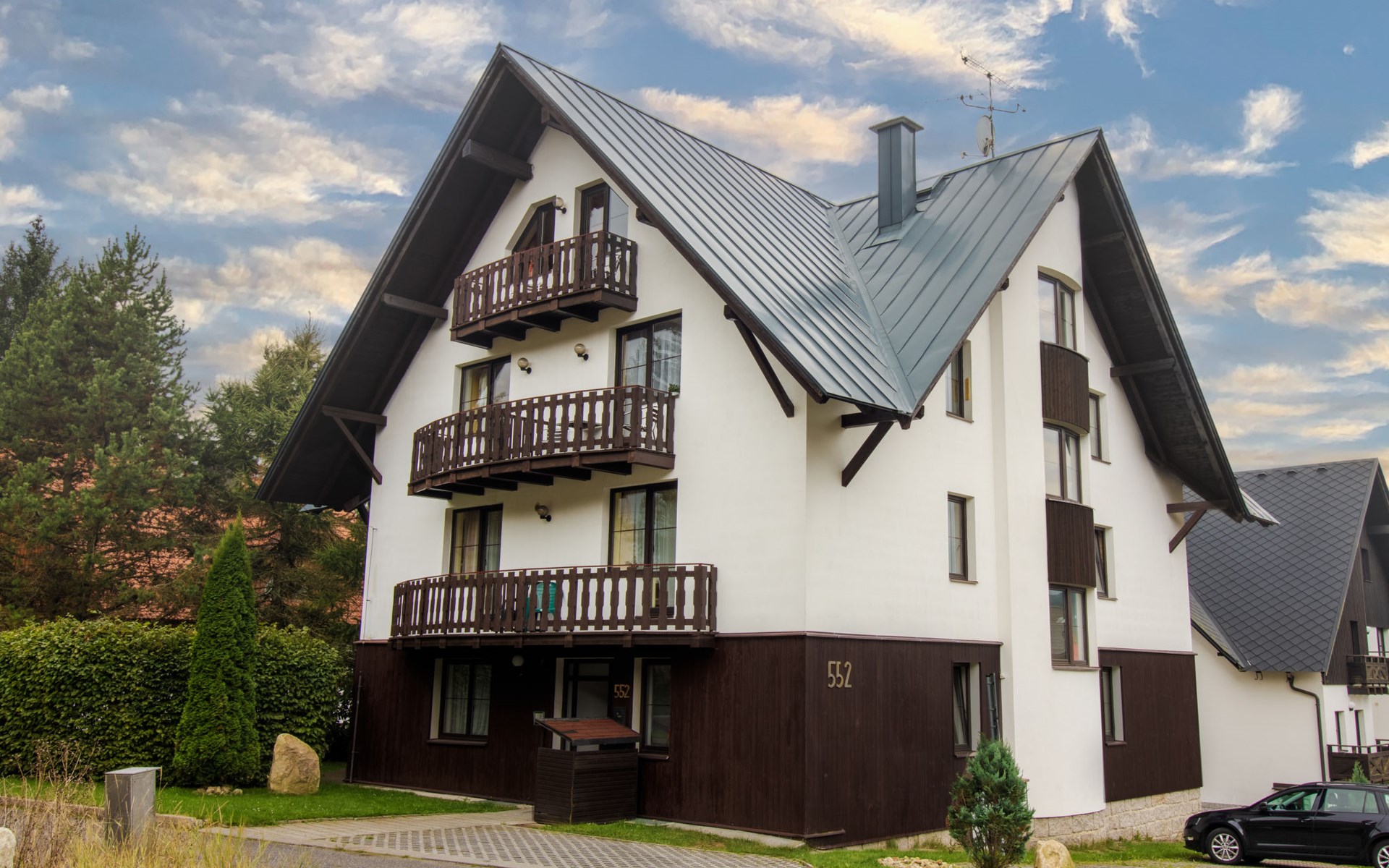 Apartment house 700 m a.s.l., 4 storeys. 3 apartments in the property. In the district of Klondajk 300 m from the centre of Harrachow, in the residential district, 25 km from the lake, 500 m from the skiing area. In the house: storage room for skis. Parking at the house, single garage (extra). Shop, supermarket, restaurant 150 m, bus stop "Harrachov, sklárna" 600 m, railway station "Harrachov, Mýtiny" 3 km, grass beach 25 km, outdoor swimming pool 1 km, indoor swimming pool 1 km. Golf course (9 hole) 3.5 km, tennis 2 km, indoor tennis centre 3 km, ski lift 500 m, chair lift 500 km, slopes, ski rental 500 m, ski bus stop 10 m, ski school 500 km, children's ski school, children's playground 500 m. Nearby attractions: Mumlava vodopád 2.5 km, Kořenov 8 km, Jizerka 15 km, Jablonec nad Nisou 29 km, Liberec, Ještěd 40 km, Termy Cieplickie (Pl) 30 m. Well-known ski regions can easily be reached: Harrachov 1 km, Příchovice 10 km, Rokytnice nad Jizerou 15 km. Hiking paths: Western City(Pl) 40 km, Karpacz Wang,Park miniatury Kowary (Pl) 44 km, Giganteria Piechowice 23km, Dinopark(Pl) 15 km. Garage on request. HARRACHOV CARD guest card included in the price.