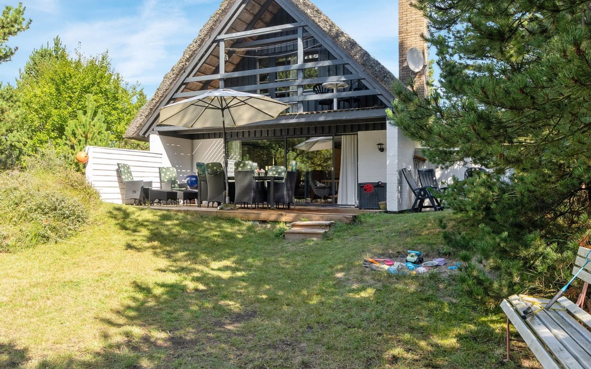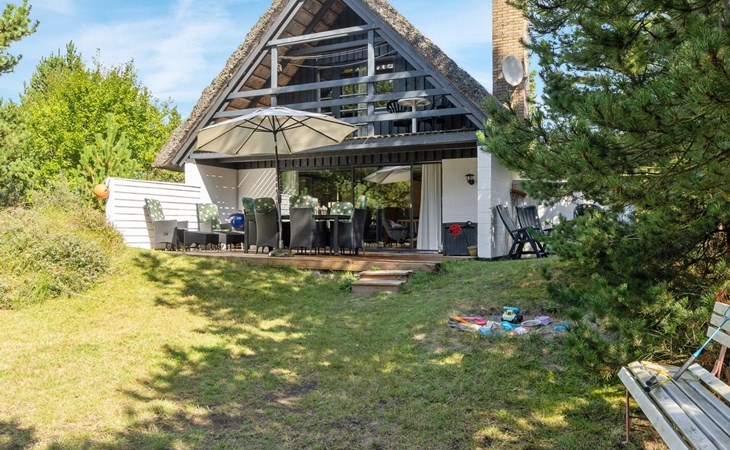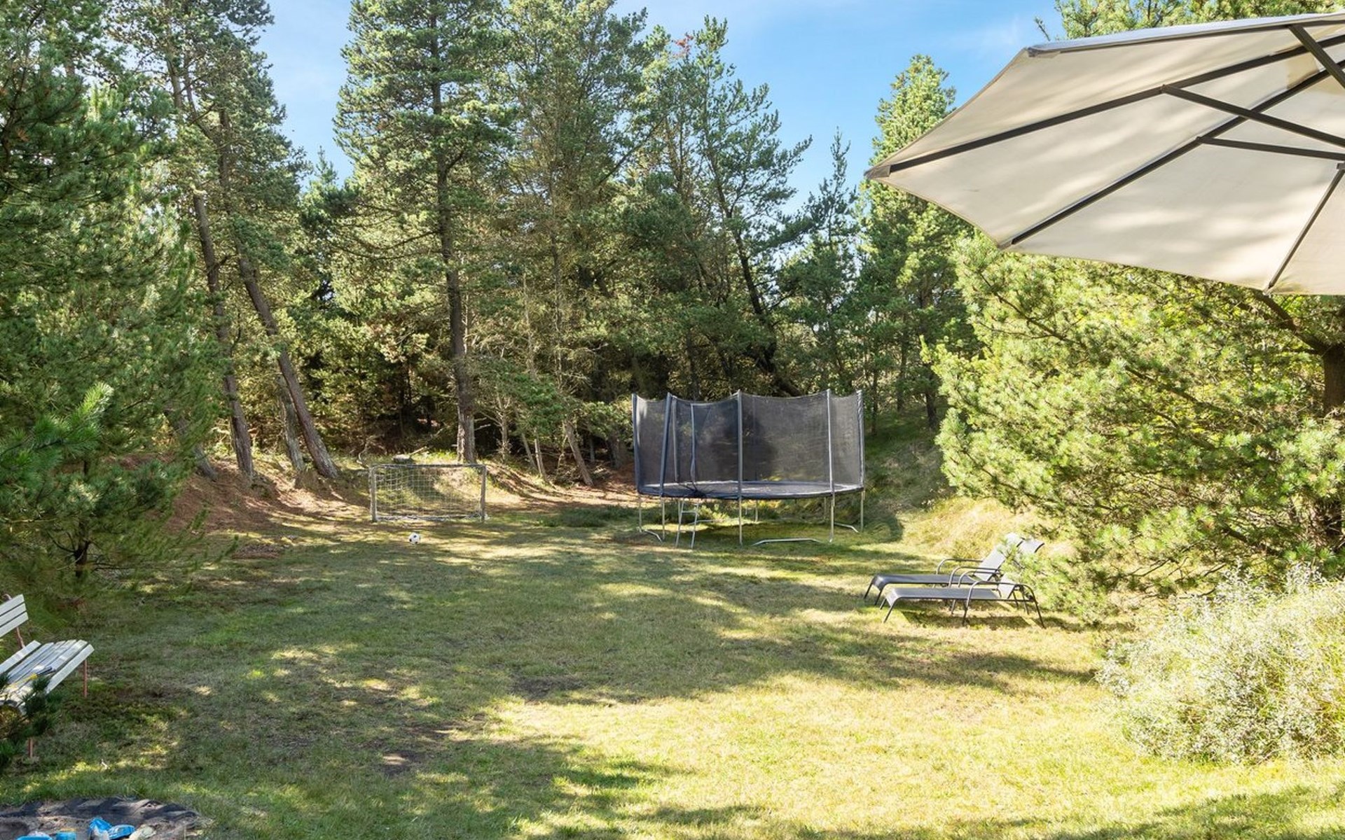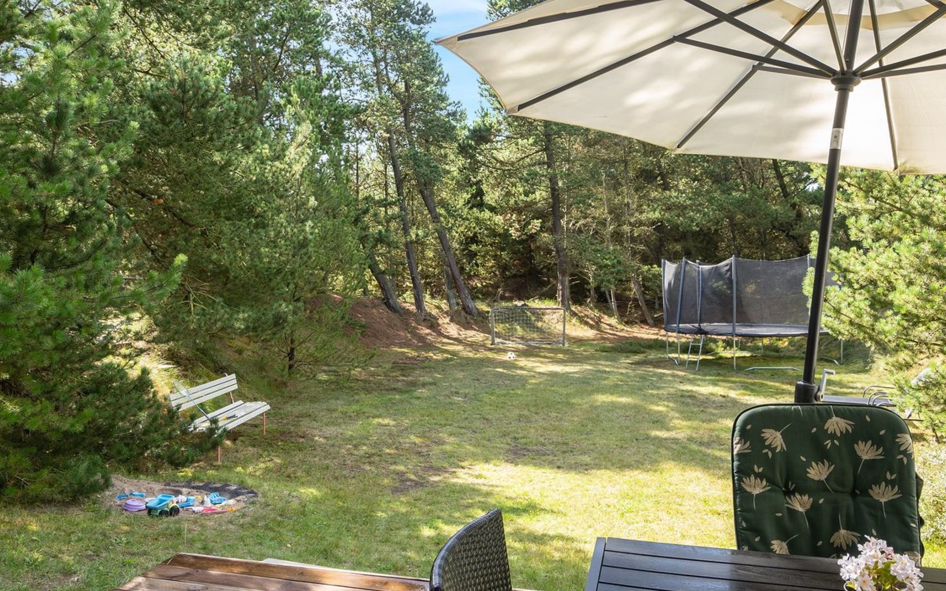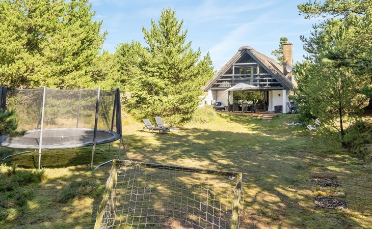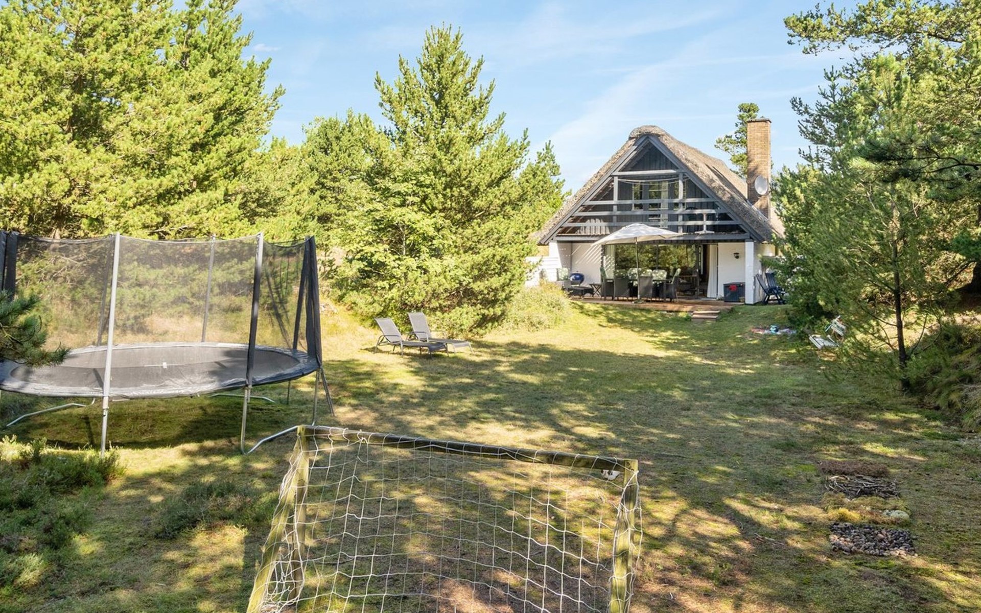 Single-family house, built in 1973. 2.4 km from the sea. Private: natural state property 2'532 m2. Terrace (15 m2), children's playground (swing). In the house: sauna, trampoline, washing machine. Parking at the house. Grocery 700 m. Golf course 850 m.