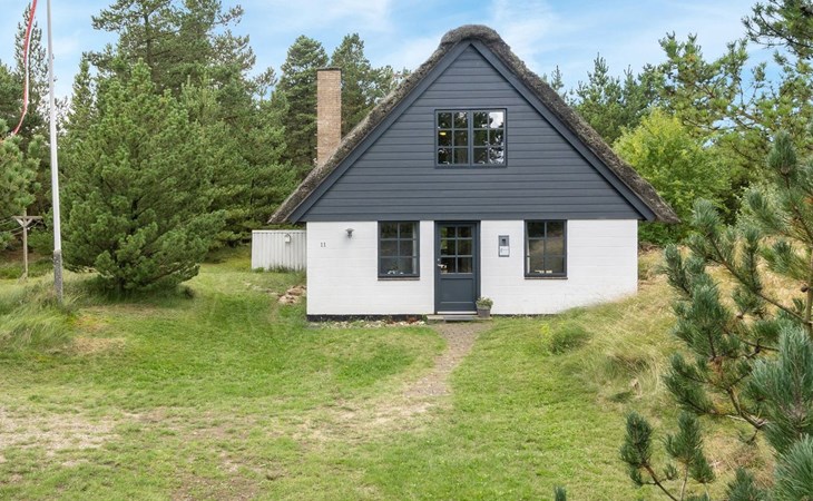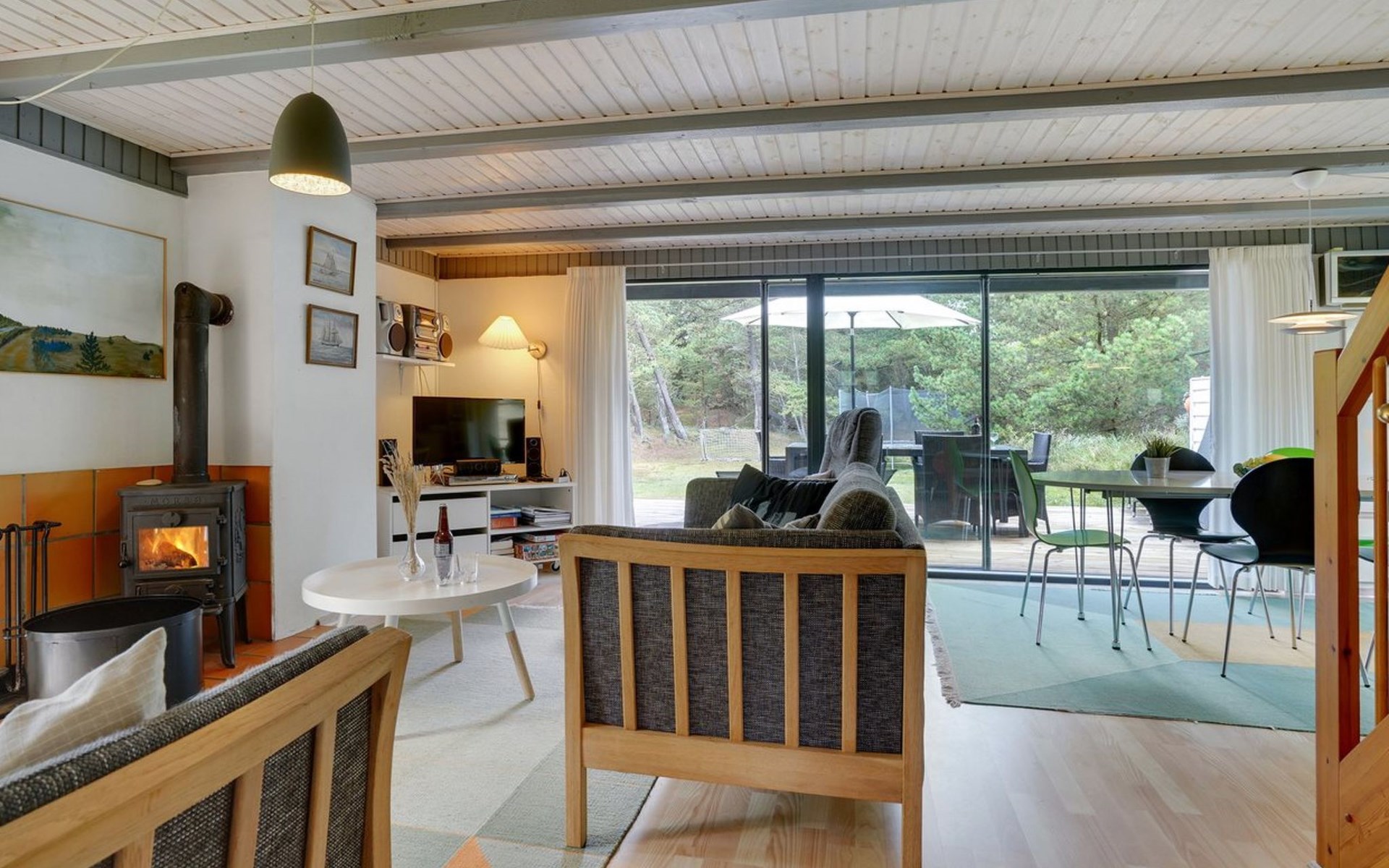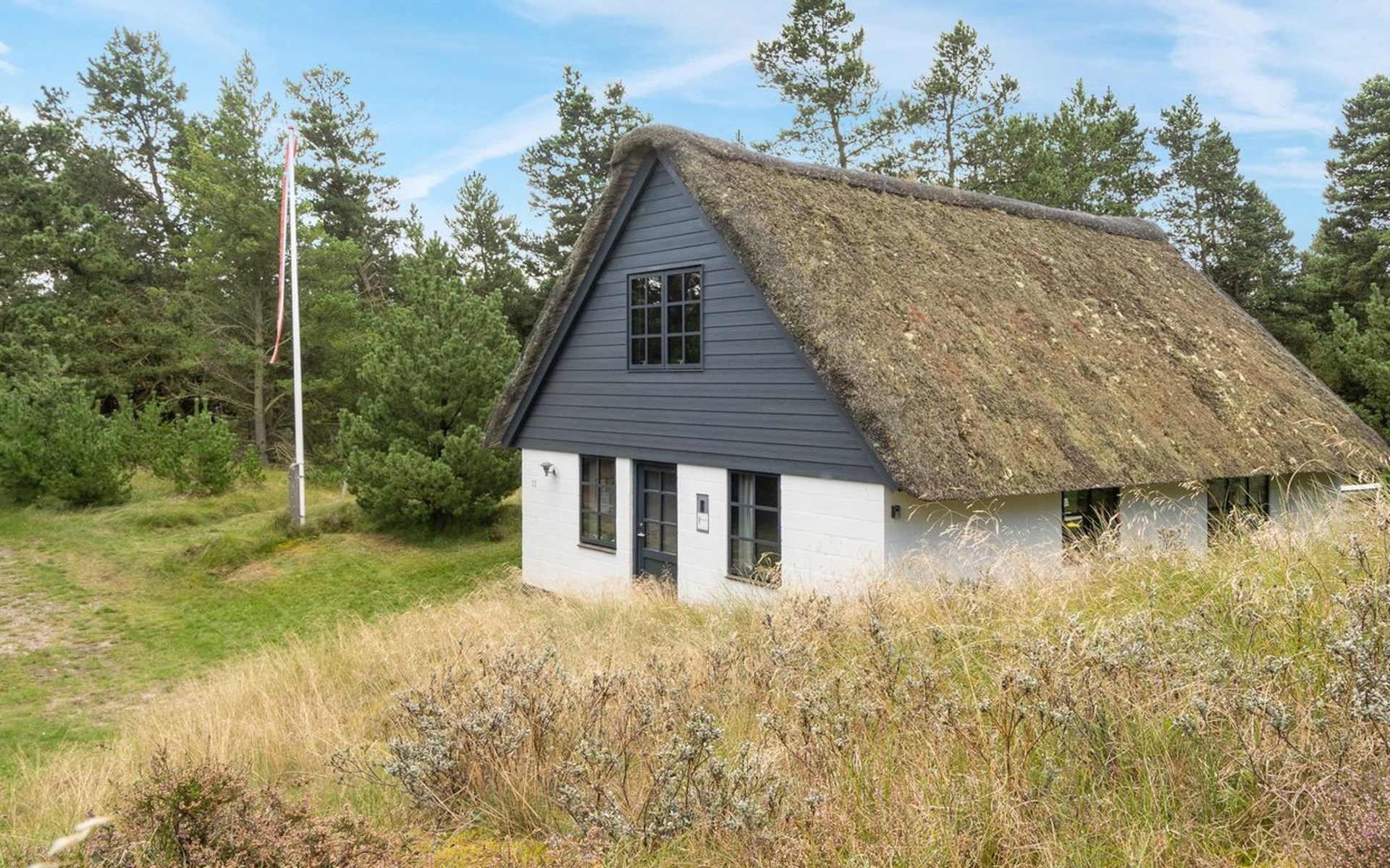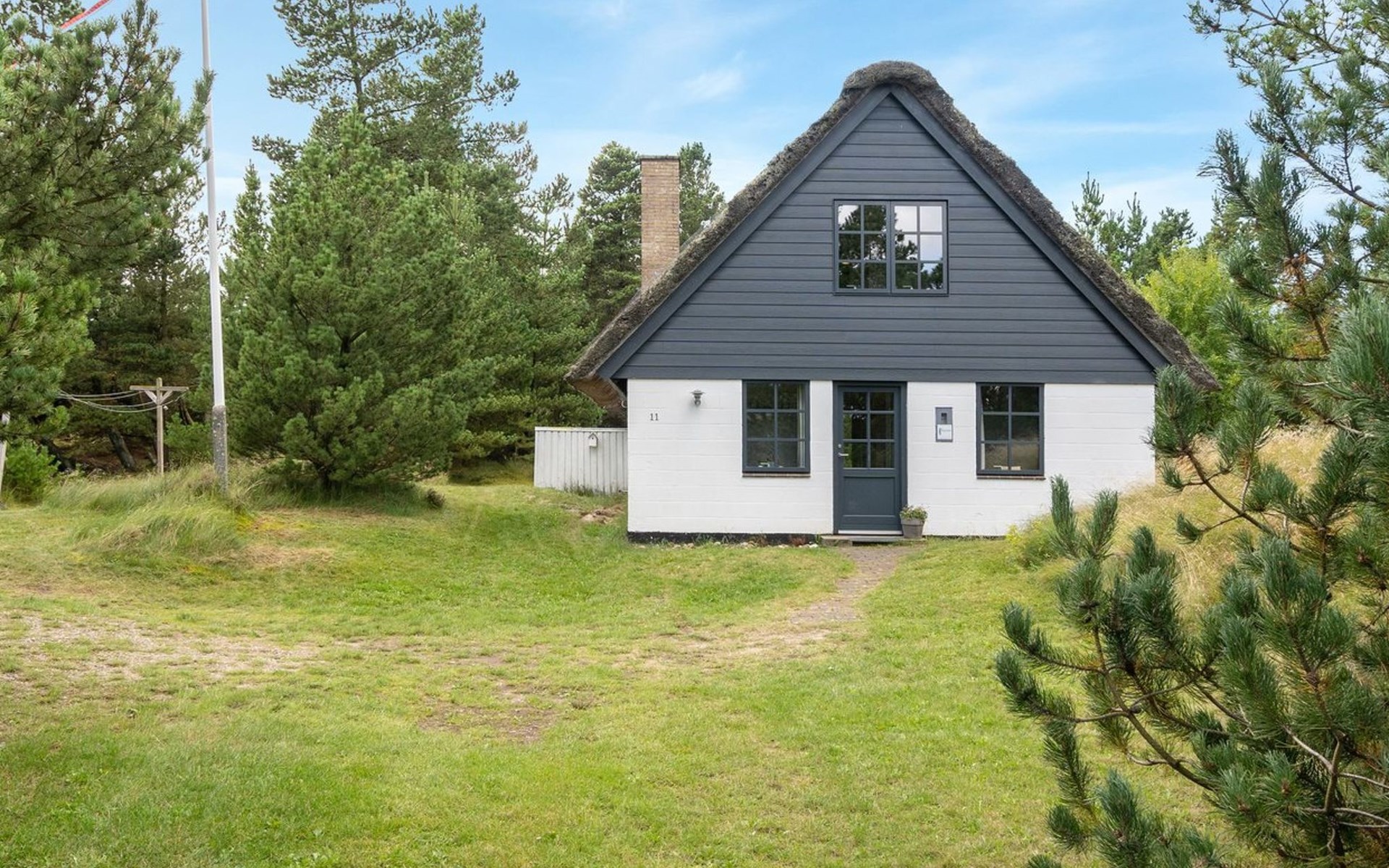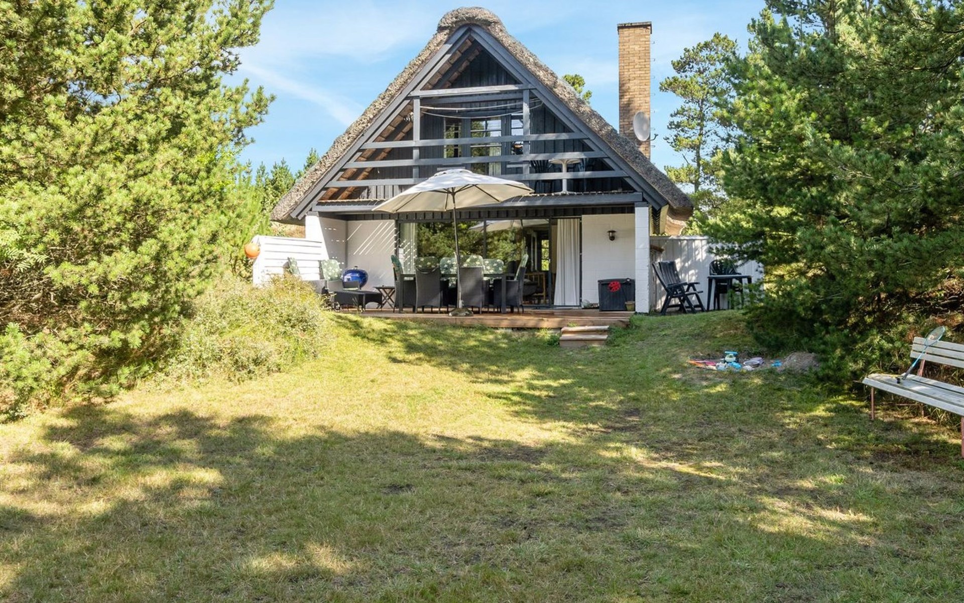 Single-family house, built in 1973. 2.4 km from the sea. Private: natural state property 2'532 m2. Terrace (15 m2), children's playground (swing). In the house: sauna, trampoline, washing machine. Parking at the house. Grocery 700 m. Golf course 850 m.