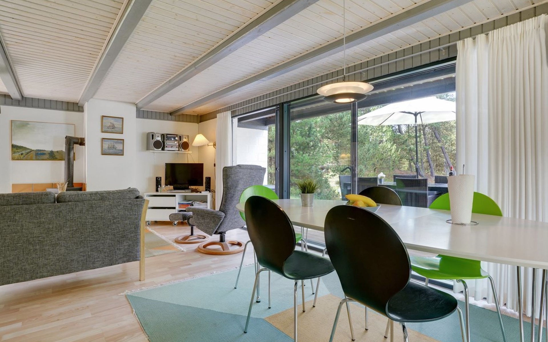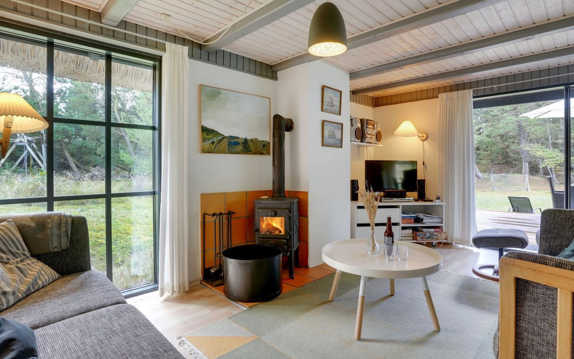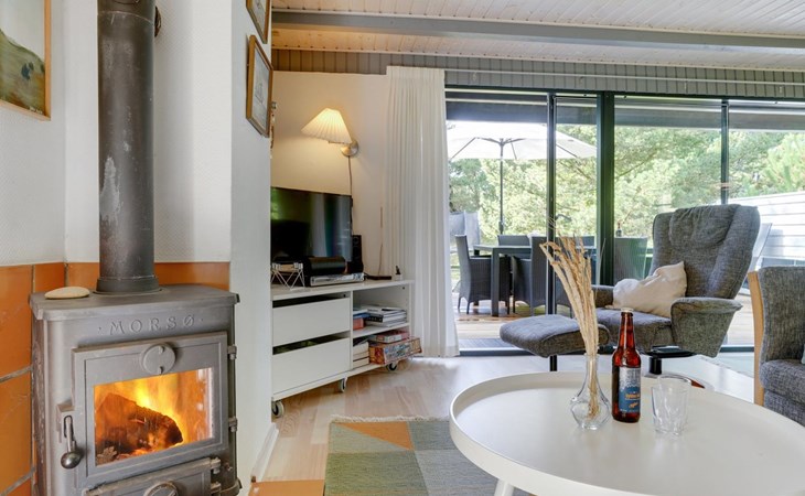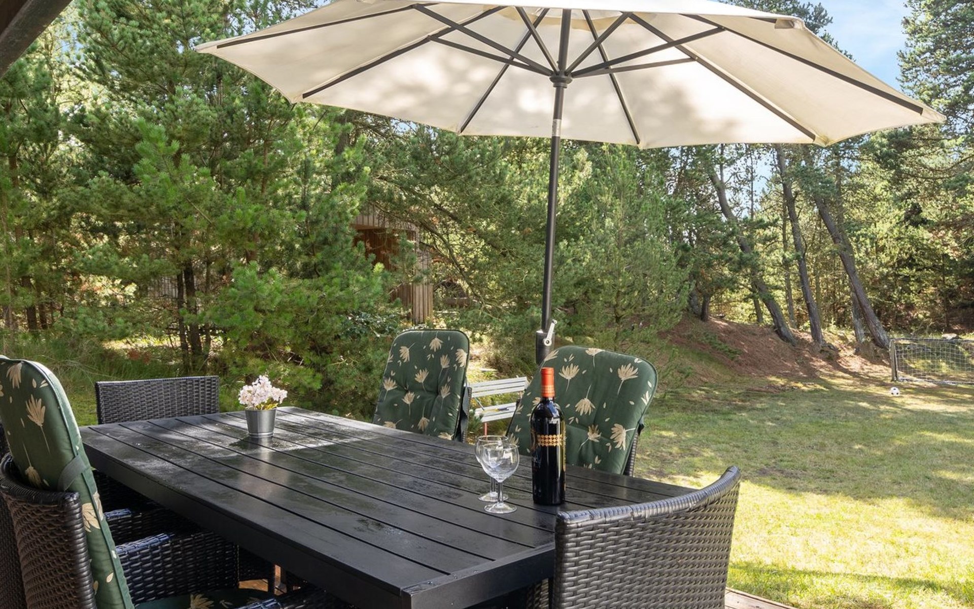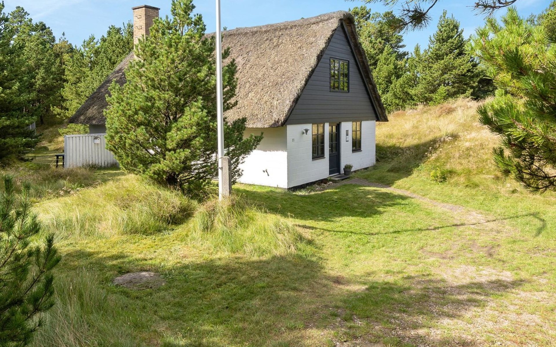 Single-family house, built in 1973. 2.4 km from the sea. Private: natural state property 2'532 m2. Terrace (15 m2), children's playground (swing). In the house: sauna, trampoline, washing machine. Parking at the house. Grocery 700 m. Golf course 850 m.