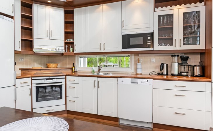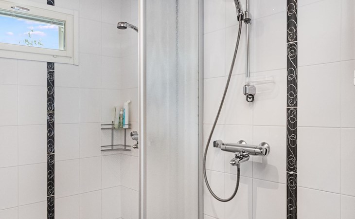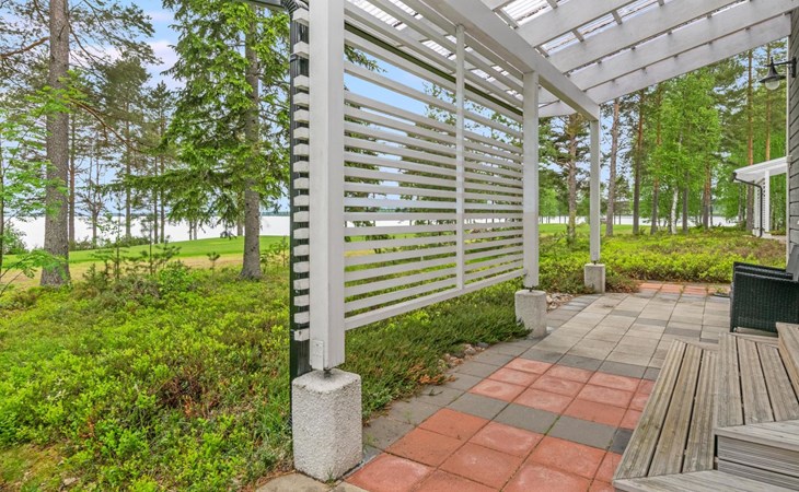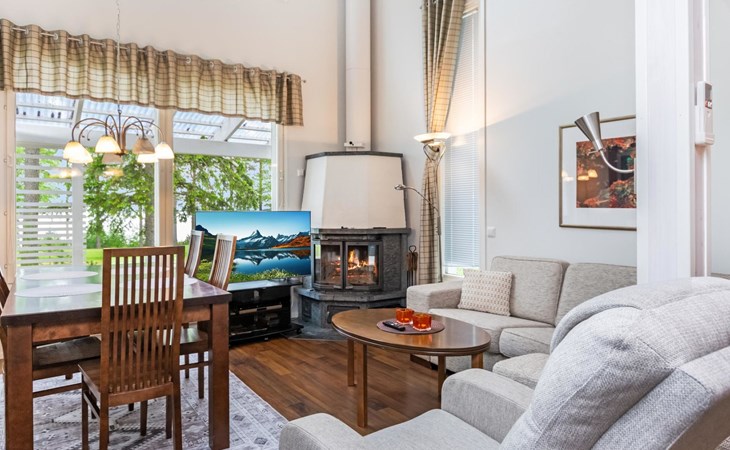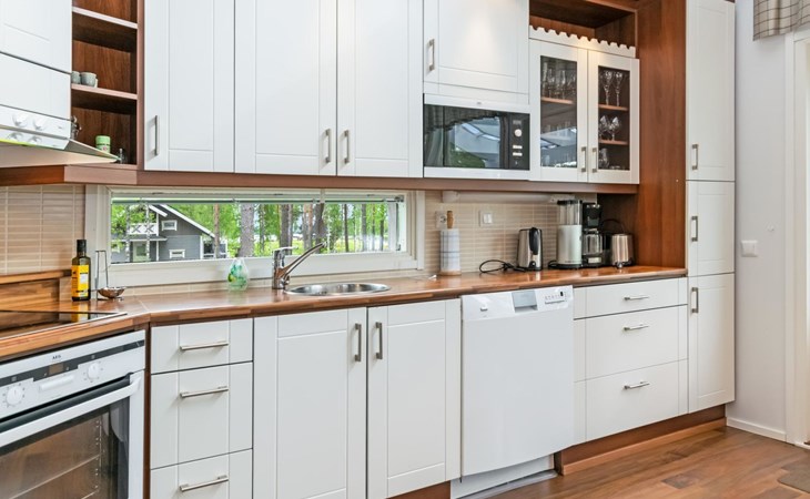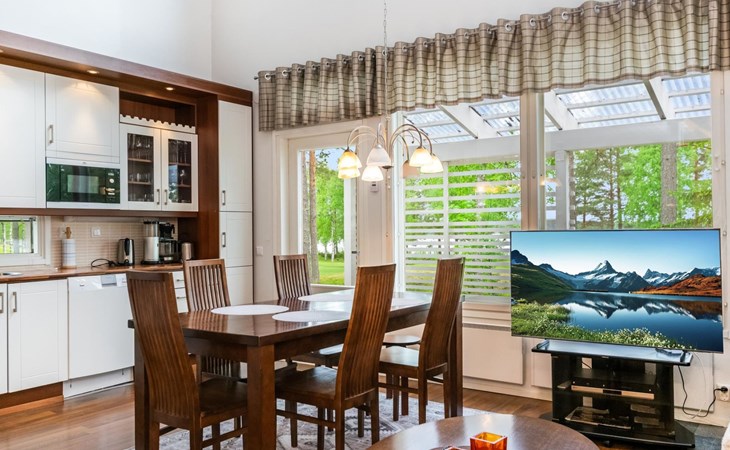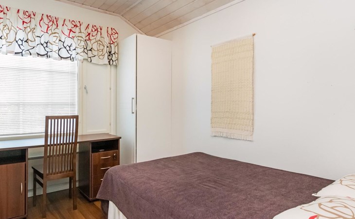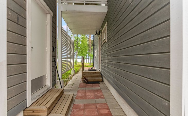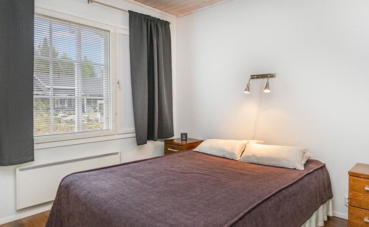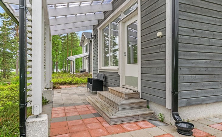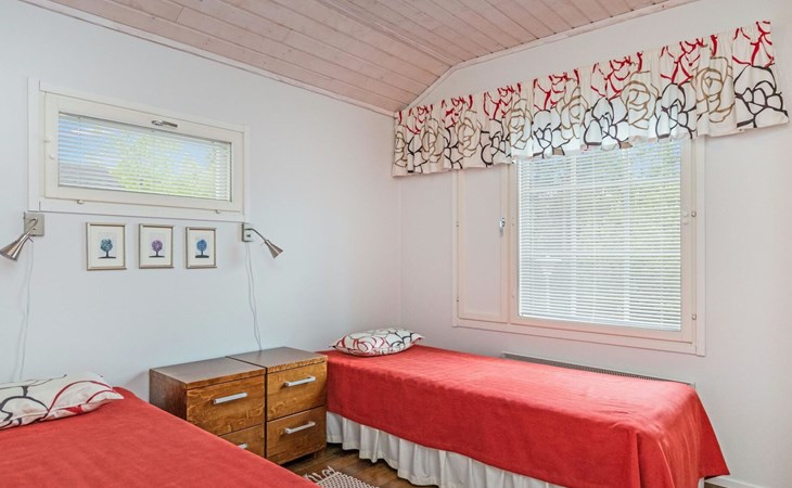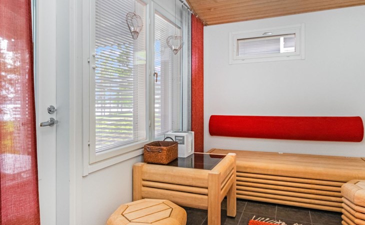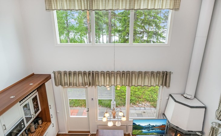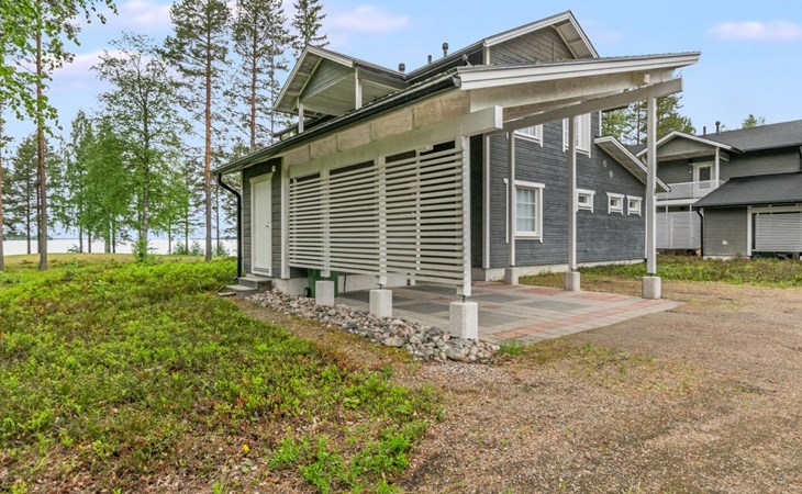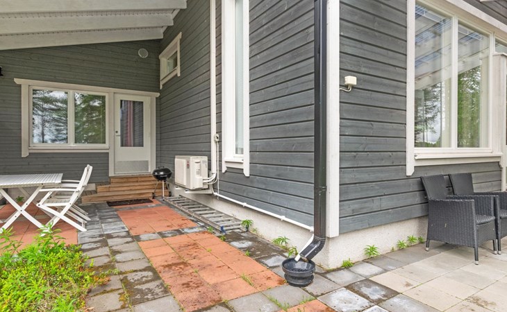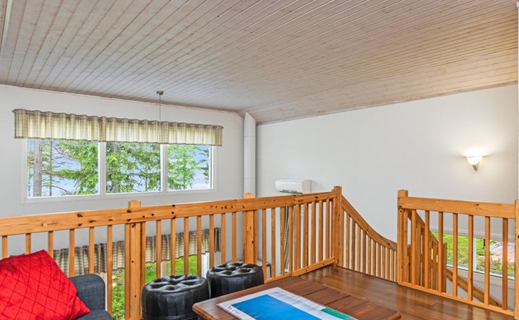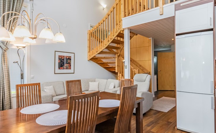 A two storey wooden house, built in 2010. Lowest floor: kitchen, bedroom with double bed (140cm wide), sauna (electric stove), bathroom with 2 showers, dressing room, toilet, terrace. Upstairs: bedroom with 2 beds, bedroom with a bed (120 cm wide), loft with a sofa bed, toilet, balcony.