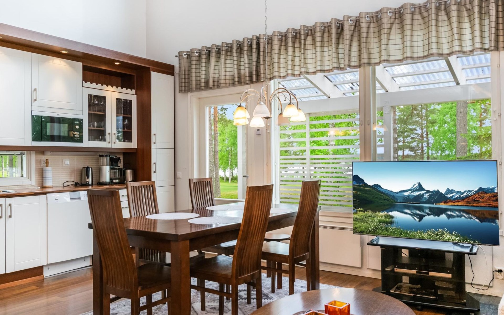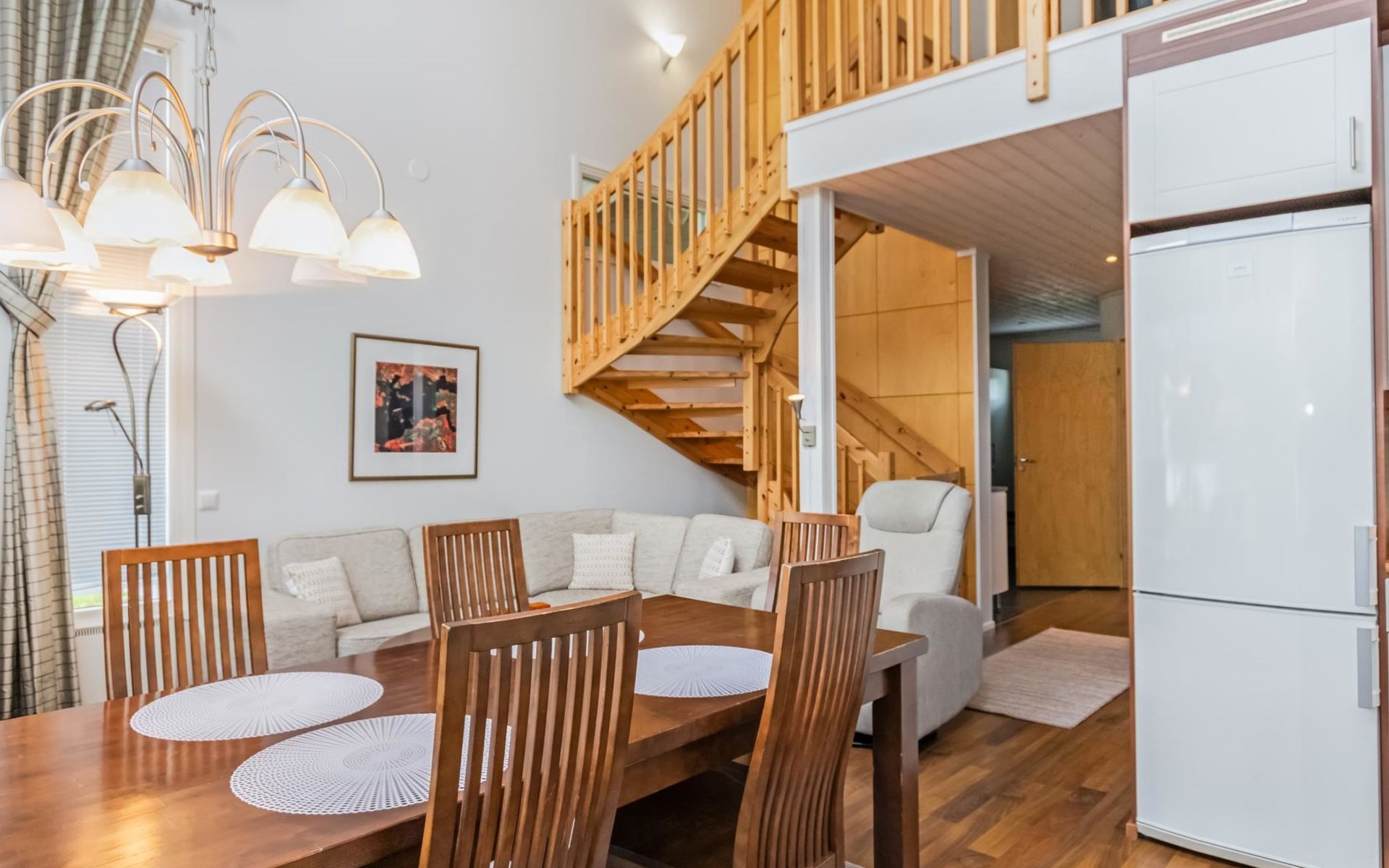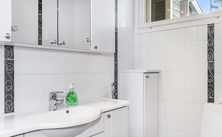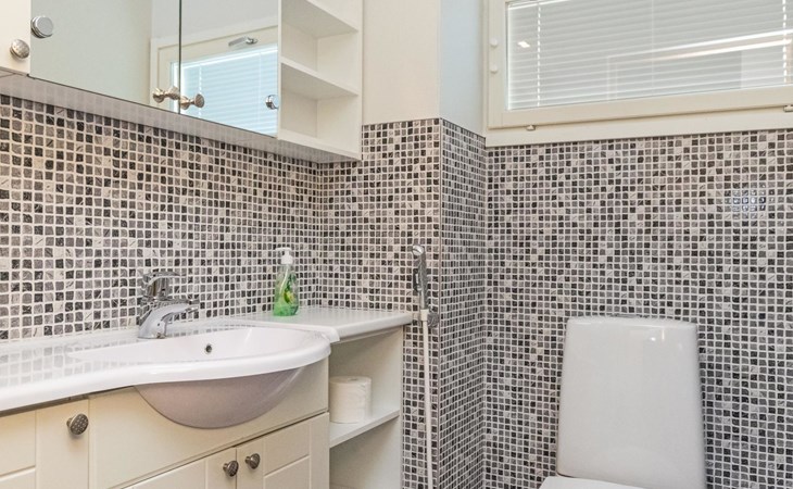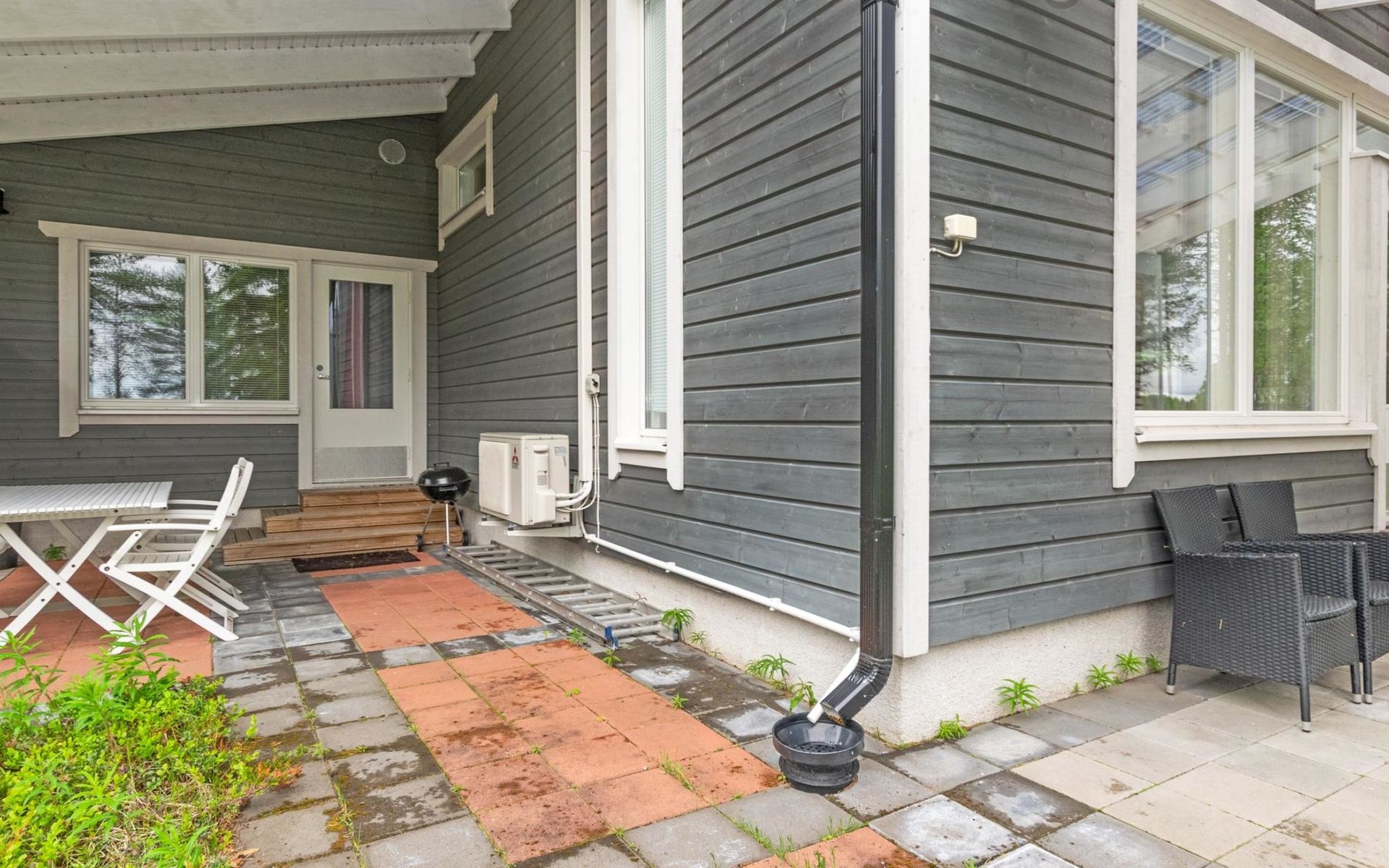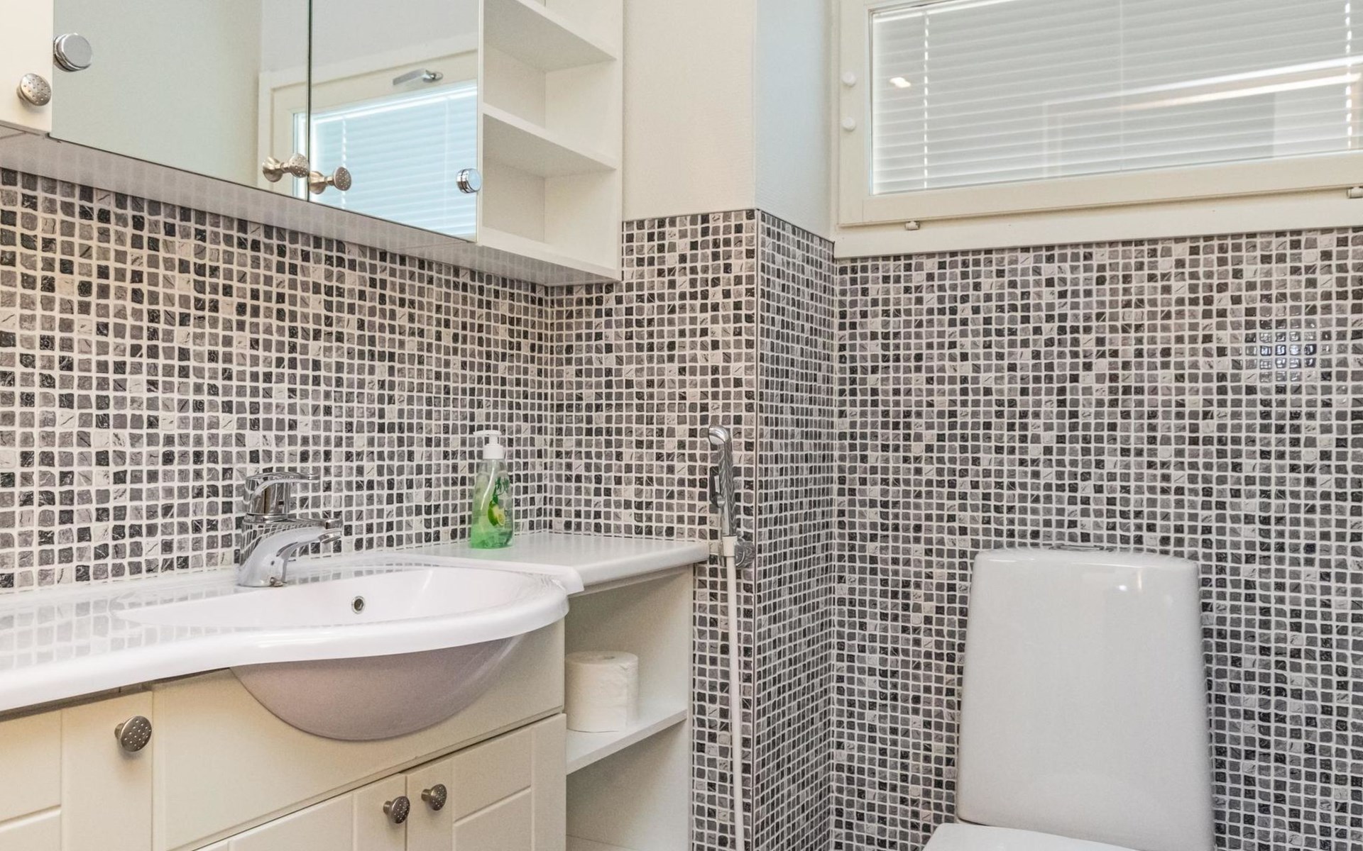 A two storey wooden house, built in 2010. Lowest floor: kitchen, bedroom with double bed (140cm wide), sauna (electric stove), bathroom with 2 showers, dressing room, toilet, terrace. Upstairs: bedroom with 2 beds, bedroom with a bed (120 cm wide), loft with a sofa bed, toilet, balcony.