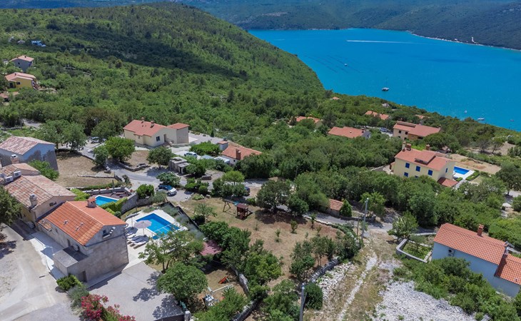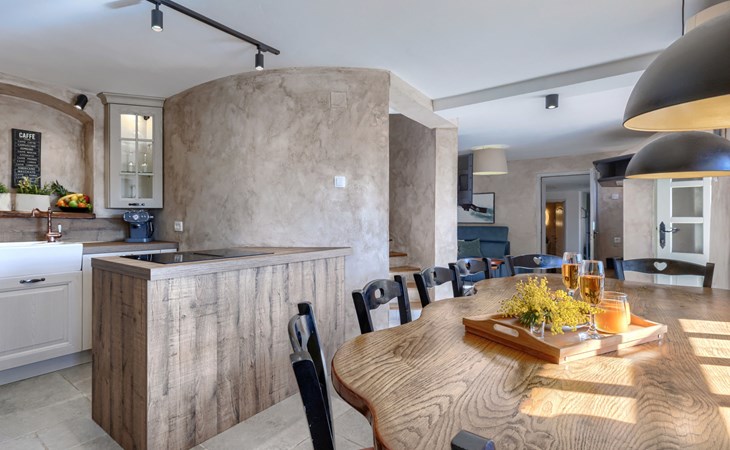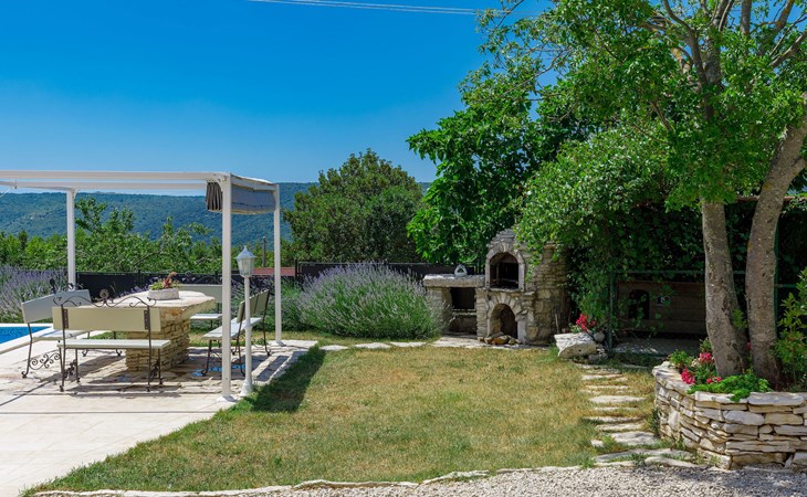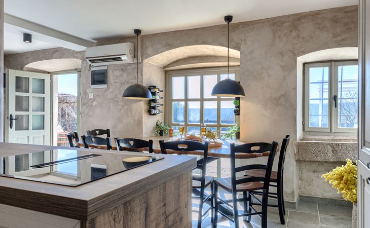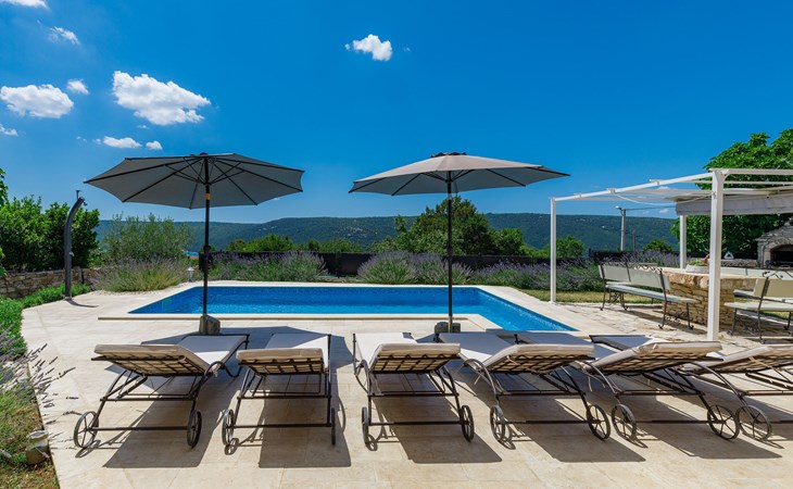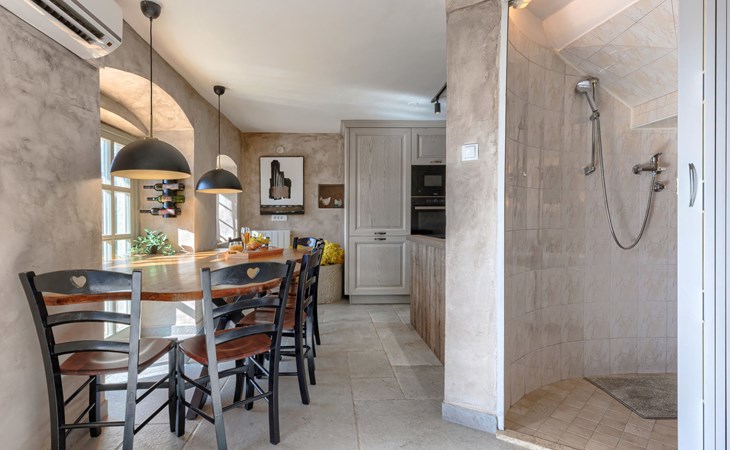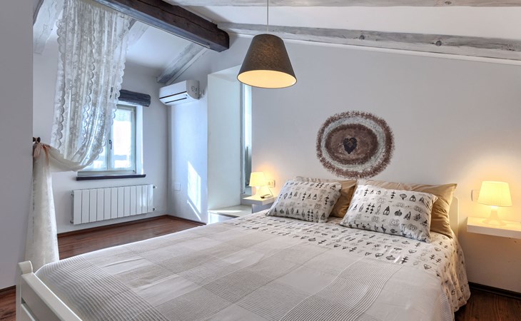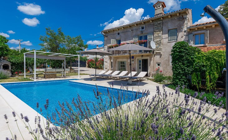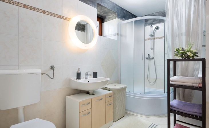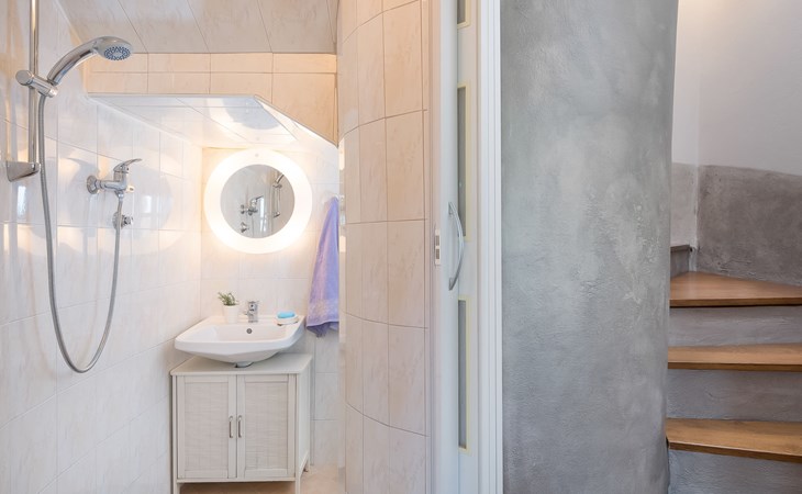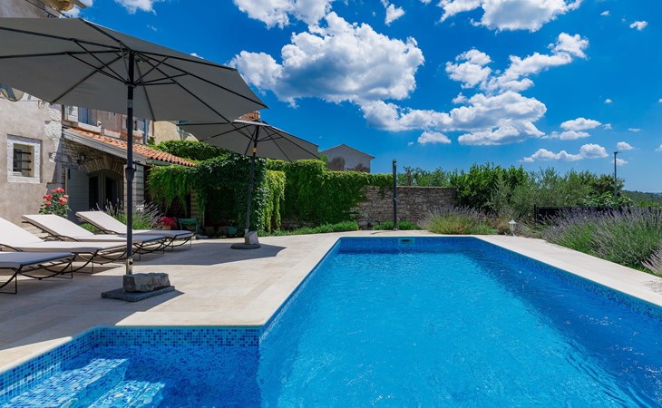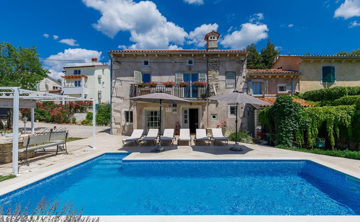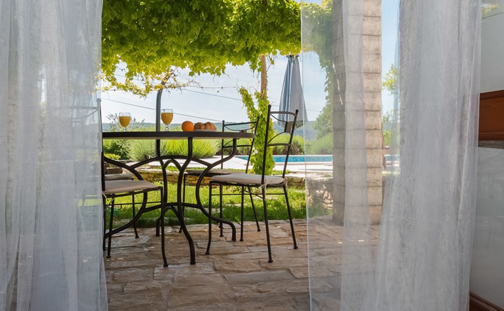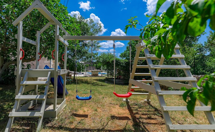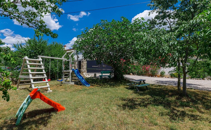 Semi-detached house "Villa Domenica", 2 storeys, from the 18th century, renovated. 1.1 km from the centre of Trget, outside the resort, in a quiet, sunny, elevated position, 900 m from the sea, 900 m from the beach, in a cul-de-sac. Private: property 700 m2, garden with wildlife garden, swimming pool angular (8 x 3 m, depth 140 cm, seasonal availability: 11.Apr. - 24.Oct.) with internal staircase. Outdoor shower, terrace (10 m2), garden furniture, barbecue, children's playground (swing). In the house: internet access, washing machine. Parking (for 3 cars) at the house on the premises. Shop 1.1 km, restaurant 600 m, bus stop 6.6 km, pebble beach 900 m. Available: box for dogs (included in the price).