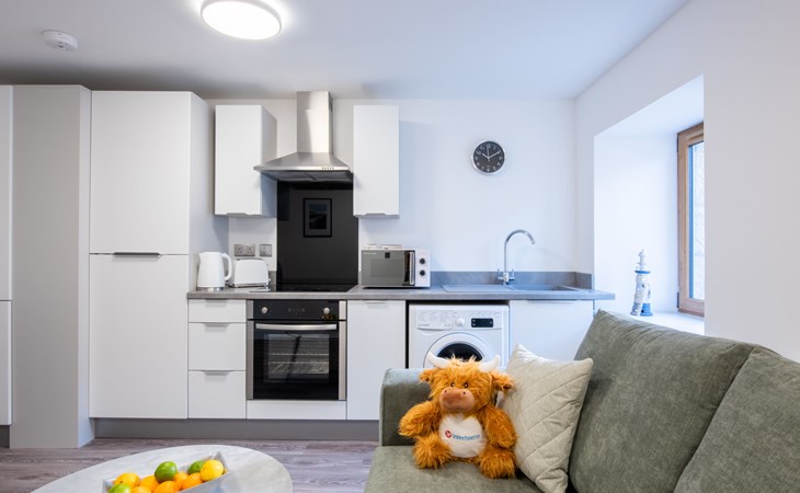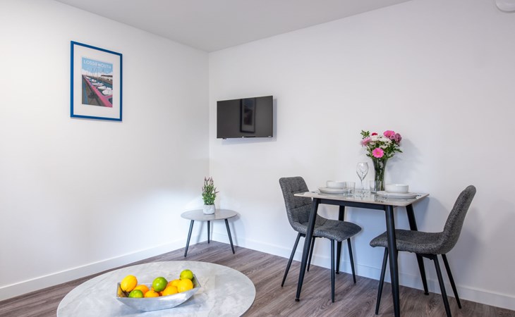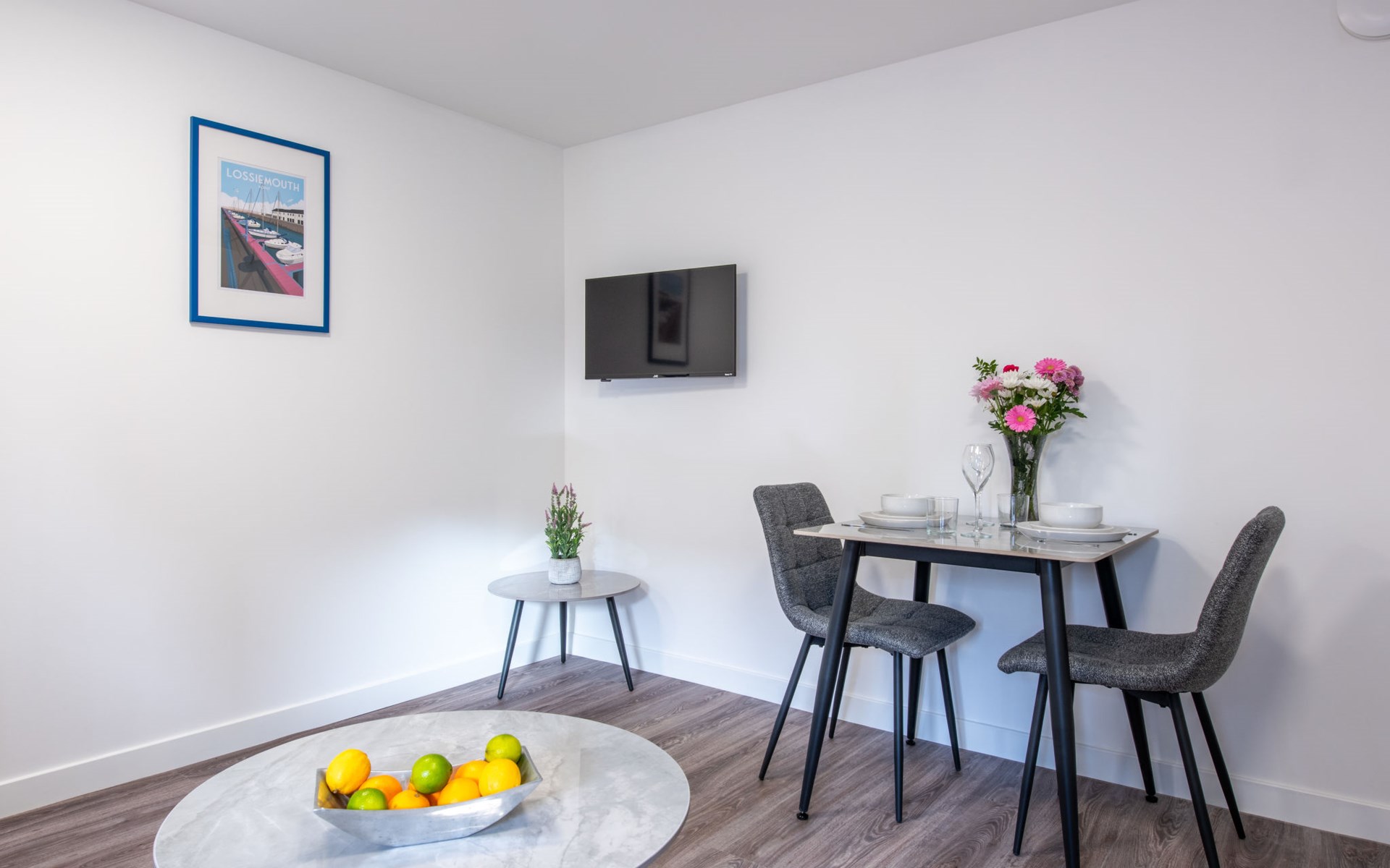 Apartment block "Harbour Nights 7A", 2 storeys, semi-detached, renovated in 2023. 7 apartments in the residence. In the centre of Lossiemouth, in a quiet position in the residential district, excellent location: right in the centre but still quiet, 80 m from the sea, 450 m from the beach. Parking at the house. Shop, grocery 300 m, supermarket 180 m, restaurant, bar 90 m, bus stop "James Square" 270 m, railway station "Elgin" 10 km, sandy beach "Lossiemouth Beach" 350 m. Marina 90 m, golf course (18 hole) 100 m, tennis 50 m. Please note: Additional accommodations can be booked.