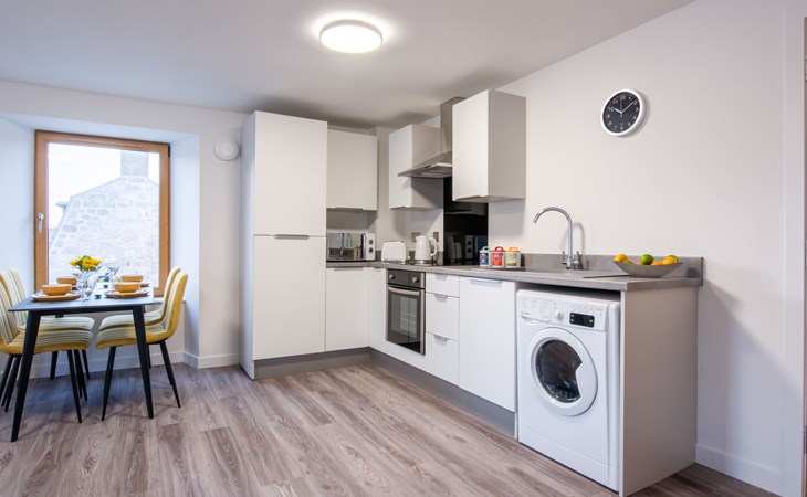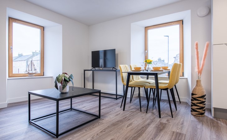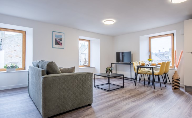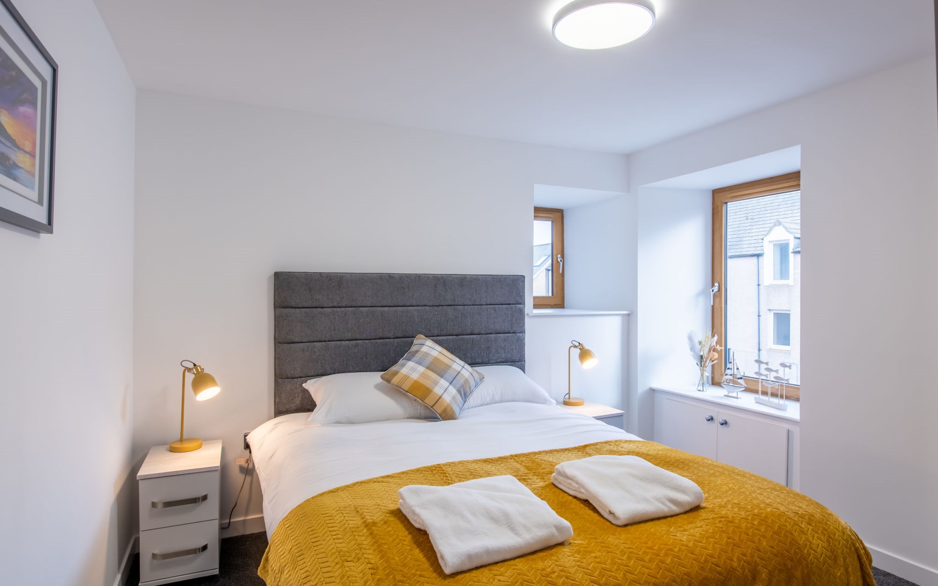 Apartment block "Harbour Nights 7C", 2 storeys, semi-detached, renovated in 2023. 7 apartments in the residence. In the centre of Lossiemouth, in a quiet position in the residential district, excellent location: right in the centre but still quiet, 80 m from the sea, 450 m from the beach. Parking at the house. Shop, grocery 300 m, supermarket 180 m, restaurant, bar 90 m, bus stop "James Square" 270 m, railway station "Elgin" 10 km, sandy beach "Lossiemouth Beach" 350 m. Marina 90 m, golf course (18 hole) 100 m, tennis 50 m. Please note: Additional accommodations can be booked.
