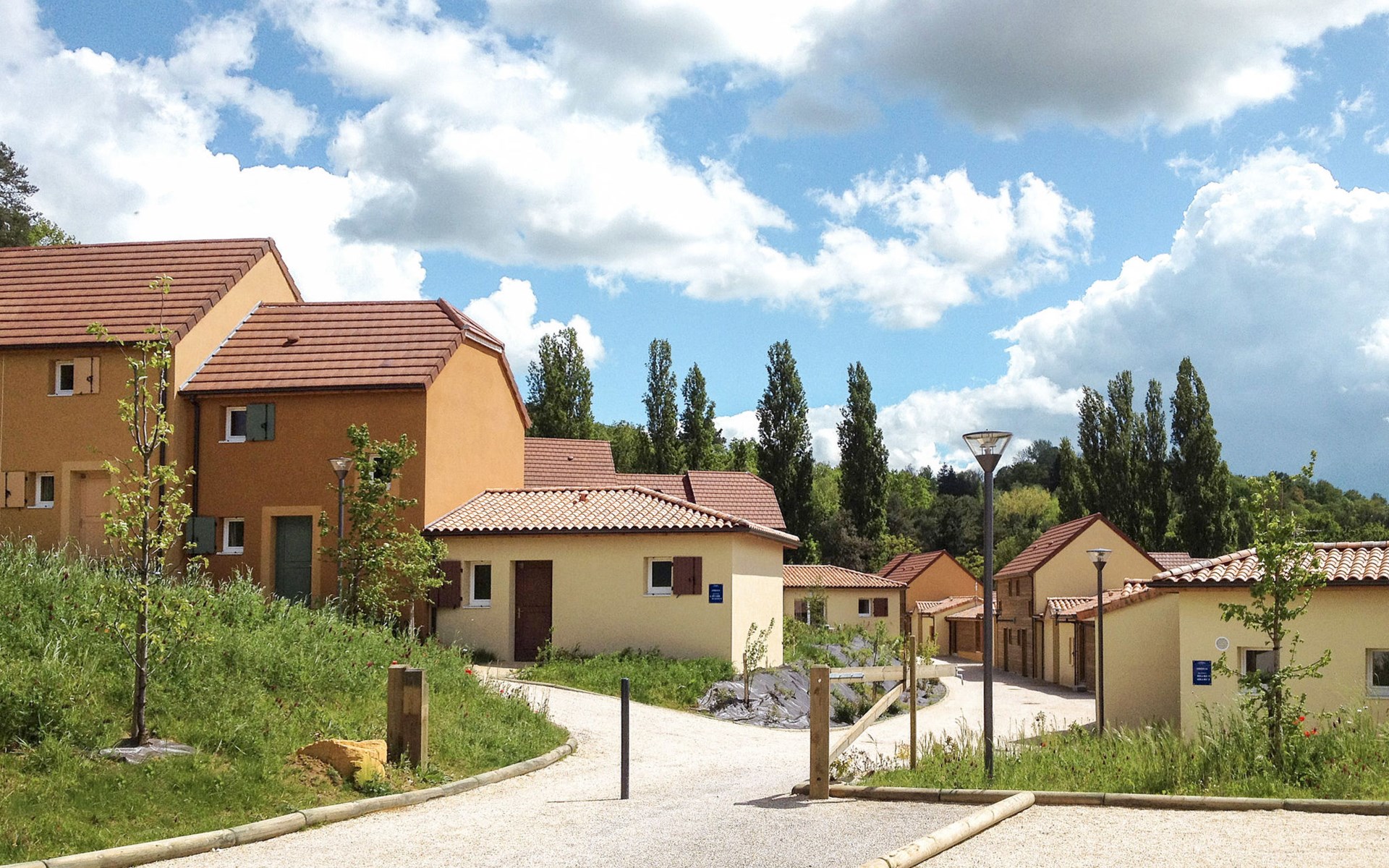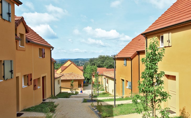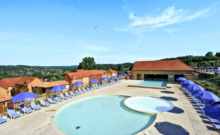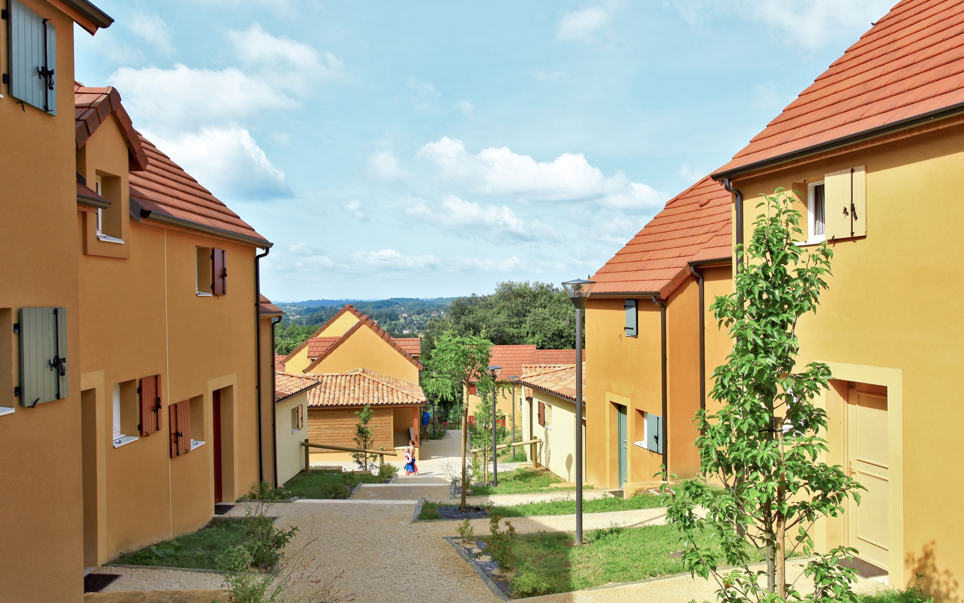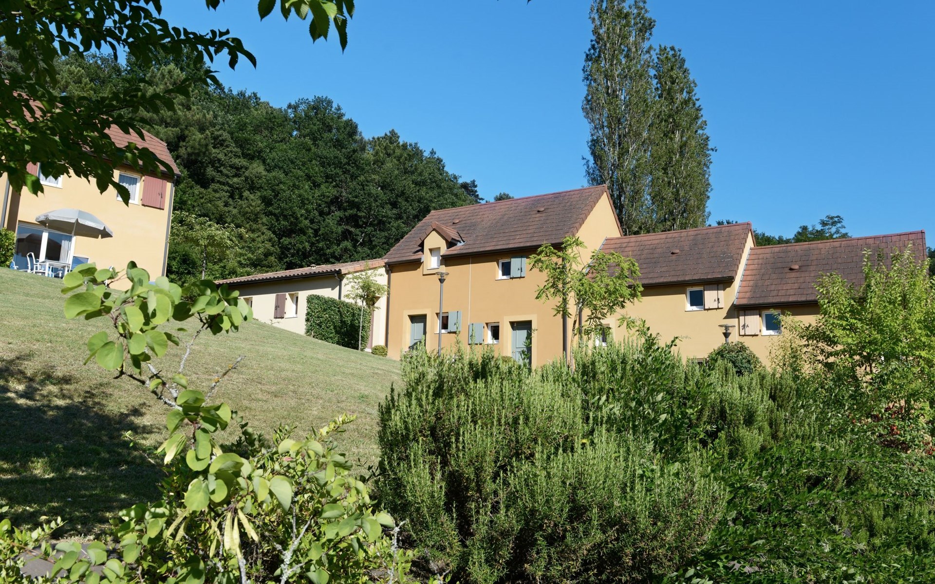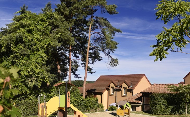 Child friendly resort "Les Coteaux de Sarlat". 100 houses in the residence. 2.5 km from the centre of Sarlat-la-Caneda, on the outskirts, 50 km from the centre of Brive, on a slope. For shared use: property 30'000 m2 (fenced) with lawn and trees, swimming pool heated (17 x 7 m, depth 100 - 140 cm, seasonal availability: 01.May. - 30.Sep.). Children's pool, table tennis, basketball, boccia, children's playground. In the complex: reception, sauna (extra). Fitness room, steam room (extra). Washing machine, tumble dryer (for shared use, extra). Bread roll service. Parking on the premises. Shop 1.7 km. Minigolf 100 m. Please note: Loading and unloading of baggage is possible at the holiday house. The photograph shows a typical example. The holiday properties may differ in living space, floorplan, equipment and furnishing.