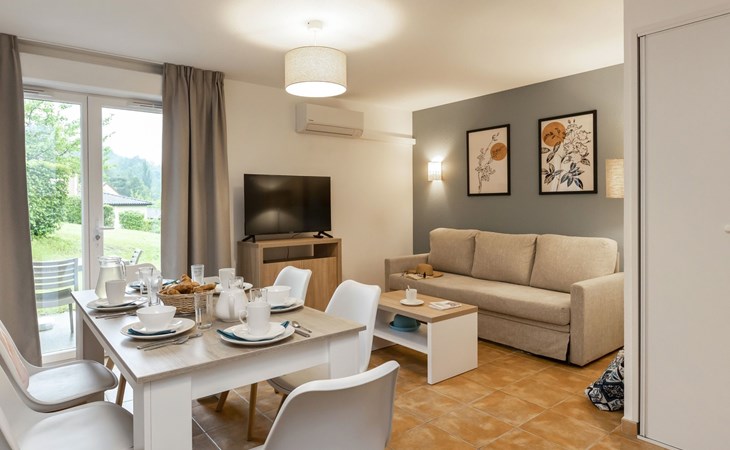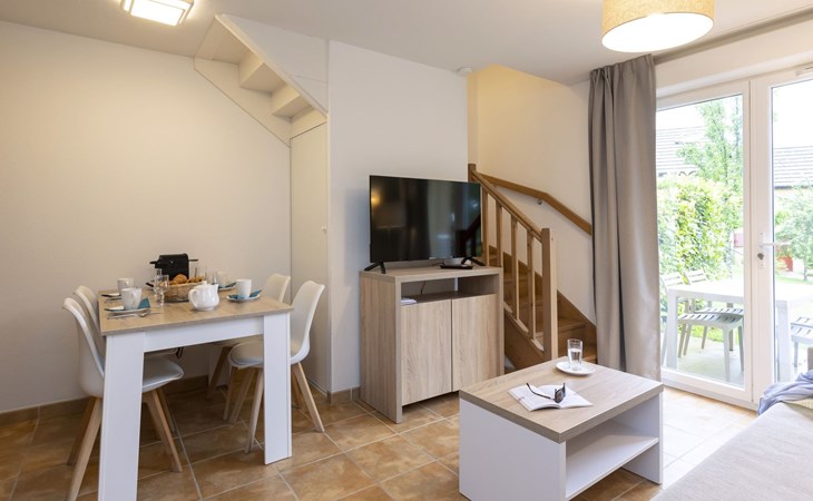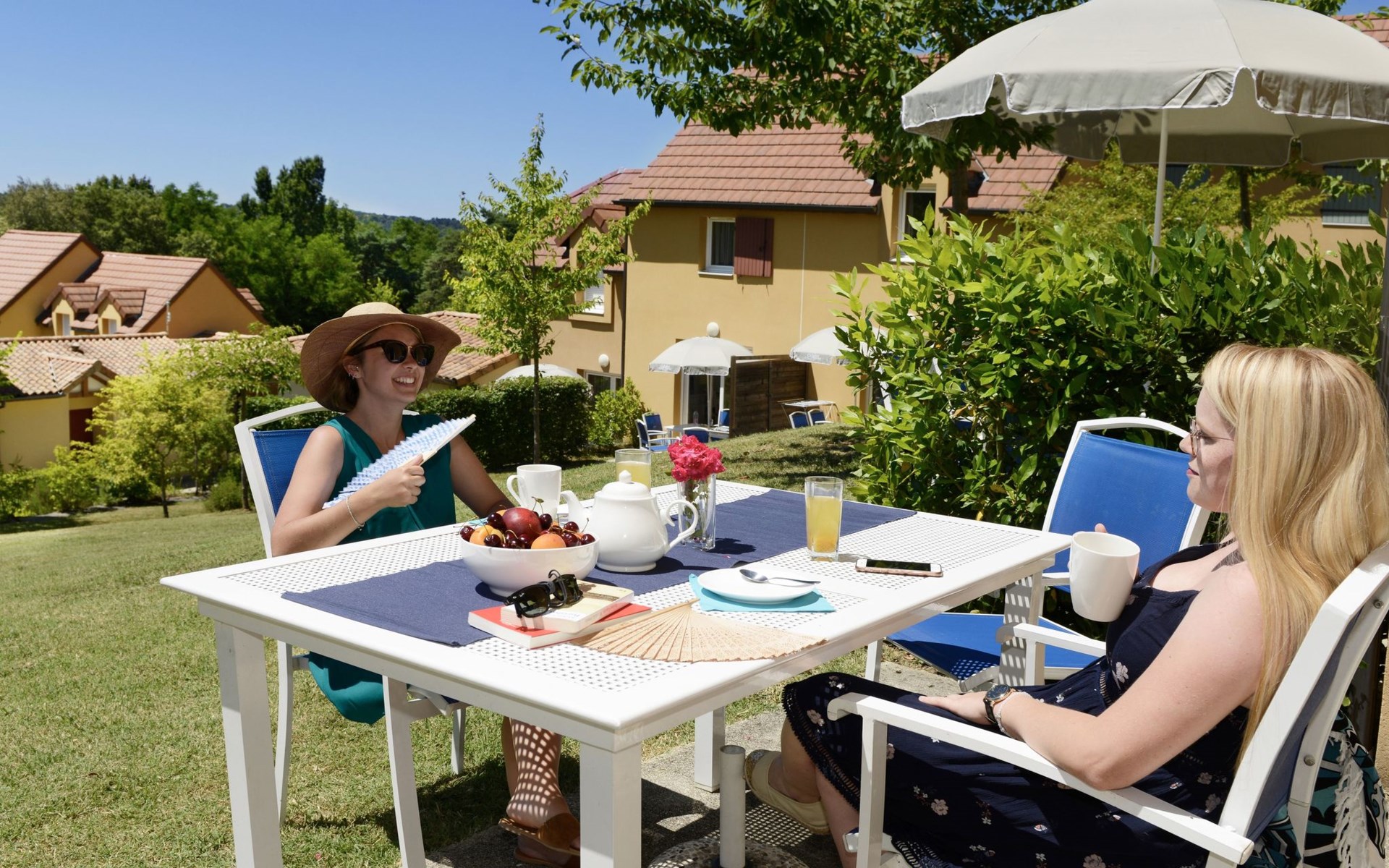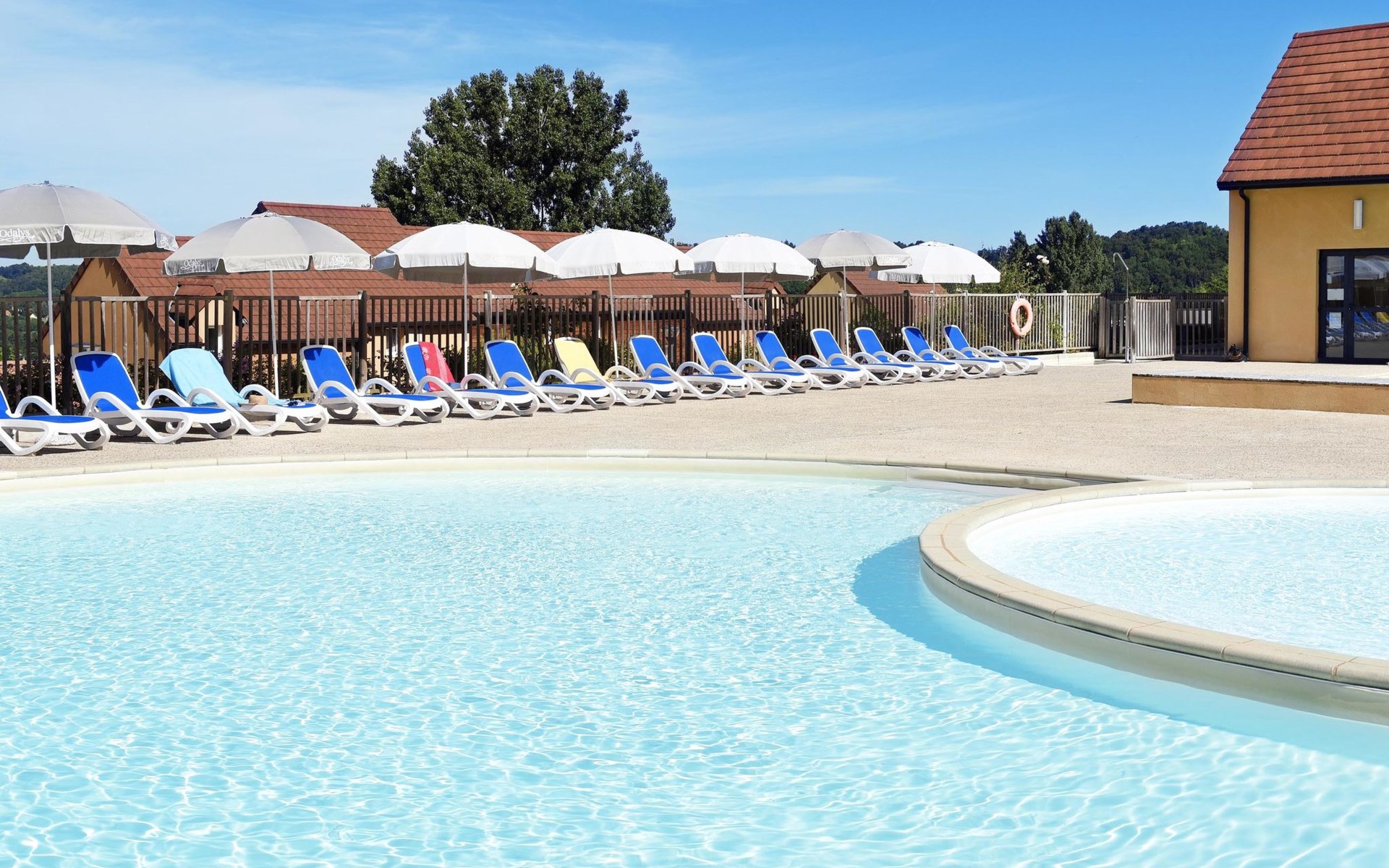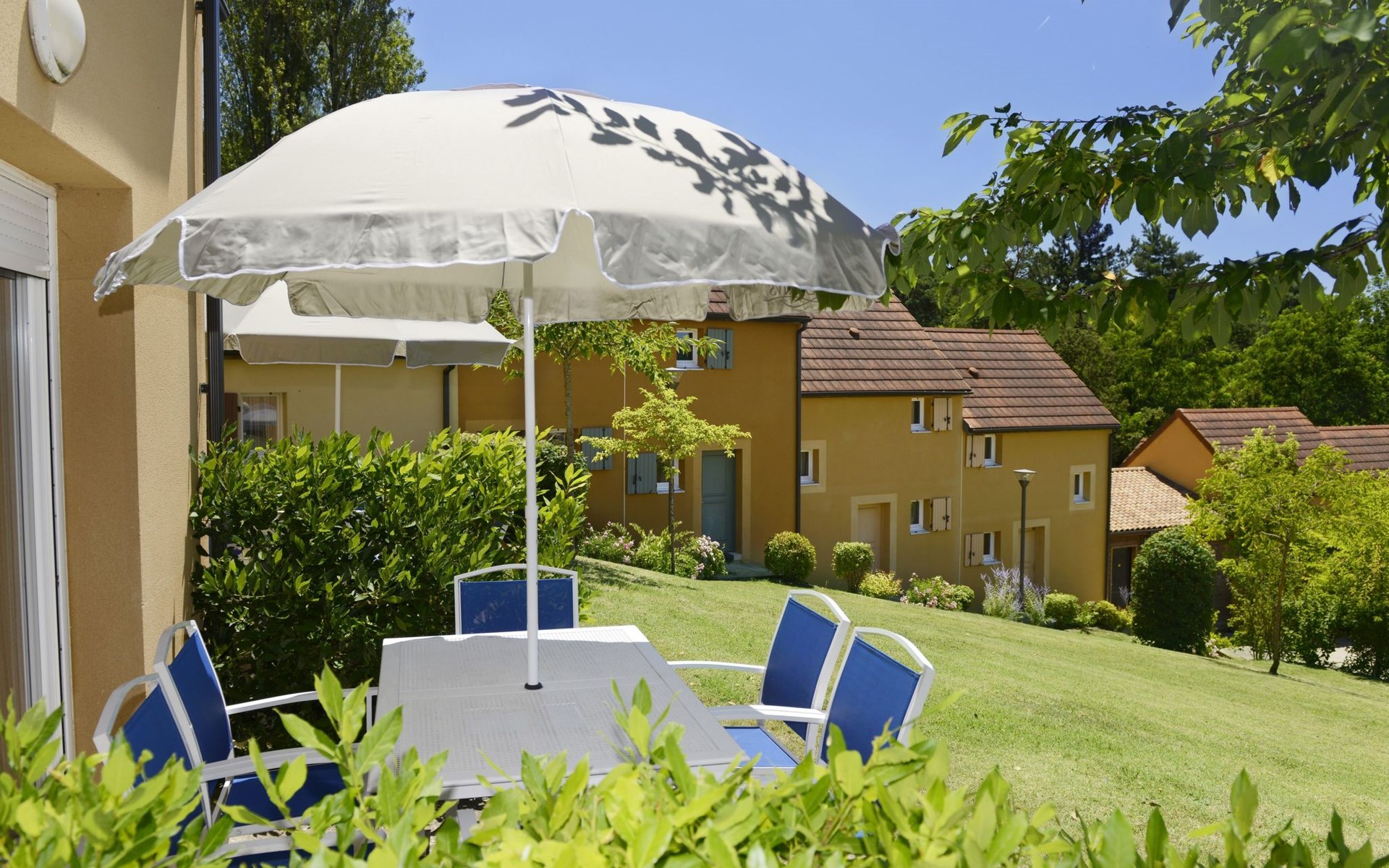 Child friendly resort "Les Coteaux de Sarlat". 100 houses in the residence. 2.5 km from the centre of Sarlat-la-Caneda, on the outskirts, 50 km from the centre of Brive, on a slope. For shared use: property 30'000 m2 (fenced) with lawn and trees, swimming pool heated (17 x 7 m, depth 100 - 140 cm, seasonal availability: 01.May. - 30.Sep.). Children's pool, table tennis, basketball, boccia, children's playground. In the complex: reception, sauna (extra). Fitness room, steam room (extra). Washing machine, tumble dryer (for shared use, extra). Bread roll service. Parking on the premises. Shop 1.7 km. Minigolf 100 m. Please note: Loading and unloading of baggage is possible at the holiday house. The photograph shows a typical example. The holiday properties may differ in living space, floorplan, equipment and furnishing.