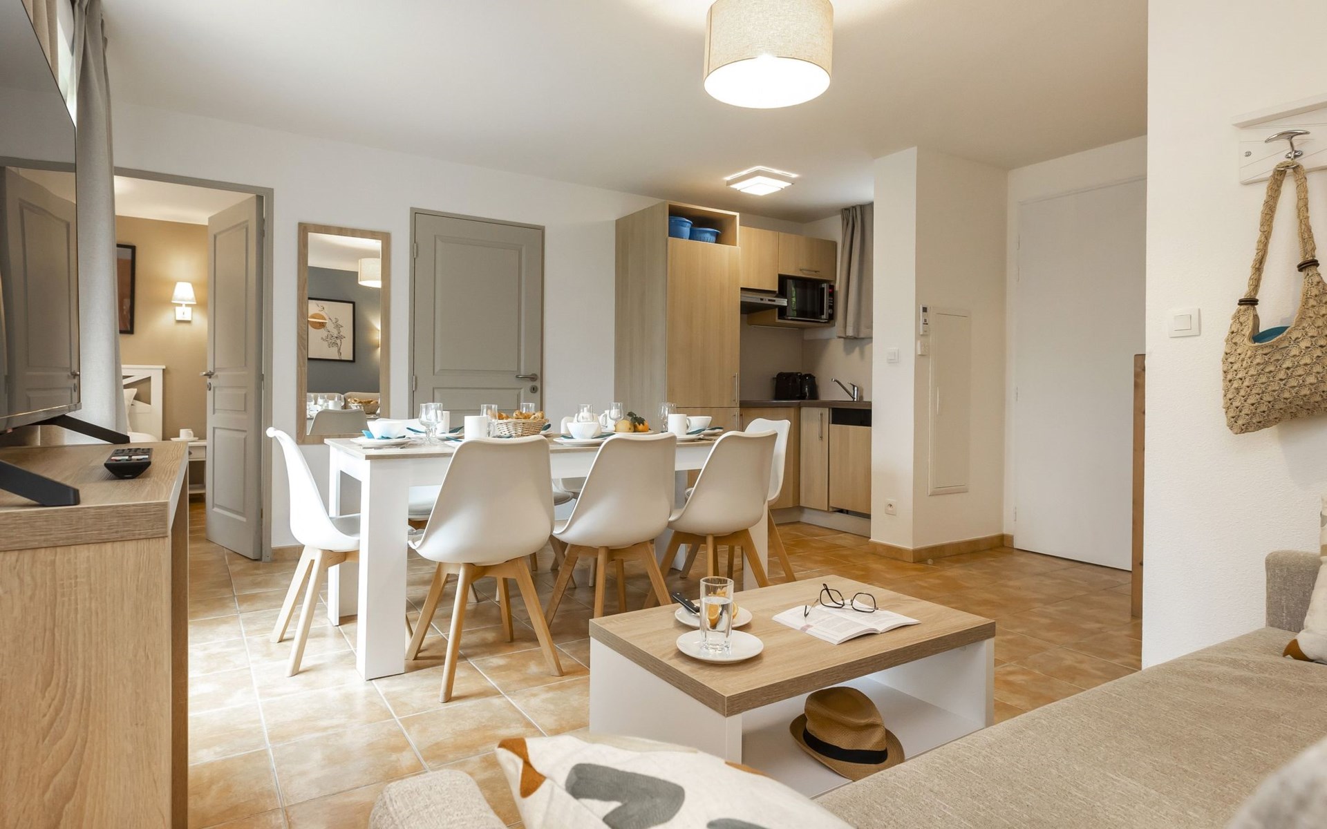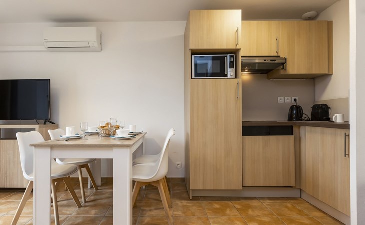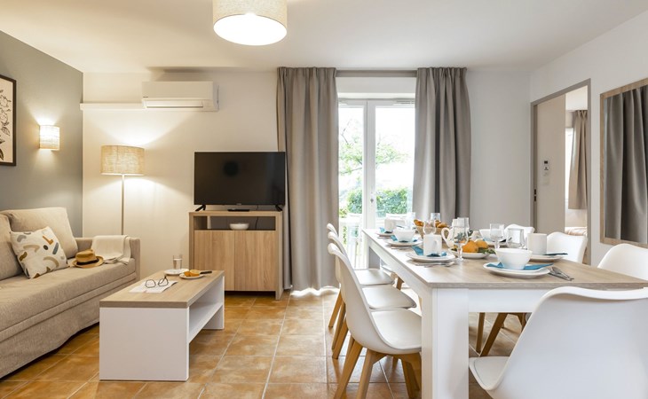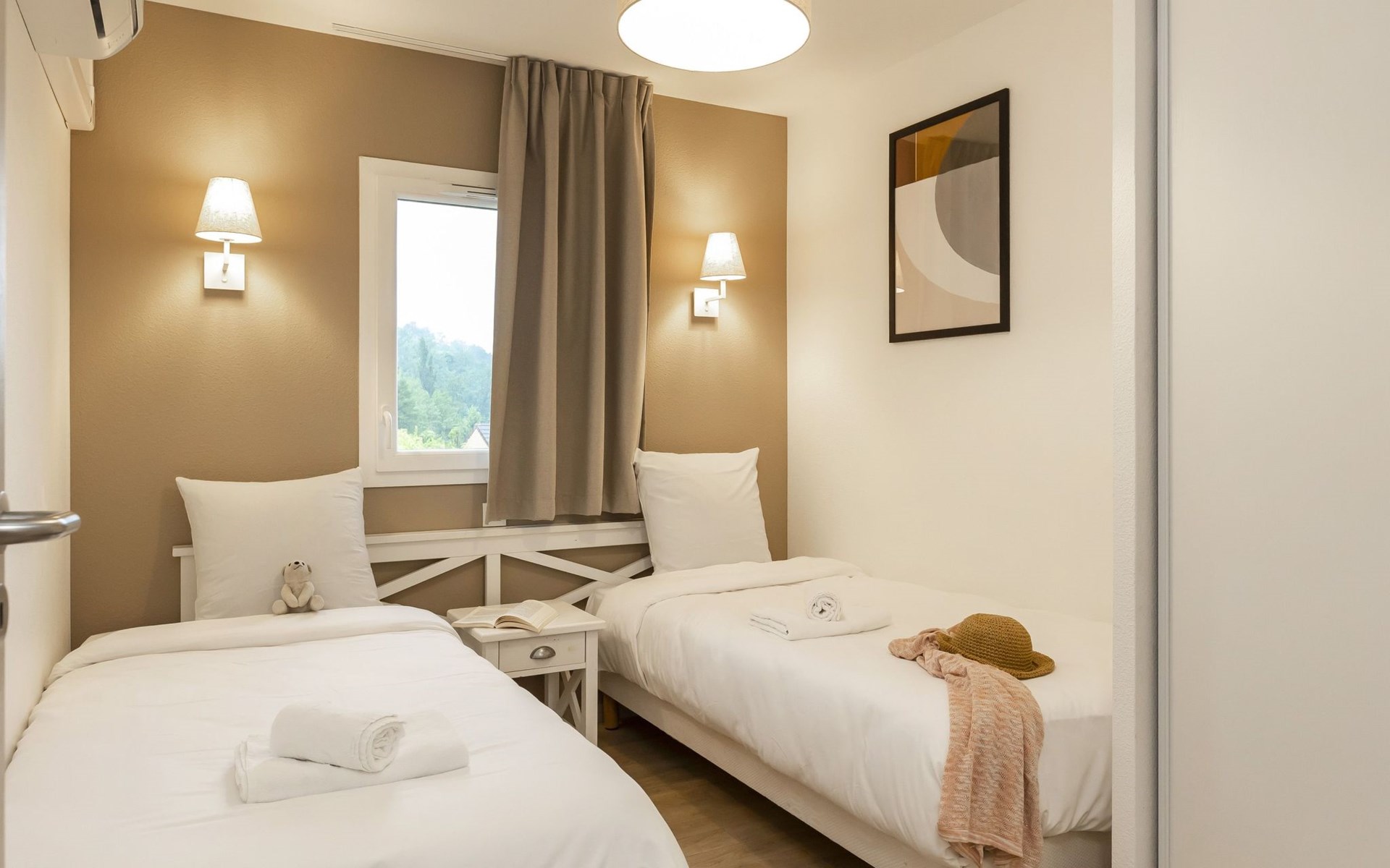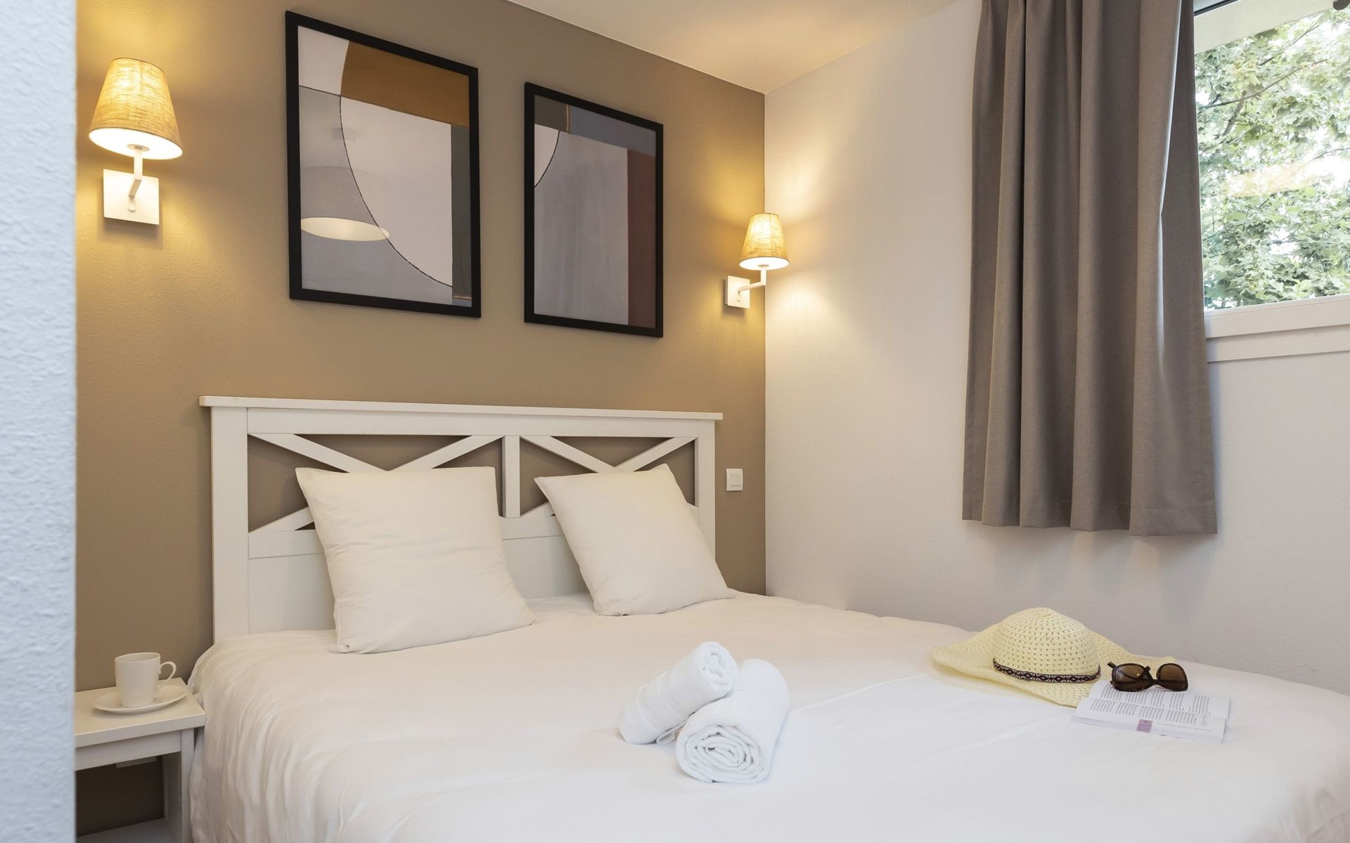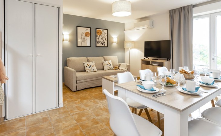 Child friendly resort "Les Coteaux de Sarlat". 100 houses in the residence. 2.5 km from the centre of Sarlat-la-Caneda, on the outskirts, 50 km from the centre of Brive, on a slope. For shared use: property 30'000 m2 (fenced) with lawn and trees, swimming pool heated (17 x 7 m, depth 100 - 140 cm, seasonal availability: 01.May. - 30.Sep.). Children's pool, table tennis, basketball, boccia, children's playground. In the complex: reception, sauna (extra). Fitness room, steam room (extra). Washing machine, tumble dryer (for shared use, extra). Bread roll service. Parking on the premises. Shop 1.7 km. Minigolf 100 m. Please note: Loading and unloading of baggage is possible at the holiday house. The photograph shows a typical example. The holiday properties may differ in living space, floorplan, equipment and furnishing.