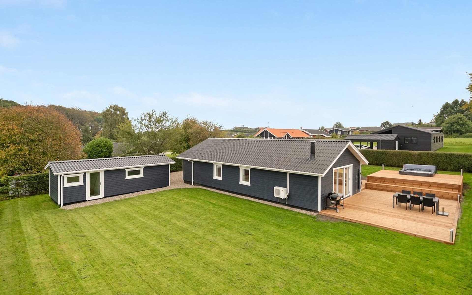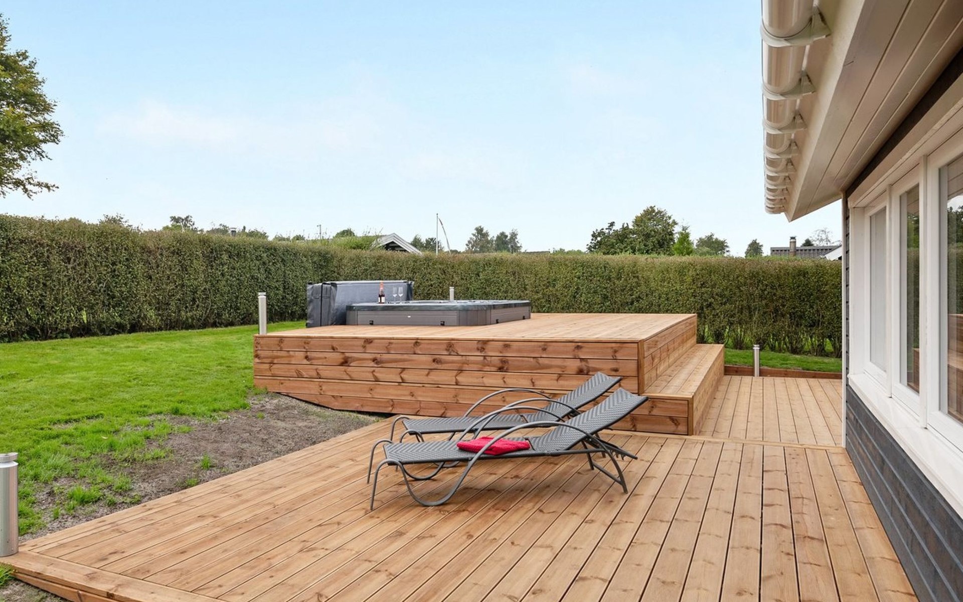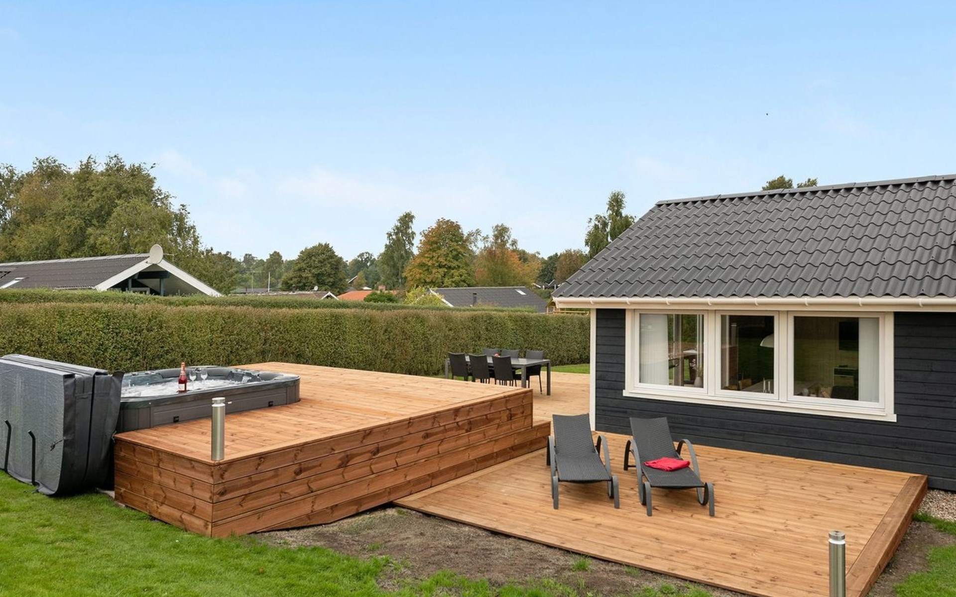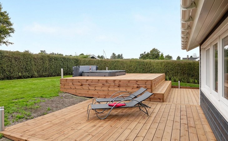 Single-family house, built in 1979. 500 m from the sea. Private: property 810 m2, well-kept garden. Outdoor shower, hot tub, terrace (70 m2), barbecue. In the house: sauna, washing machine, tumble dryer. Parking at the house. Grocery 3 km. The owner does not accept any youth groups.