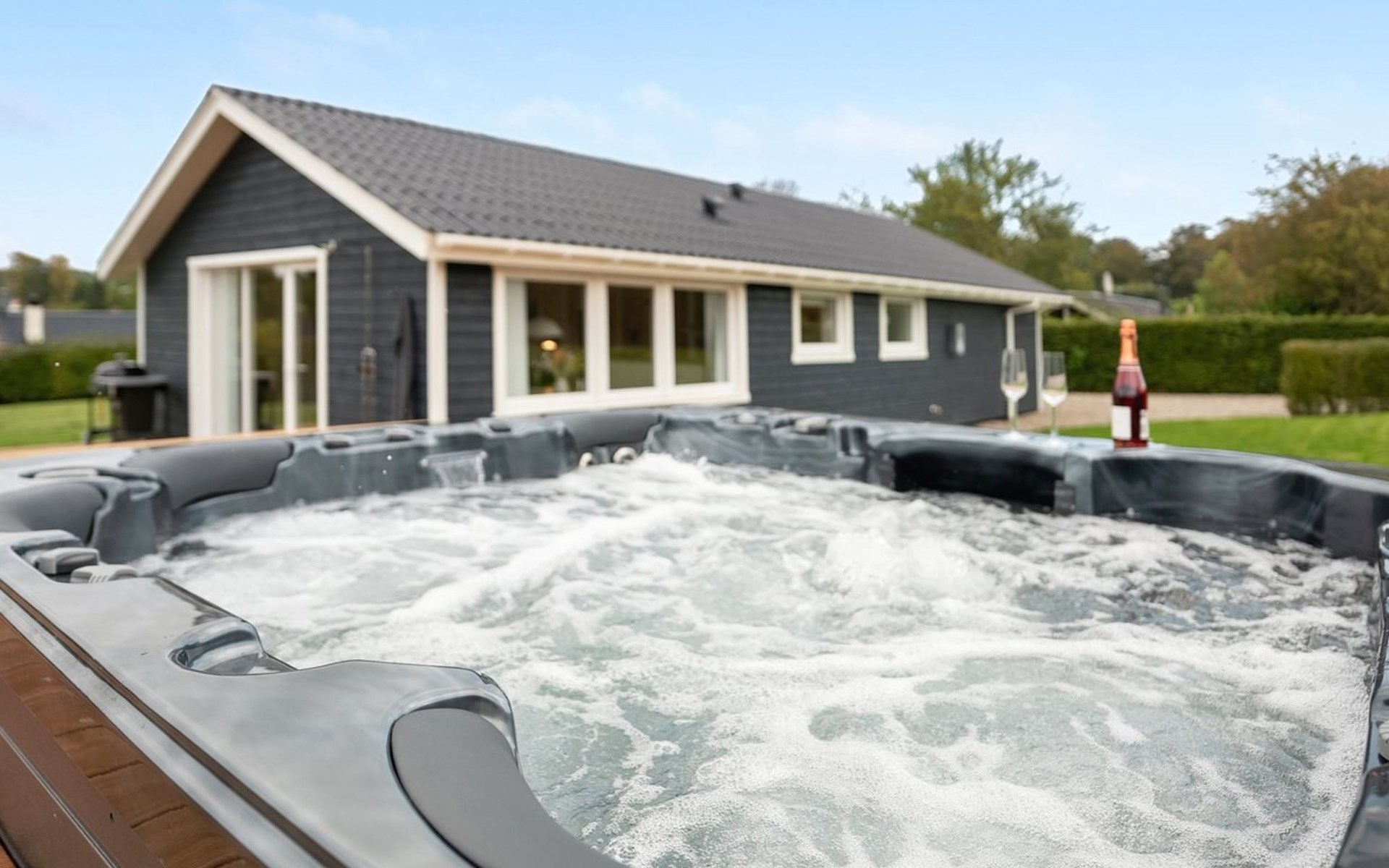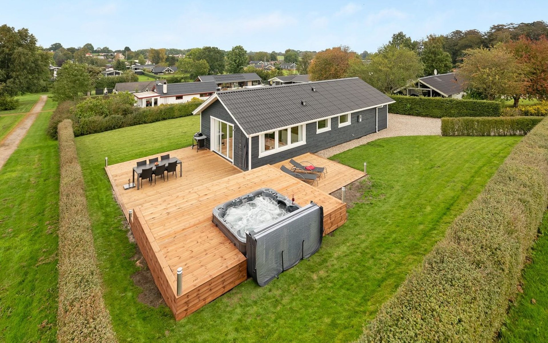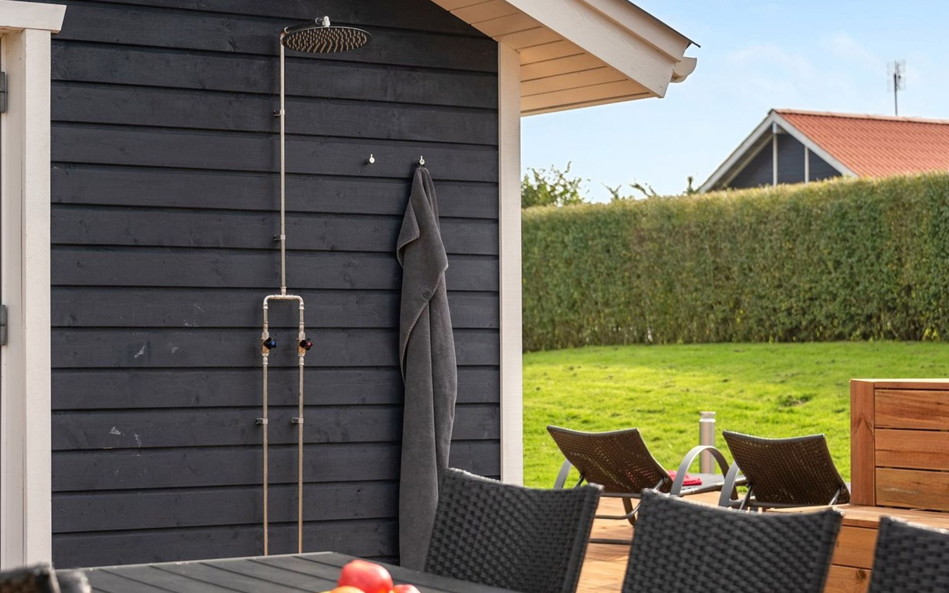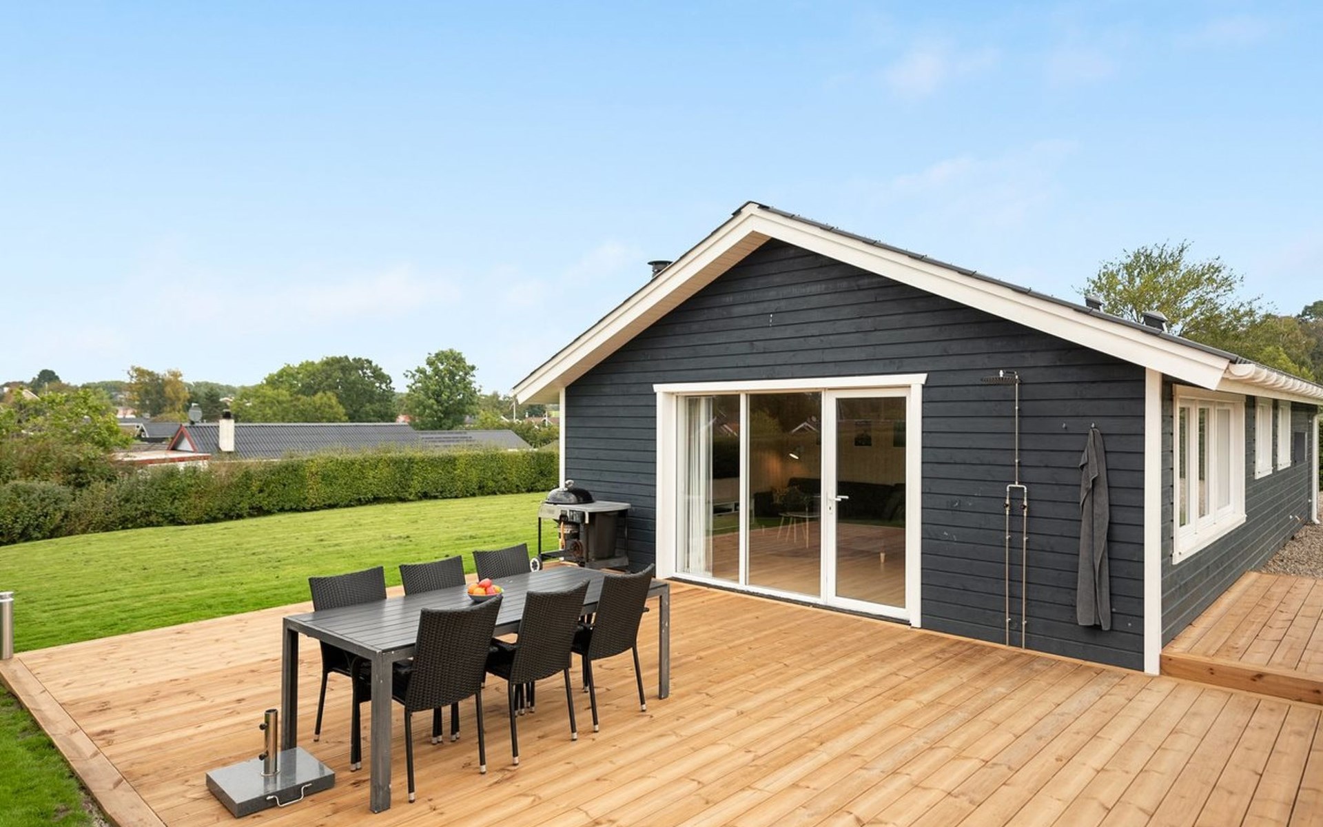 Single-family house, built in 1979. 500 m from the sea. Private: property 810 m2, well-kept garden. Outdoor shower, hot tub, terrace (70 m2), barbecue. In the house: sauna, washing machine, tumble dryer. Parking at the house. Grocery 3 km. The owner does not accept any youth groups.